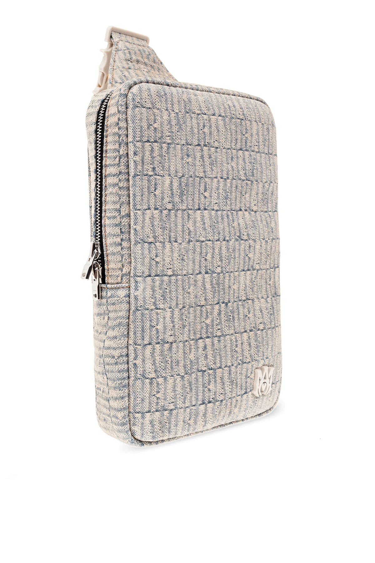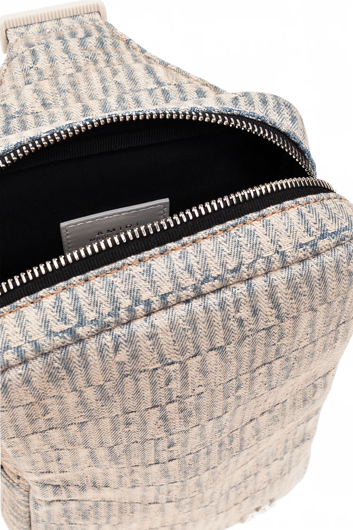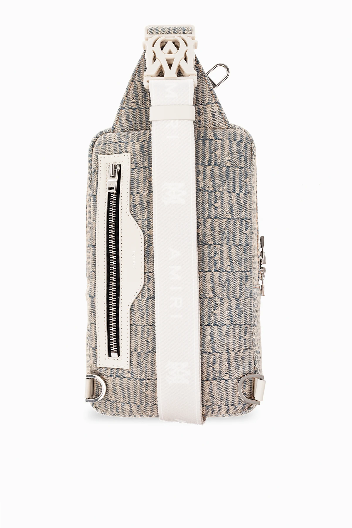 Niebiesko-kremowy, jeansowy plecak na jedno ramię Amiri. Wykończony skórą cielęcą. Zamykany na dwubiegunowy zamek. Ozdobiony żakardowym wzorem z motywem logo. Z przodu metalowa aplikacja. Z tyłu kieszeń z zamknięciem na zamek. Regulowana, odpinana szelka. Wewnątrz komora. Metalowe wykończenie w kolorze srebrnym.
