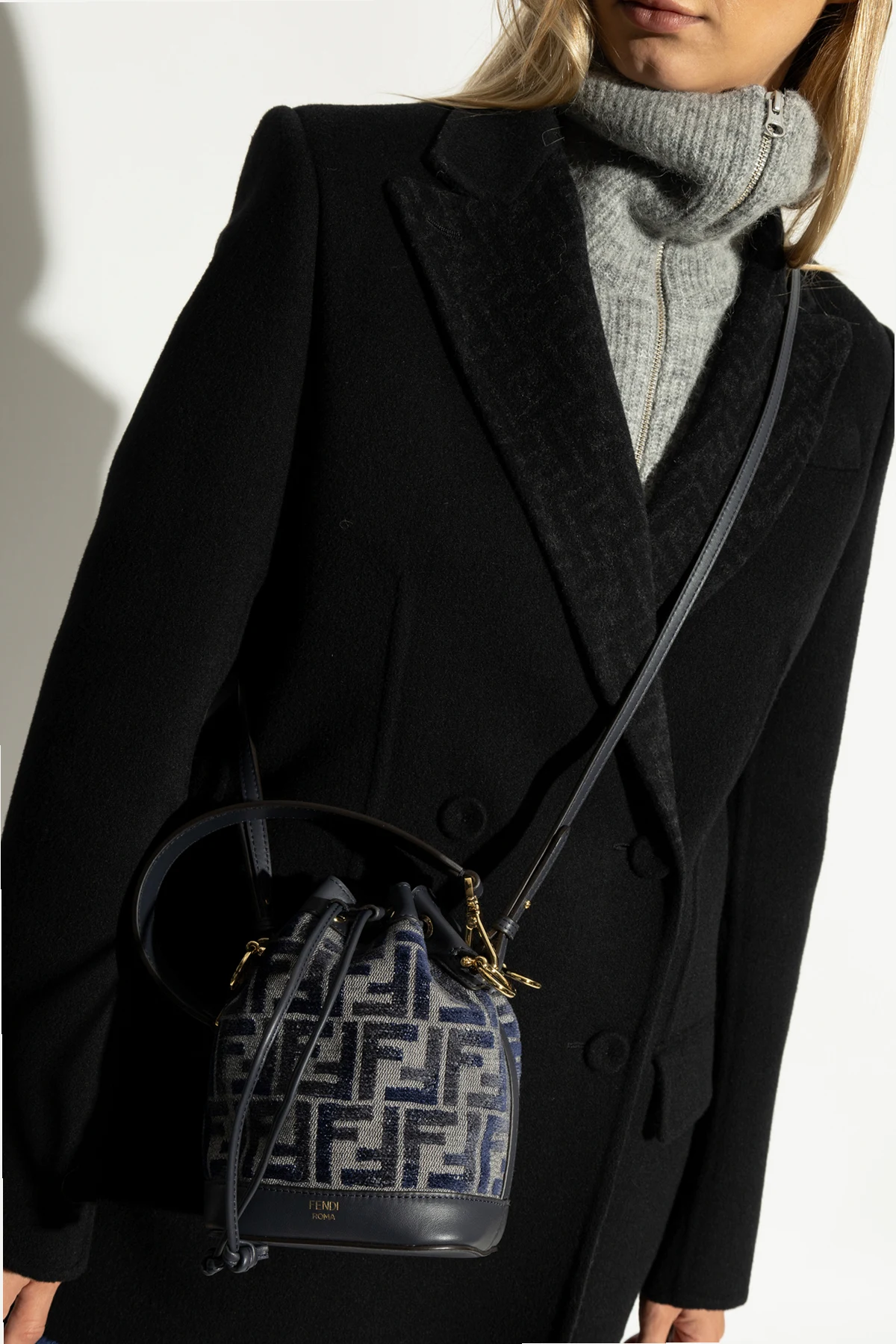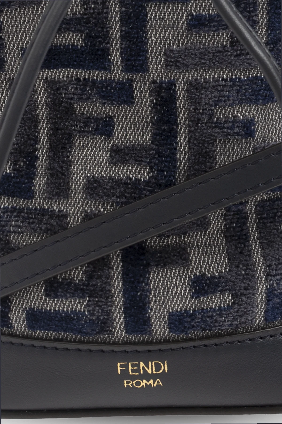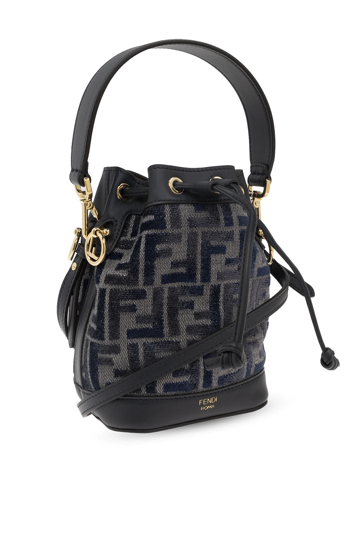 Oto ekskluzywna torba na ramię 'Mon Tresor Mini' z kolekcji Fendi, która łączy w sobie elegancję i funkcjonalność. Ten klasyczny model typu bucket , z zaokrąglonym dołem, stanowi triumf włoskiego rzemiosła. Na materiałowej powierzchni torby widnieje charakterystyczny wzór logo Fendi - litery FF w odcieniach granatu i szarości, które podkreślają jej unikatowość.