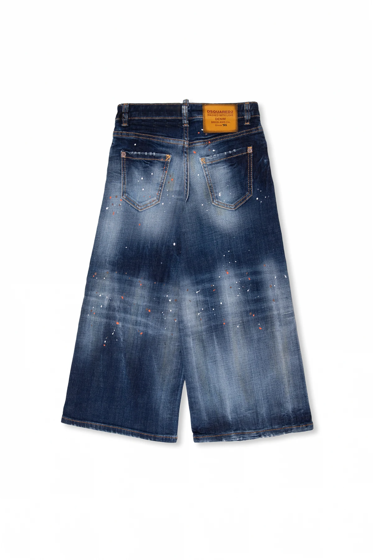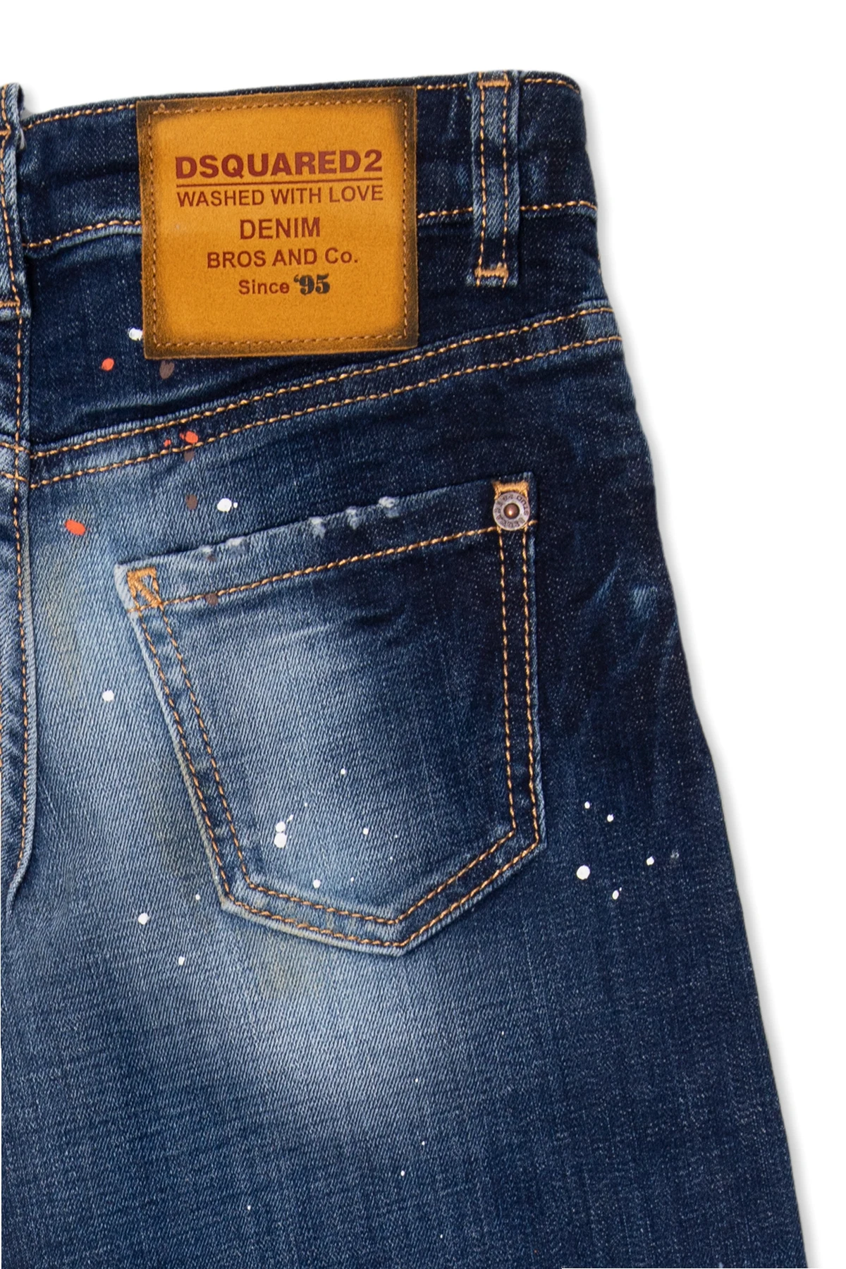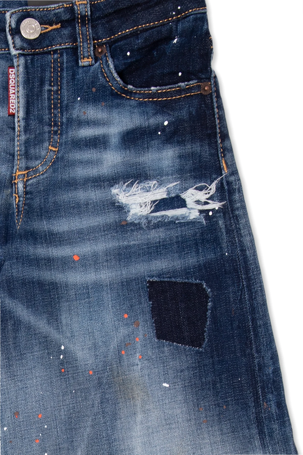 Granatowo-niebieskie jeansy, model ‘Medium Waist Page’ Dsquared2 Kids. Zapinane na guziki. Charakterystyczne przetarcia i plamy po farbie. Z przodu wszyta metka z logo. Pięć kieszeni: trzy z przodu i dwie z tyłu. Szerokie nogawki.