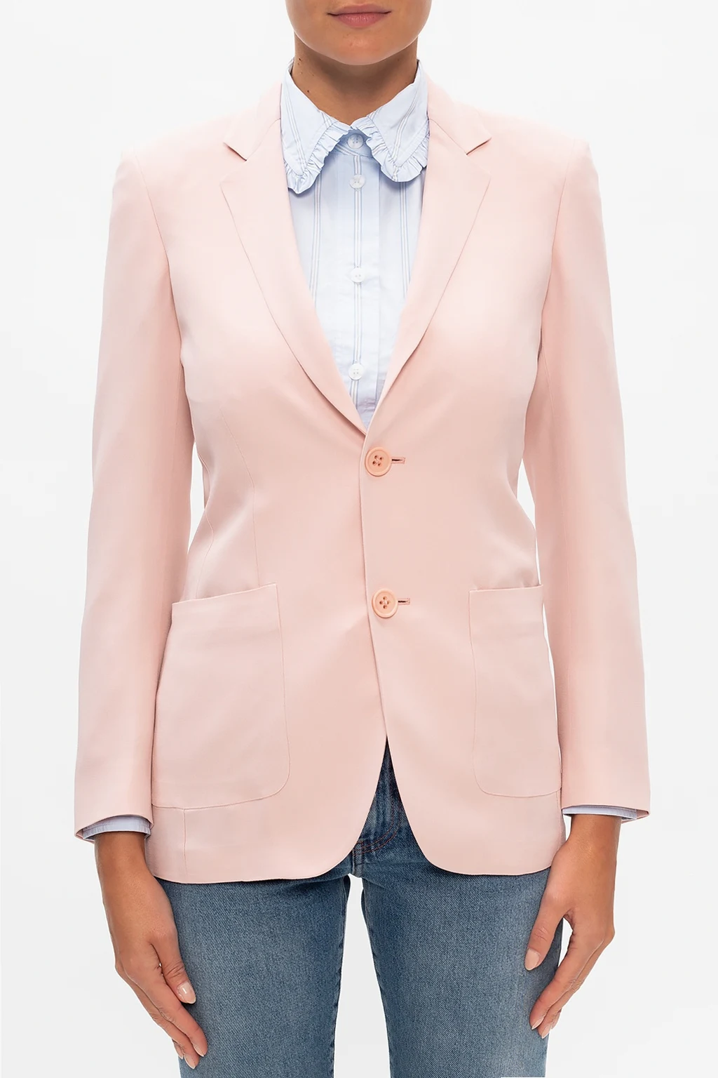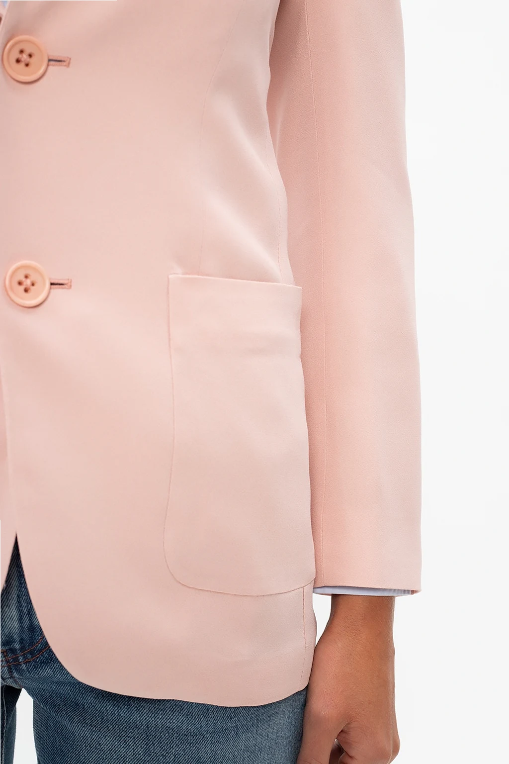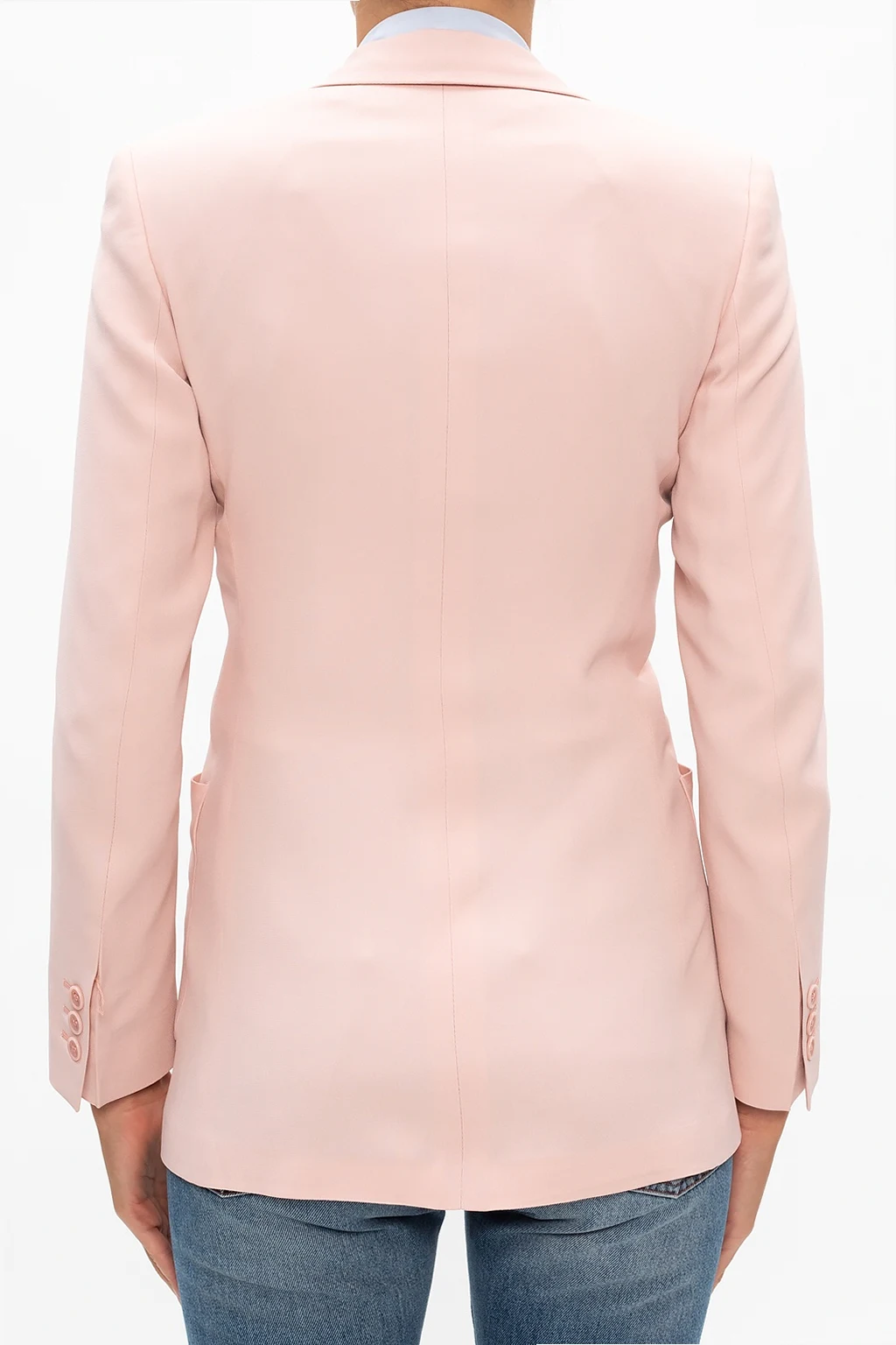 Jasnoróżowa marynarka z otwartymi klapami Red Valentino. Zapinana na guziki. Z przodu dwie wsuwane kieszenie. Długie rękawy.