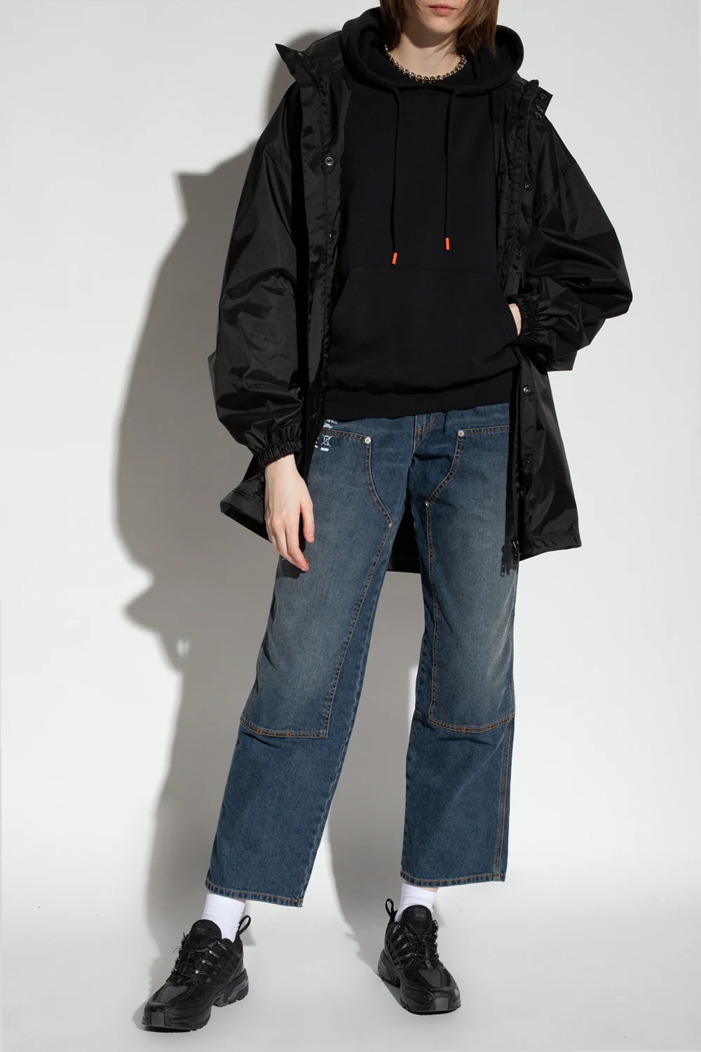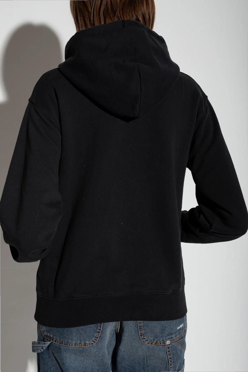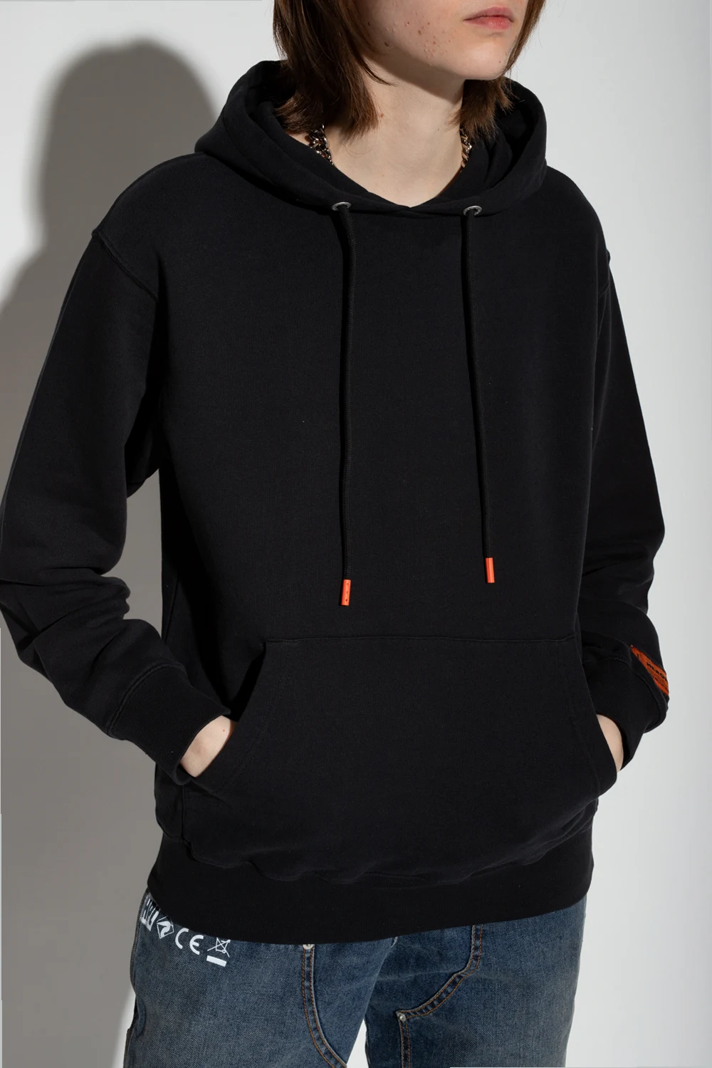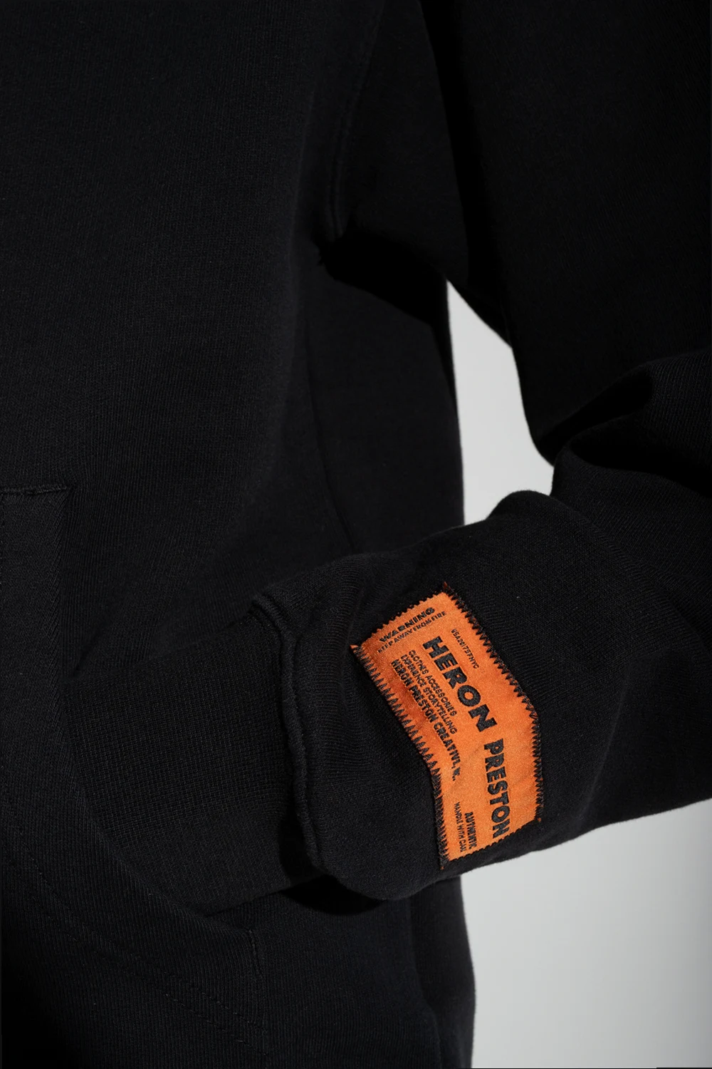 Czarna, bawełniana bluza Heron Preston. Kaptur ściągany trokami. Z przodu kieszeń. Na rękawie naszywka z logo. Długie rękawy i dół bluzy zakończone ściągaczem.