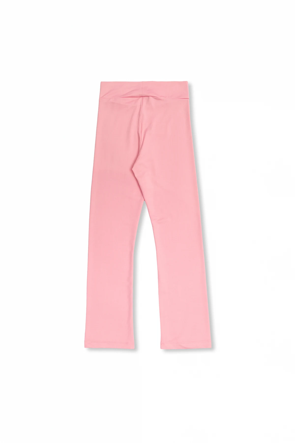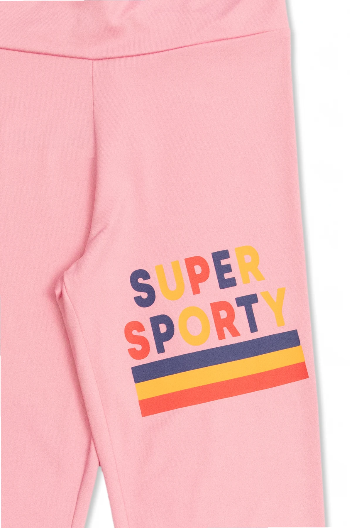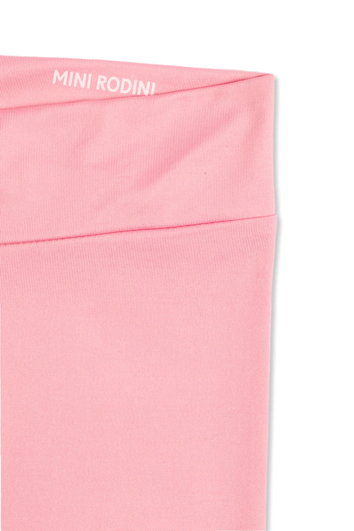 Różowe legginsy z wysokim stanem Mini Rodini. Wykonane z materiału pozyskanego z recyklingu. W talii wszyta guma. Z przodu kolorowy nadruk. Długie, rozszerzane nogawki.
