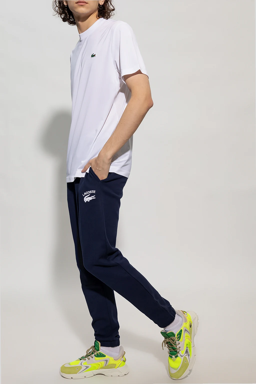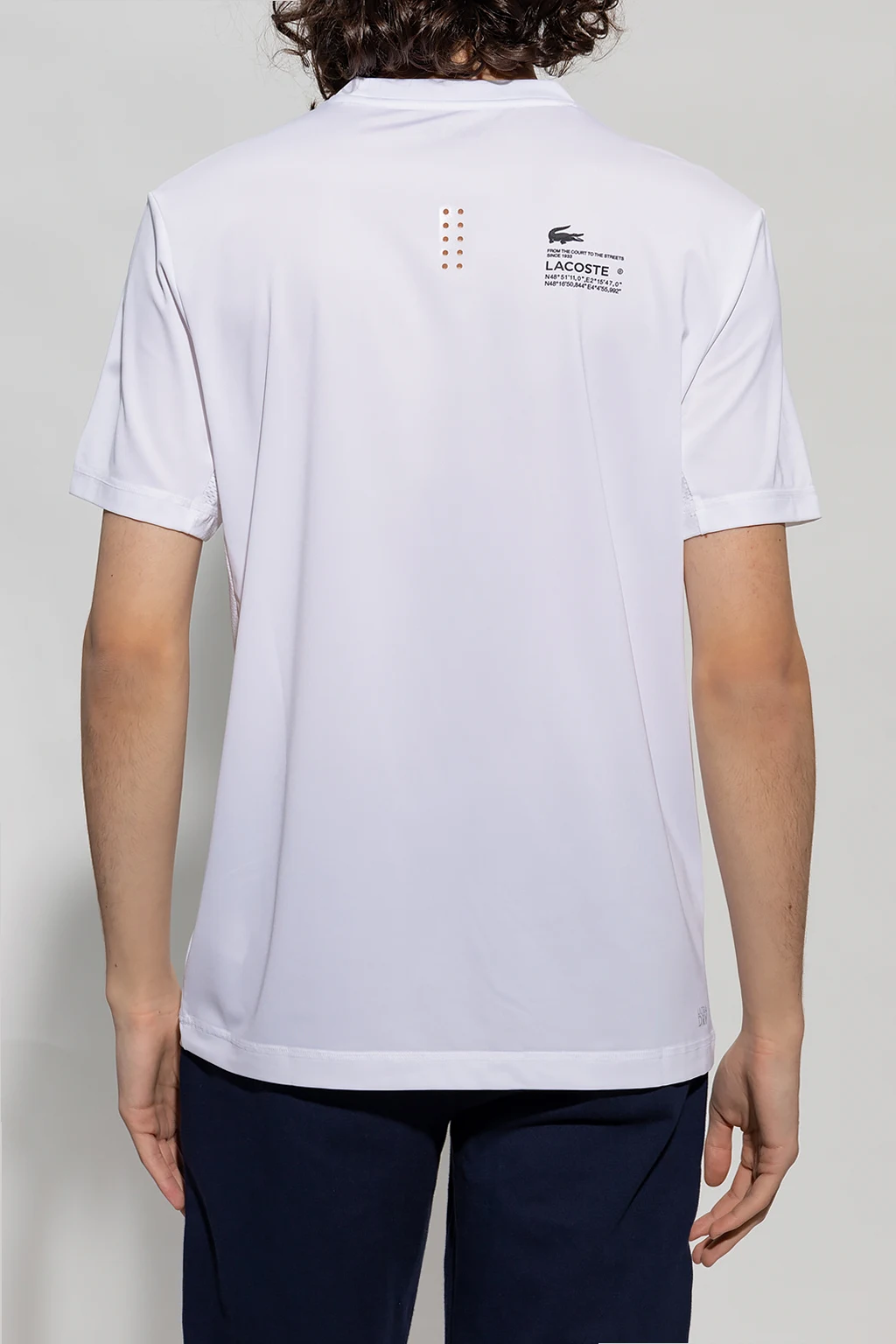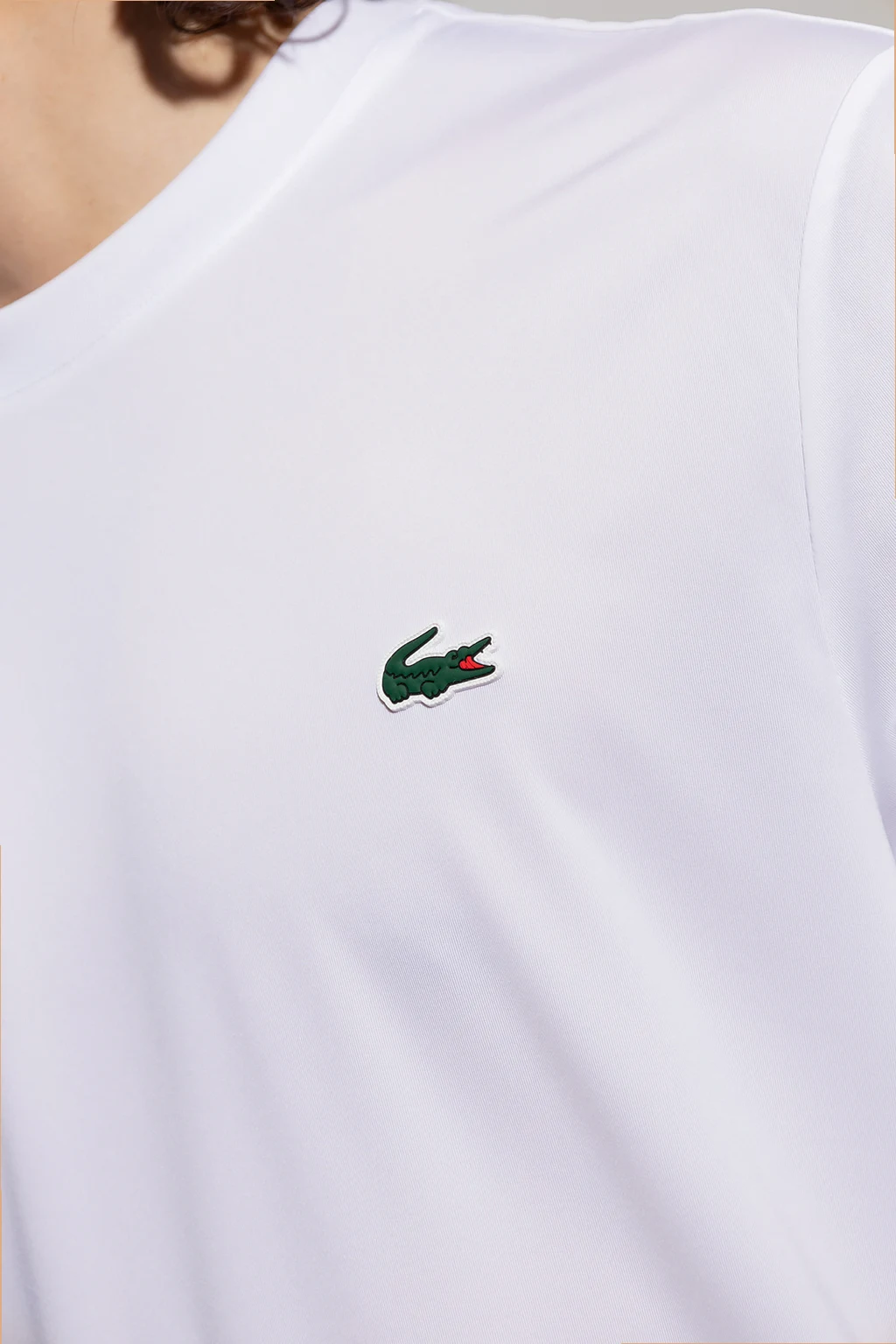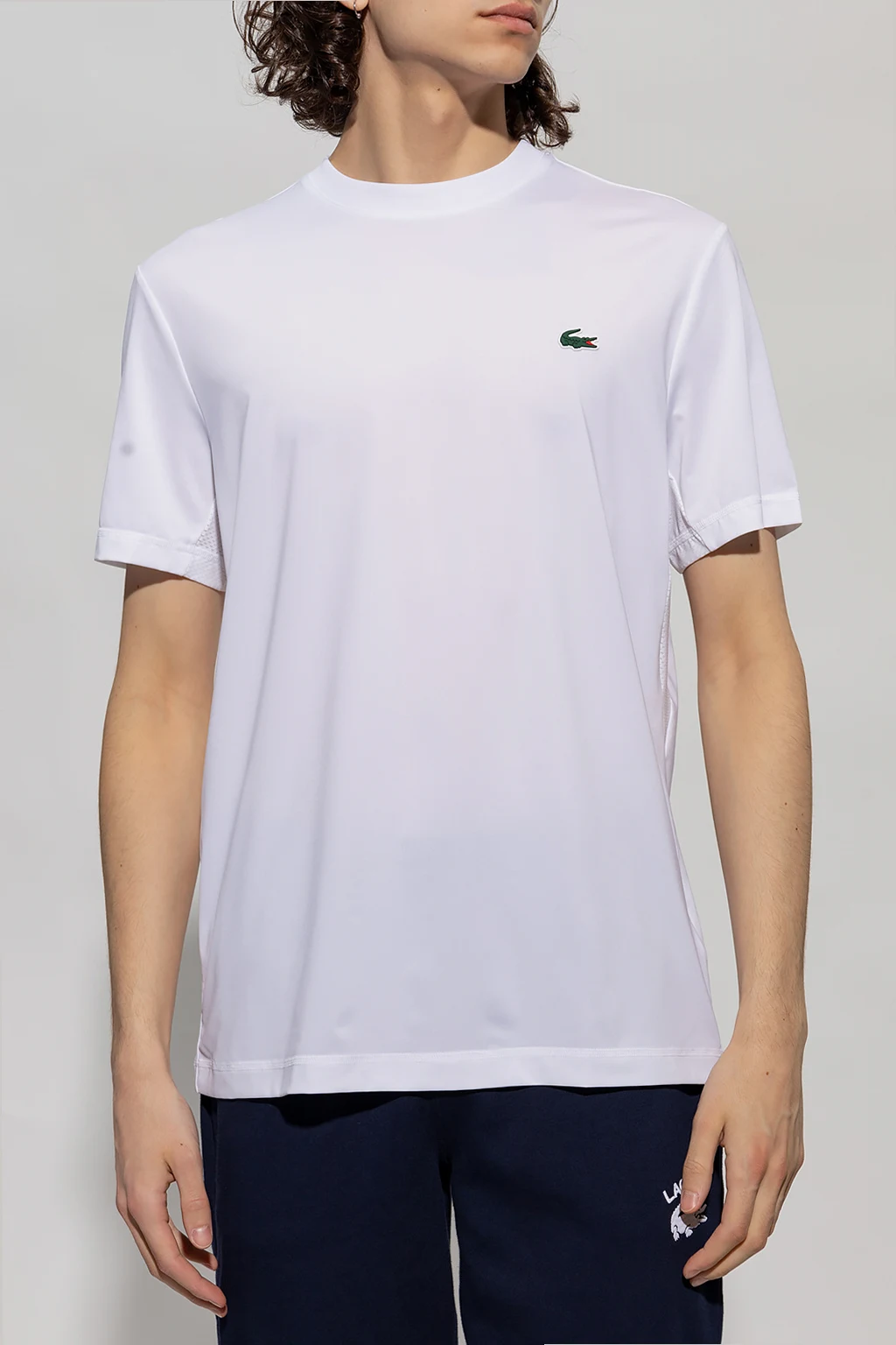 Biały t-shirt Lacoste. Ozdobiony naszywką z logo. Po bokach perforacja. Okrągły dekolt. Krótkie rękawy.