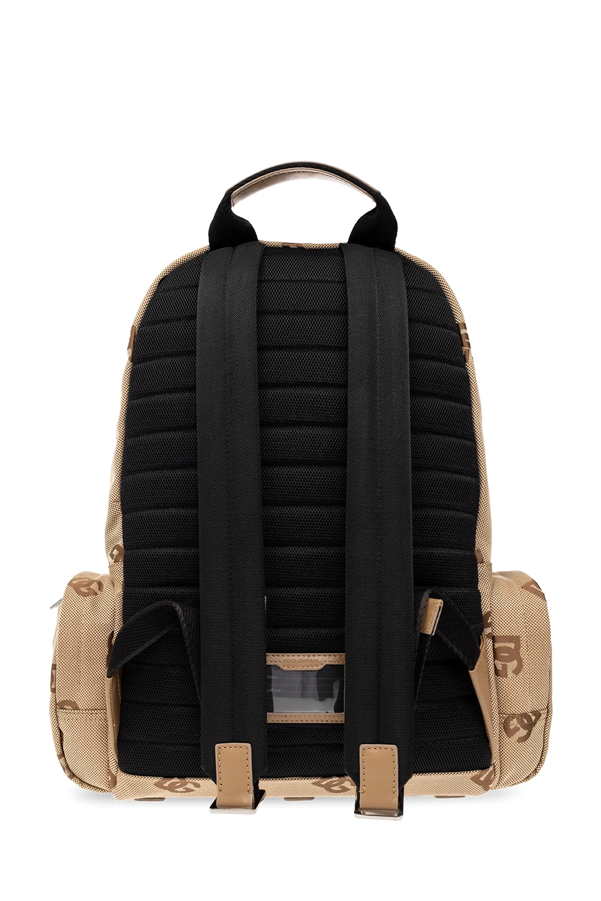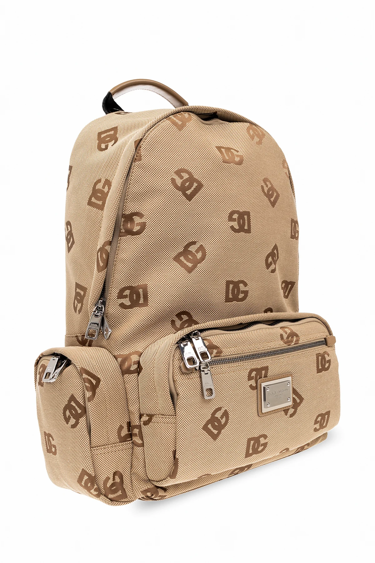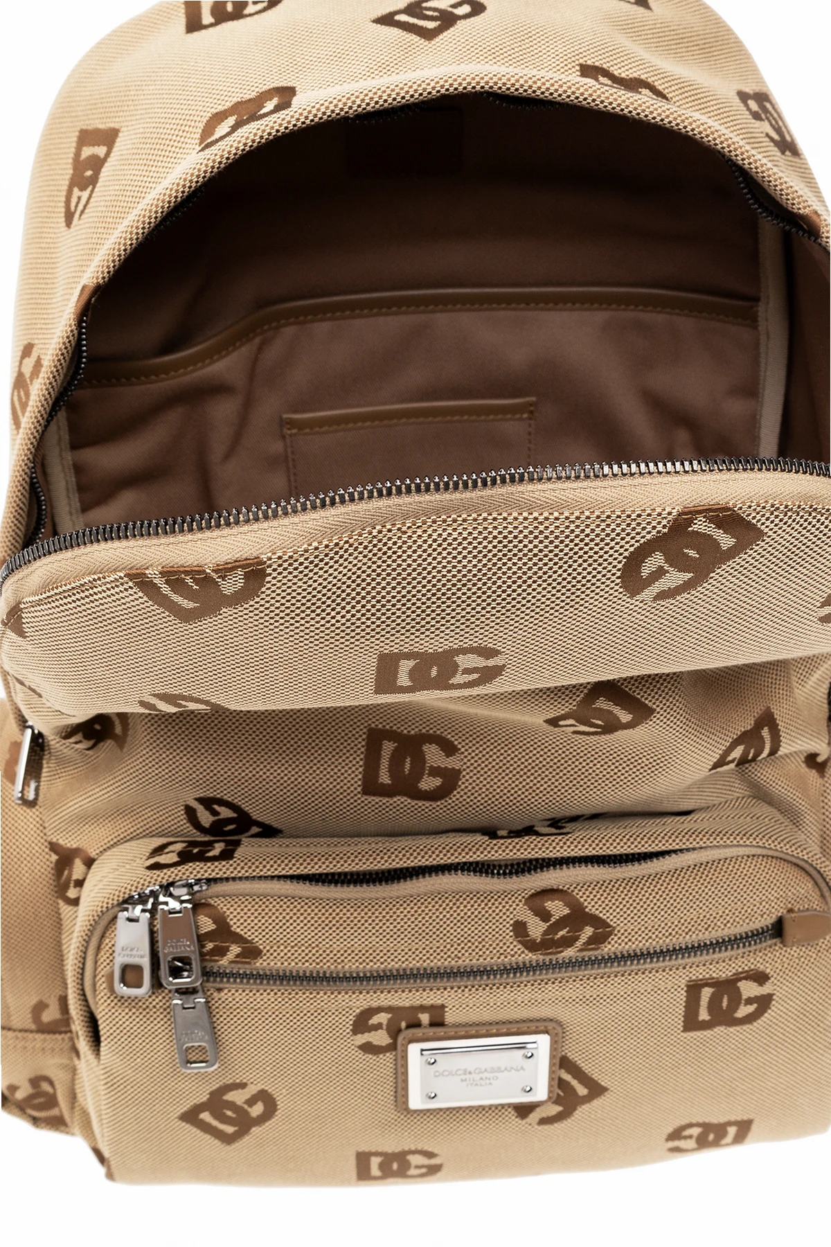 Beżowo-brązowy plecak Dolce & Gabbana. Wykonany z wytrzymałego materiału Cordura®. Zamykany na dwubiegunowy zamek. Ozdobiony wyszytym wzorem z monogramem i metalową aplikacją z wygrawerowanym logo. Cztery kieszenie zamykane na zamek: dwie z przodu oraz dwie po bokach. Na górze krótki uchwyt, z tyłu regulowane szelki. Wewnątrz komora z dwiema kieszeniami: wsuwaną i zamykaną na zamek oraz miejscem na kartę. Metalowe wykończenie w kolorze srebrnym.