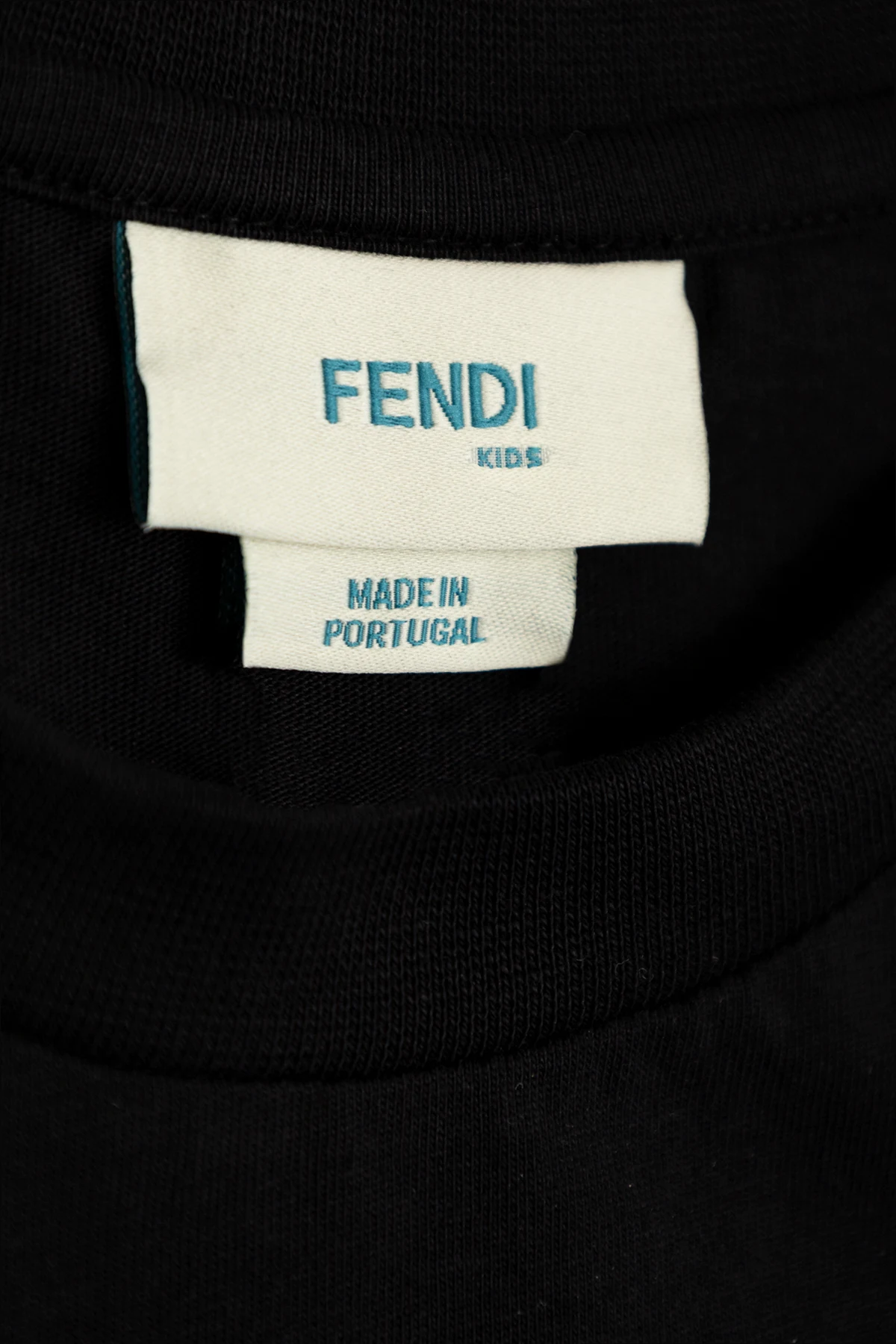 Na wewnętrznej metce znajduje się napis "FENDI KIDS" oraz informacja "MADE IN PORTUGAL", co potwierdza wysoką jakość wykonania i dbałość o detale. T-shirt ten, będący częścią kolekcji Fendi Kids, jest doskonałym uzupełnieniem codziennej garderoby każdego młodego miłośnika mody.
