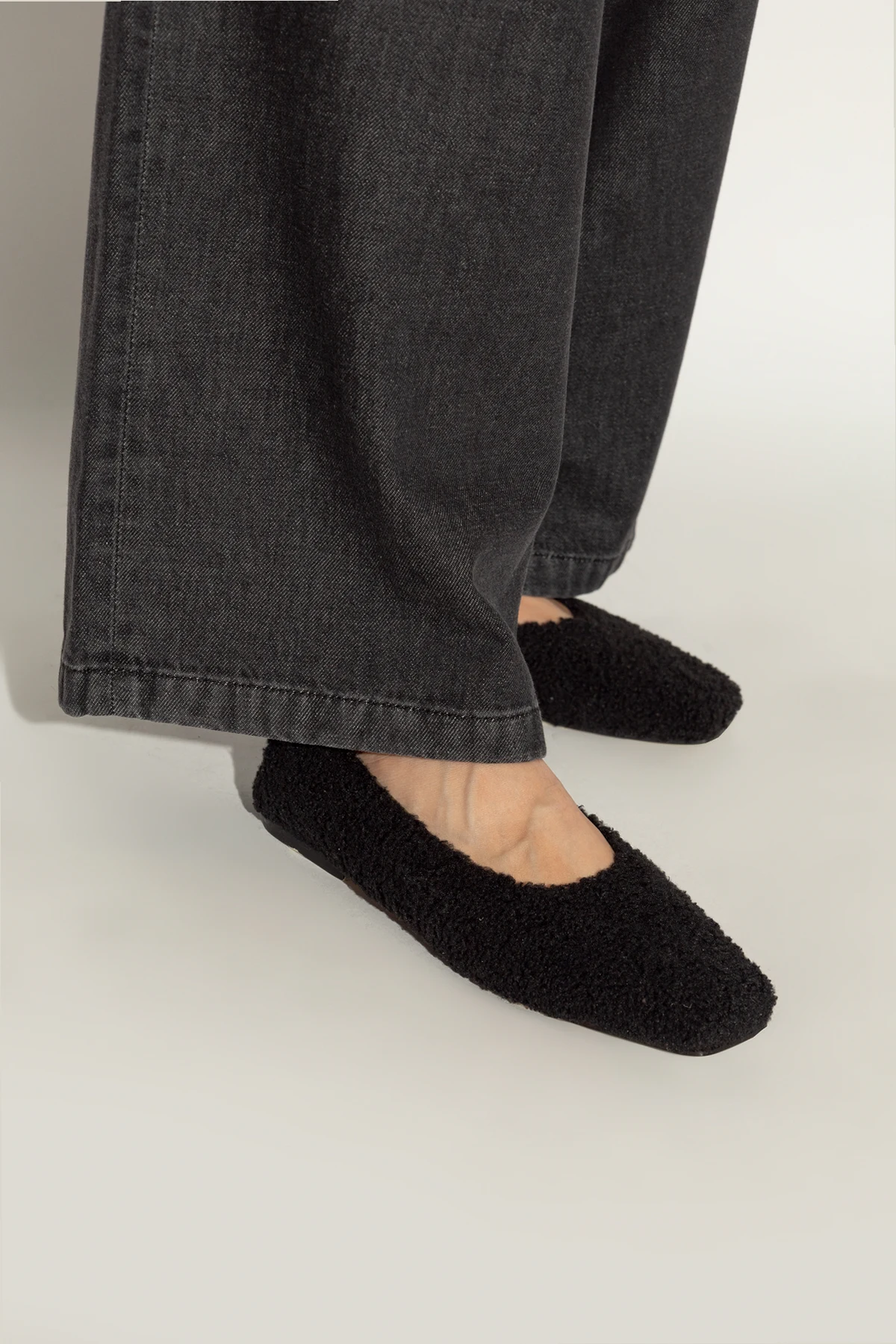 Powierzchnia balerin jest teksturowana, przypominająca materiał typu bouclé lub tkaniny z efektem futra, co nadaje im unikalnego wyglądu. Zewnętrzna warstwa wykonana jest z syntetycznego materiału, który imituje futro lub wełnę, podczas gdy wnętrze obuwia oraz podeszwa wykończone są miękką, beżową skórą.