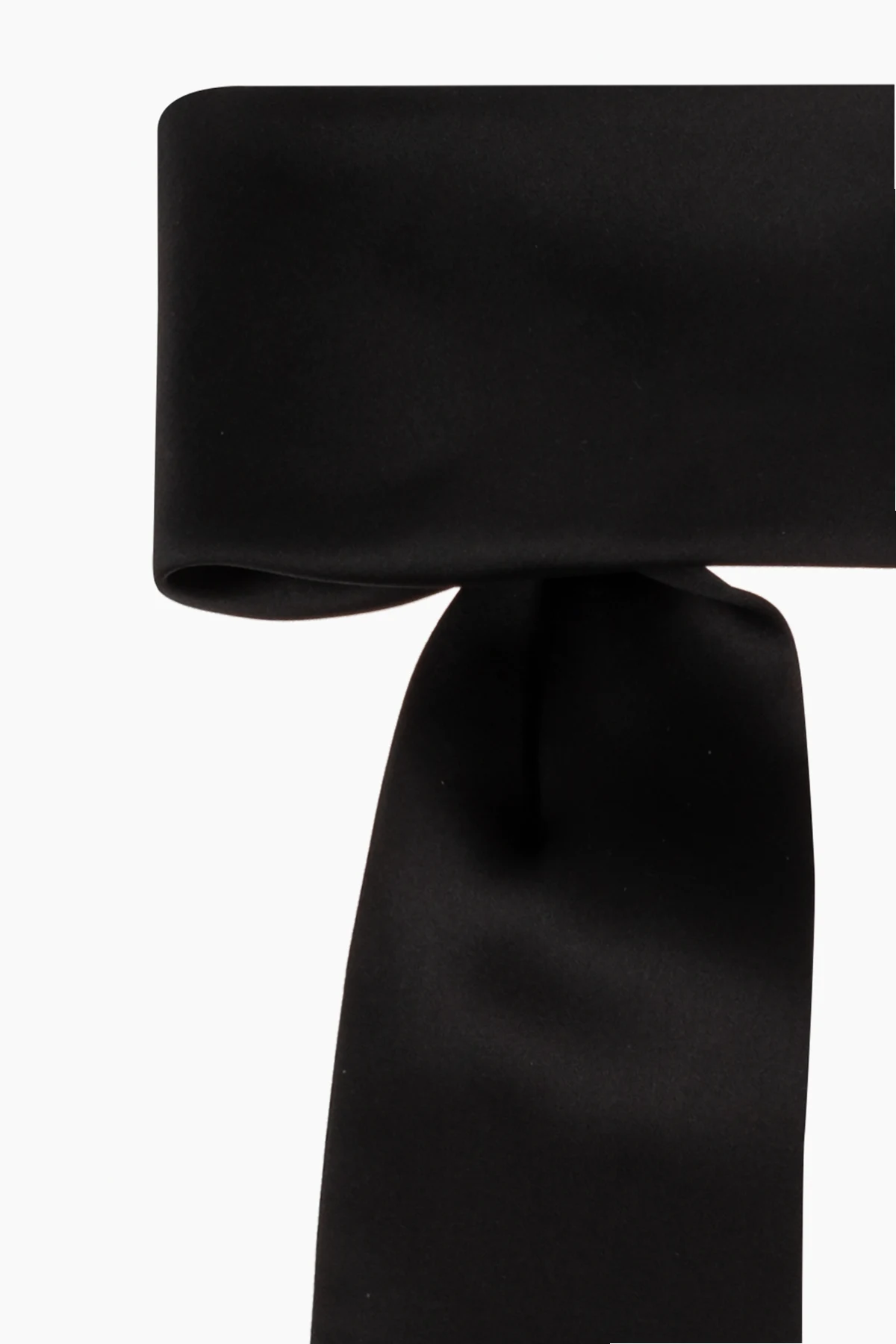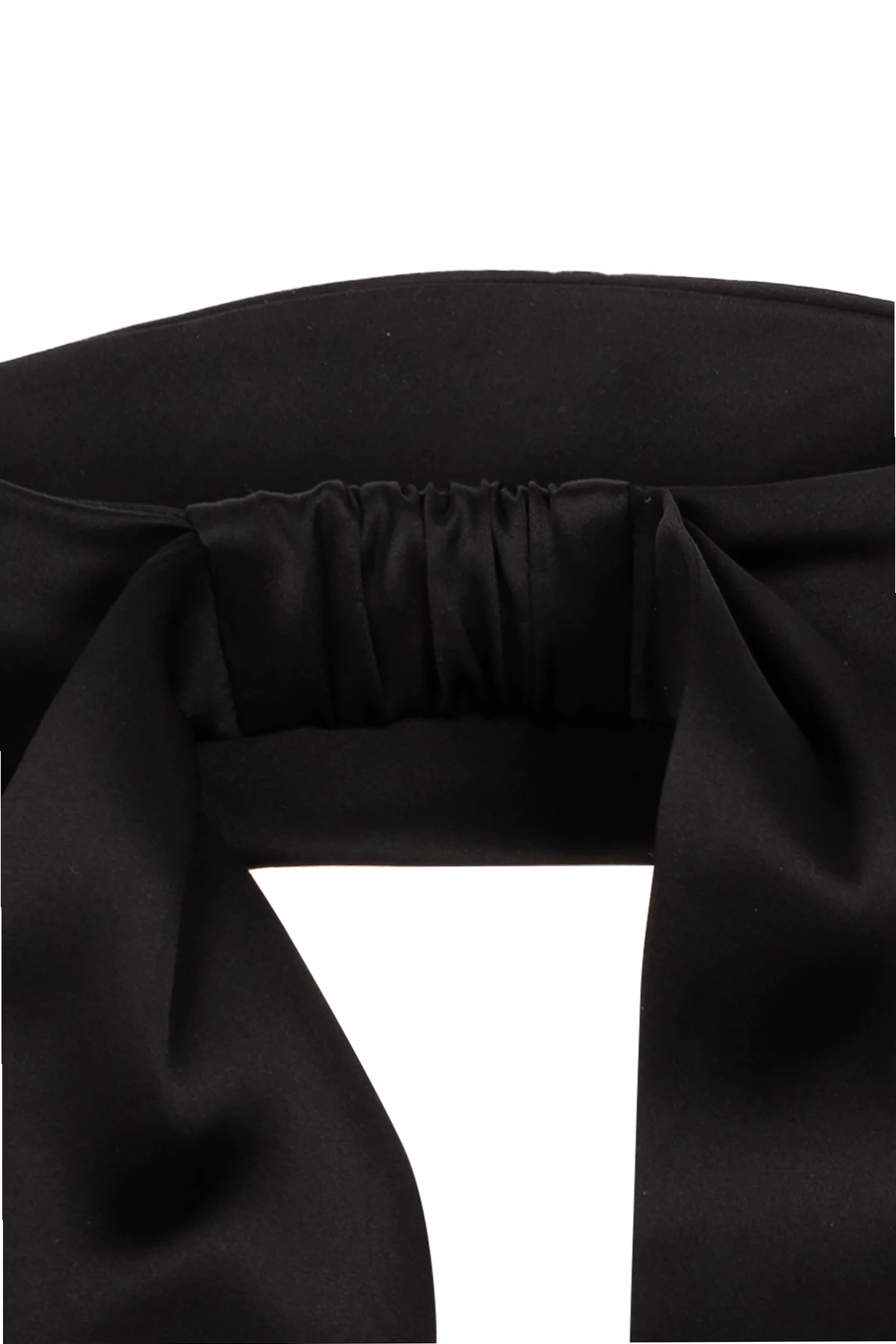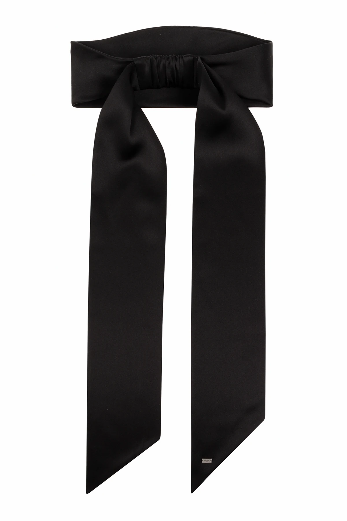 Charakterystyczną cechą tej opaski jest jej unikalna konstrukcja, łącząca szeroką, płaską część zakładaną na głowę z elastycznym środkowym fragmentem dla optymalnego dopasowania, oraz dwie długie, swobodnie opadające taśmy, które można dowolnie styilizować. Dominujący kolor czarny dodaje klasy i uniwersalności, a subtelna metka z logo marki świadczy o autentyczności produktu i dbałości o detale.