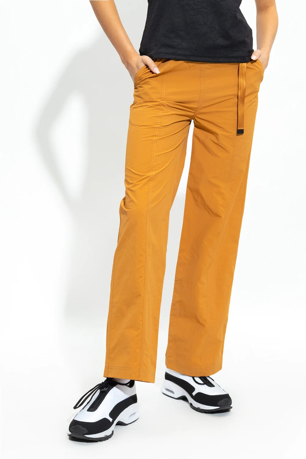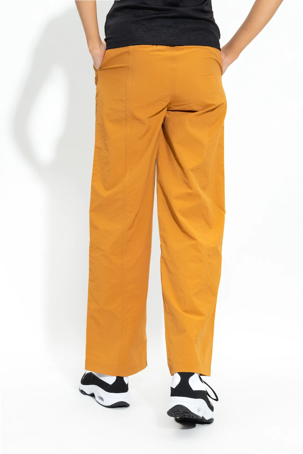 Pomarańczowobrązowe spodnie Puma. W pasie wszyta guma ściągana pasem z klamrą. Ozdobione wyszytym wzorem z logo. Dwie kieszenie wsuwane. Proste nogawki.