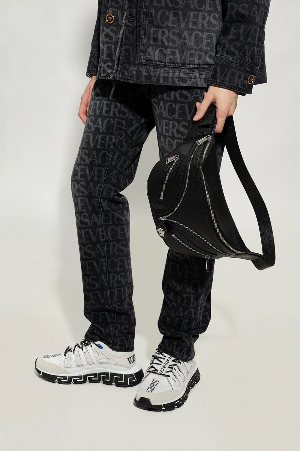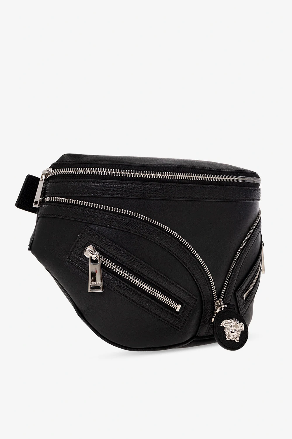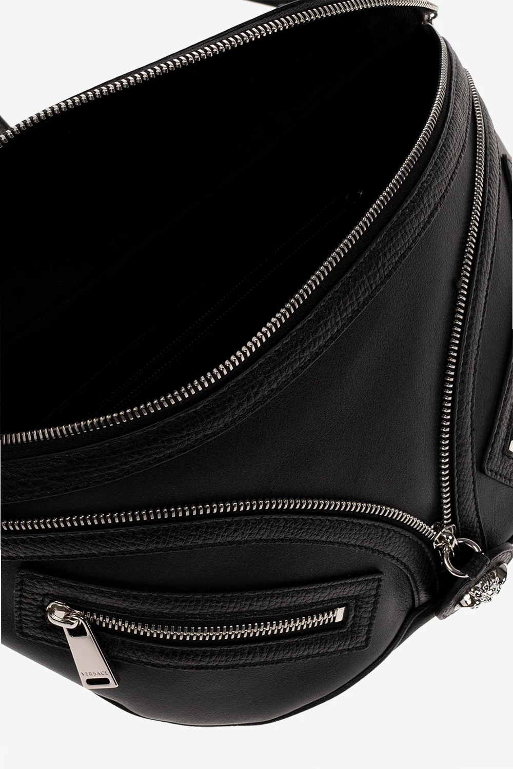 Czarna torba na pas, model ‘Repeat’ Versace. Wykonana ze skóry cielęcej. Zamykana na zamek. Z przodu dekoracyjne zamki, w tym jeden z okrągłą zawieszką wykończoną metalową aplikacją w kształcie głowy Meduzy. Regulowany pas. Wewnątrz komora z kieszenią zamykaną na zamek. Metalowe wykończenie w kolorze srebrnym.