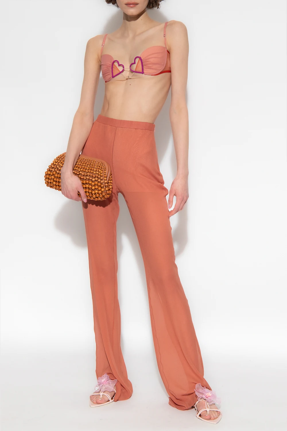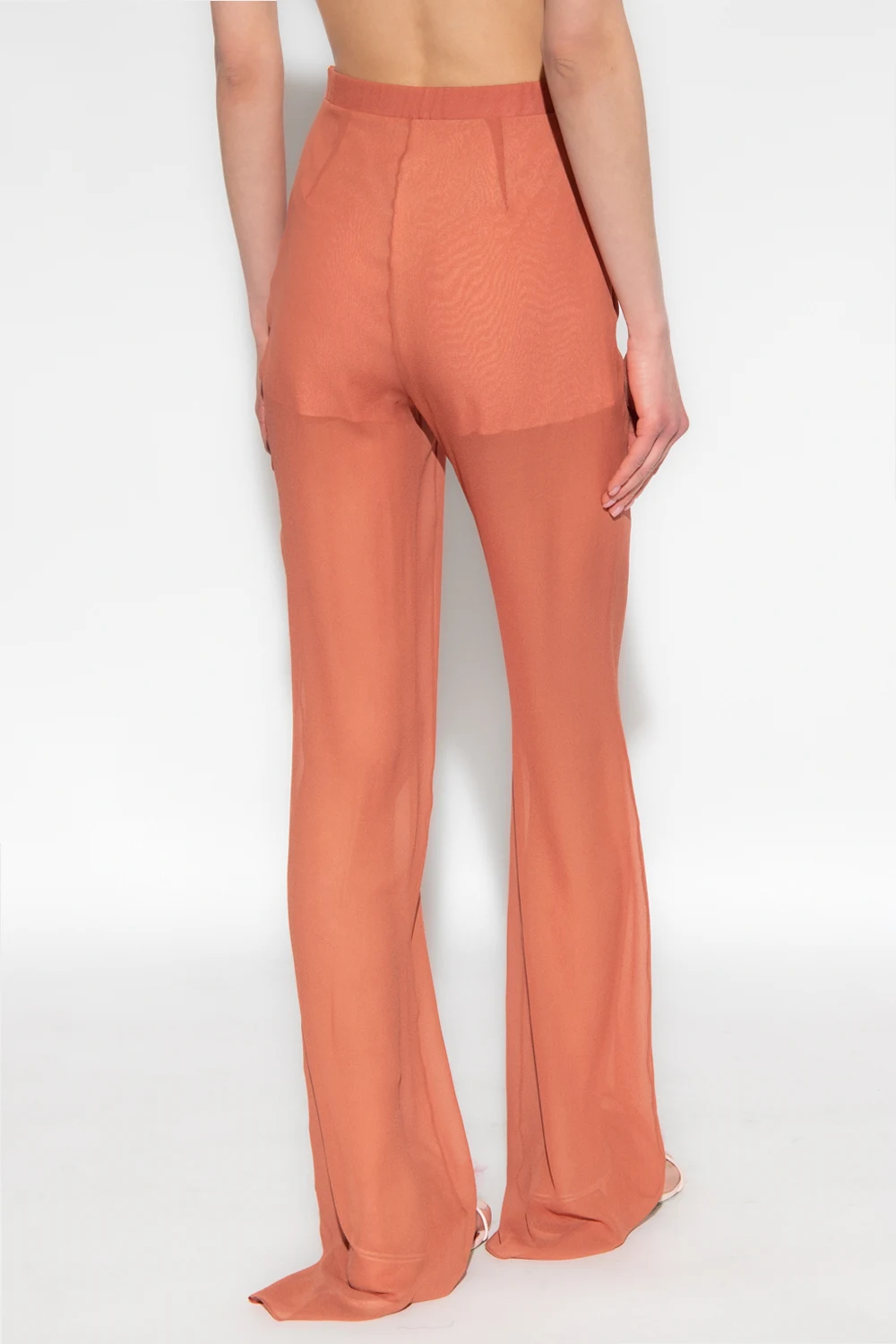 Pomarańczowe spodnie Nensi Dojaka. Wykonane z jedwabiu. W pasie wszyta guma. Z boku zapinane na zamek oraz haftkę. Transparentne nogawki.