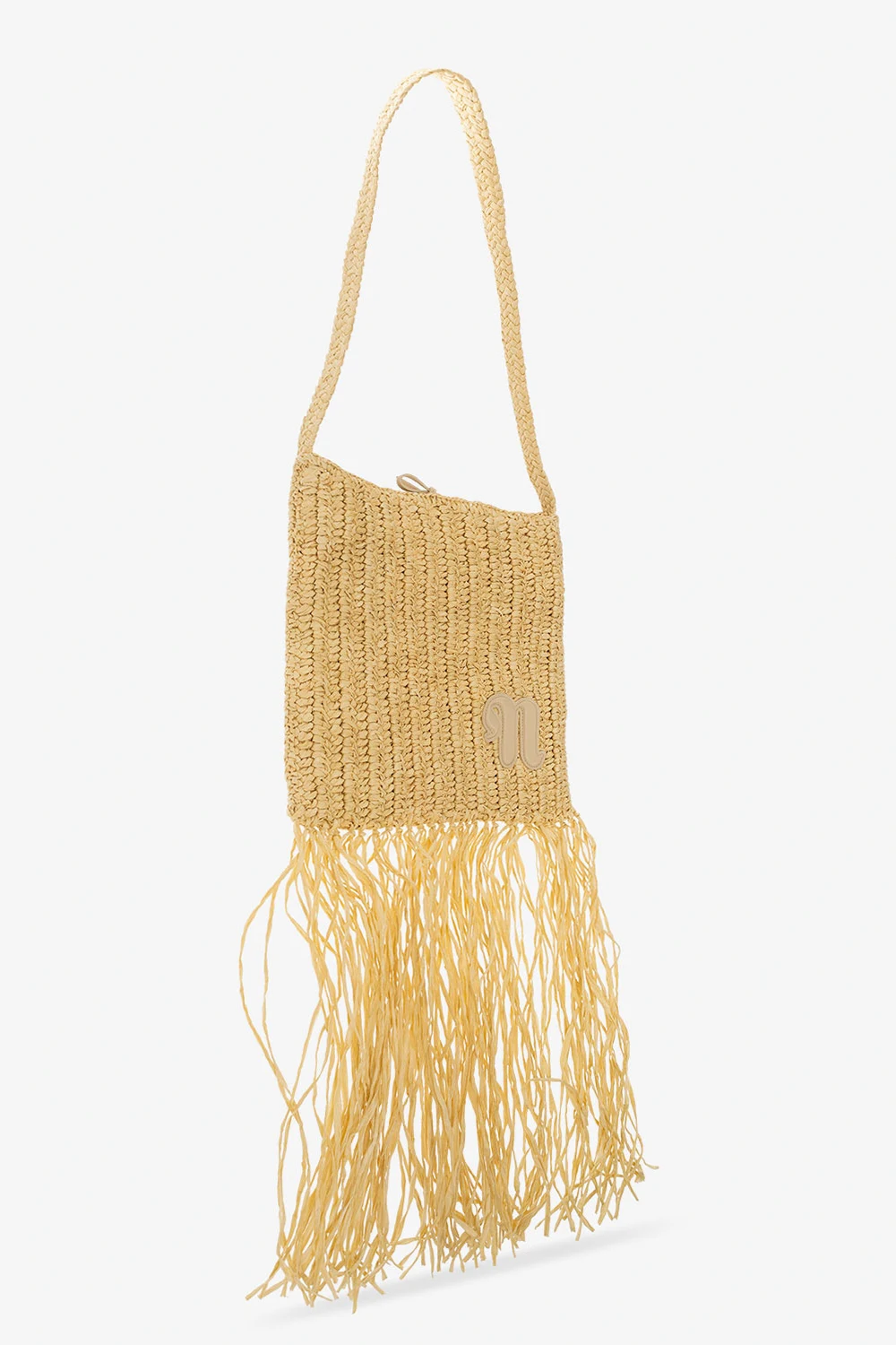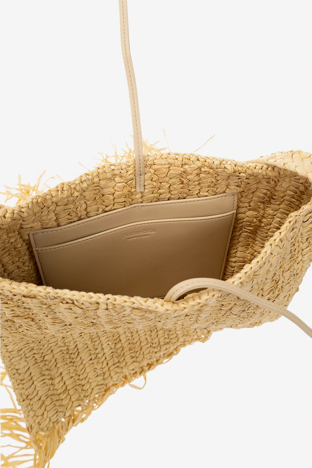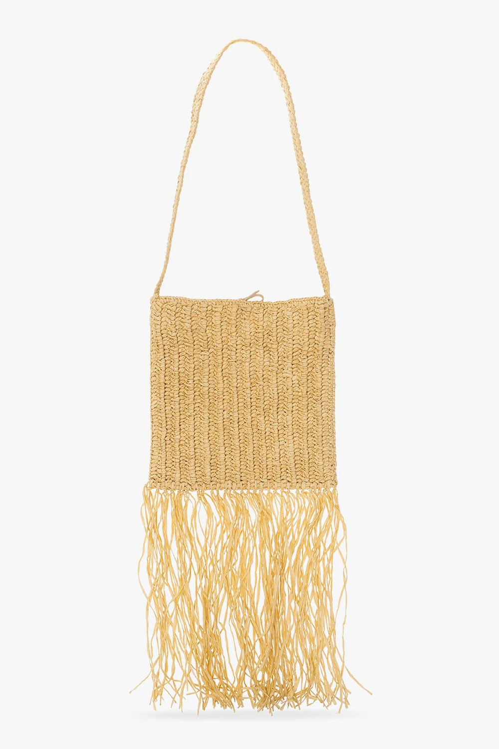 Beżowa torba na ramię, model 'The Fringe' Nanushka. Wykonana z rafii. Wiązana trokami. Ozdobiona frędzlami. Wewnątrz komora oraz trzy wsuwane kieszenie.