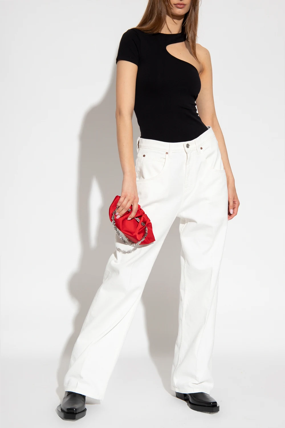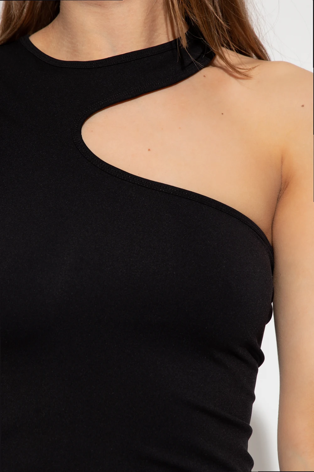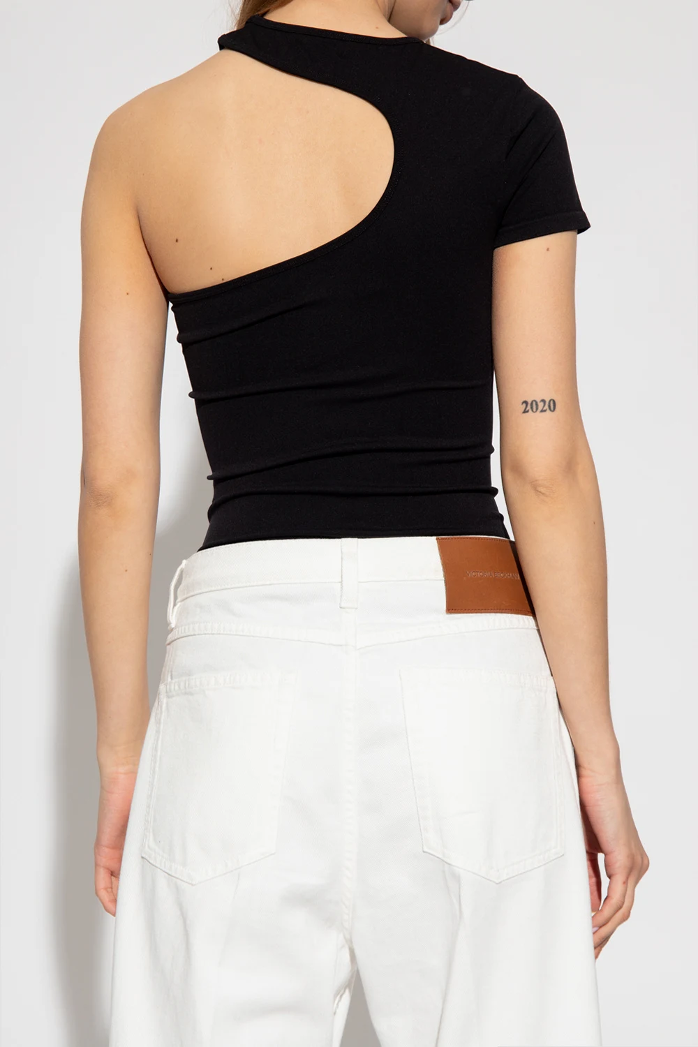 Czarny top na jedno ramię, model ‘Cutout T’ Helmut Lang, kolekcja ‘Core’. Krótki rękaw.