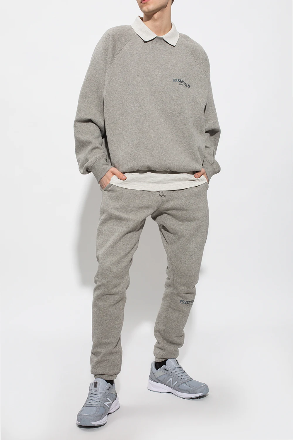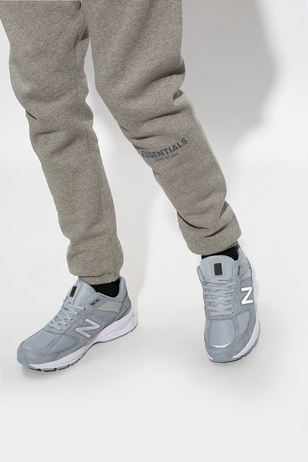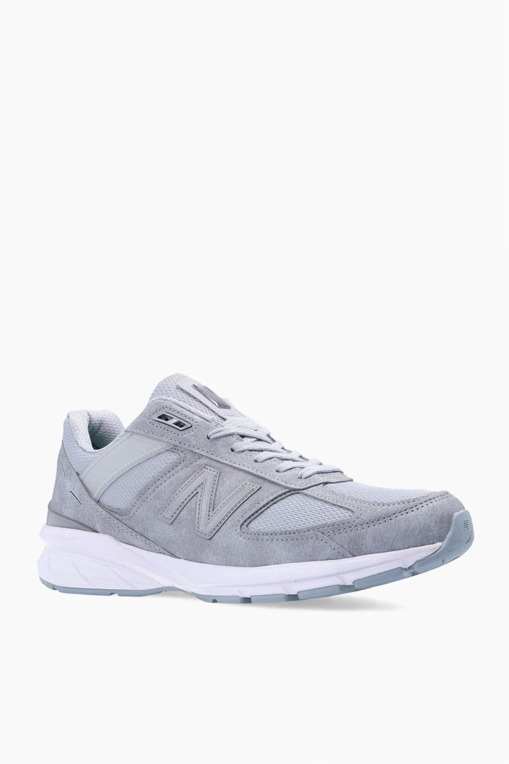 Szare, sznurowane buty sportowe, model ‘990V5’ New Balance. Wykonane z zamszu oraz siatki. Ozdobione naszywką z logo. Wykończone skórzanymi akcentami. Zastosowano technologię ‘ENCAP’, charakterystyczną dla marki. Jest to połączenie pianki EVA w podeszwie wewnętrznej i poliuretanu na zewnętrznej warstwie spodu buta, pod piętą w kolorze biało-szarym.
