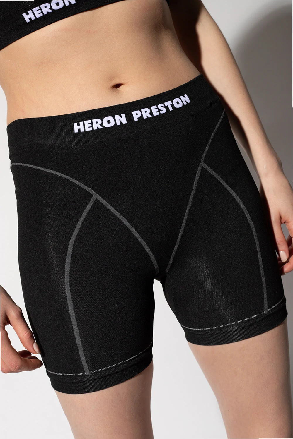 Czarne, krótkie legginsy Heron Preston. W pasie wszyta guma. Ozdobione nadrukowanym i naszytym logo.