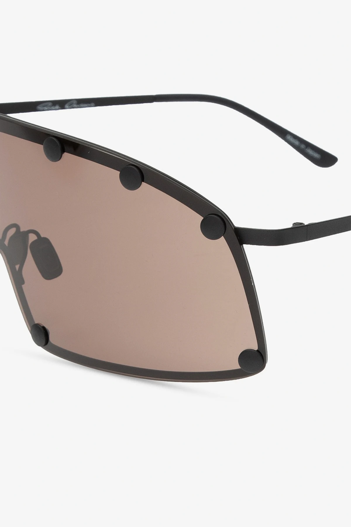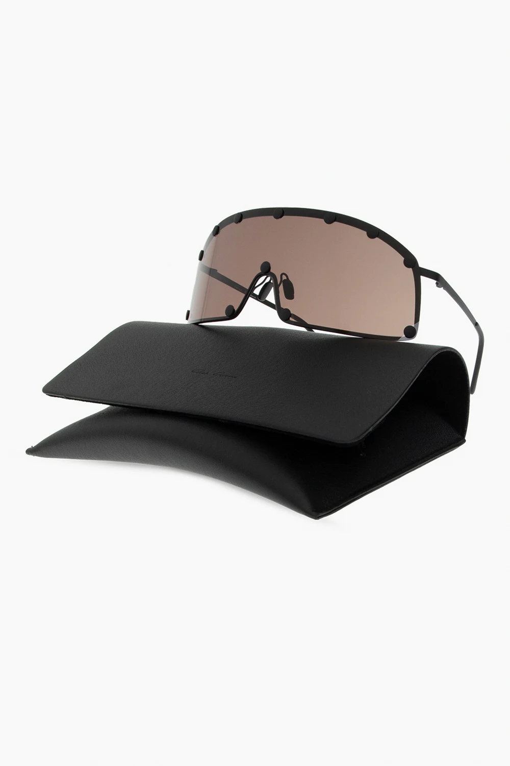 Czarne okulary przeciwsłoneczne, model ‘Shielding’ Rick Owens. Ciemnobrązowe, certyfikowane soczewki 100% UVA/UVB. Dołączone etui.