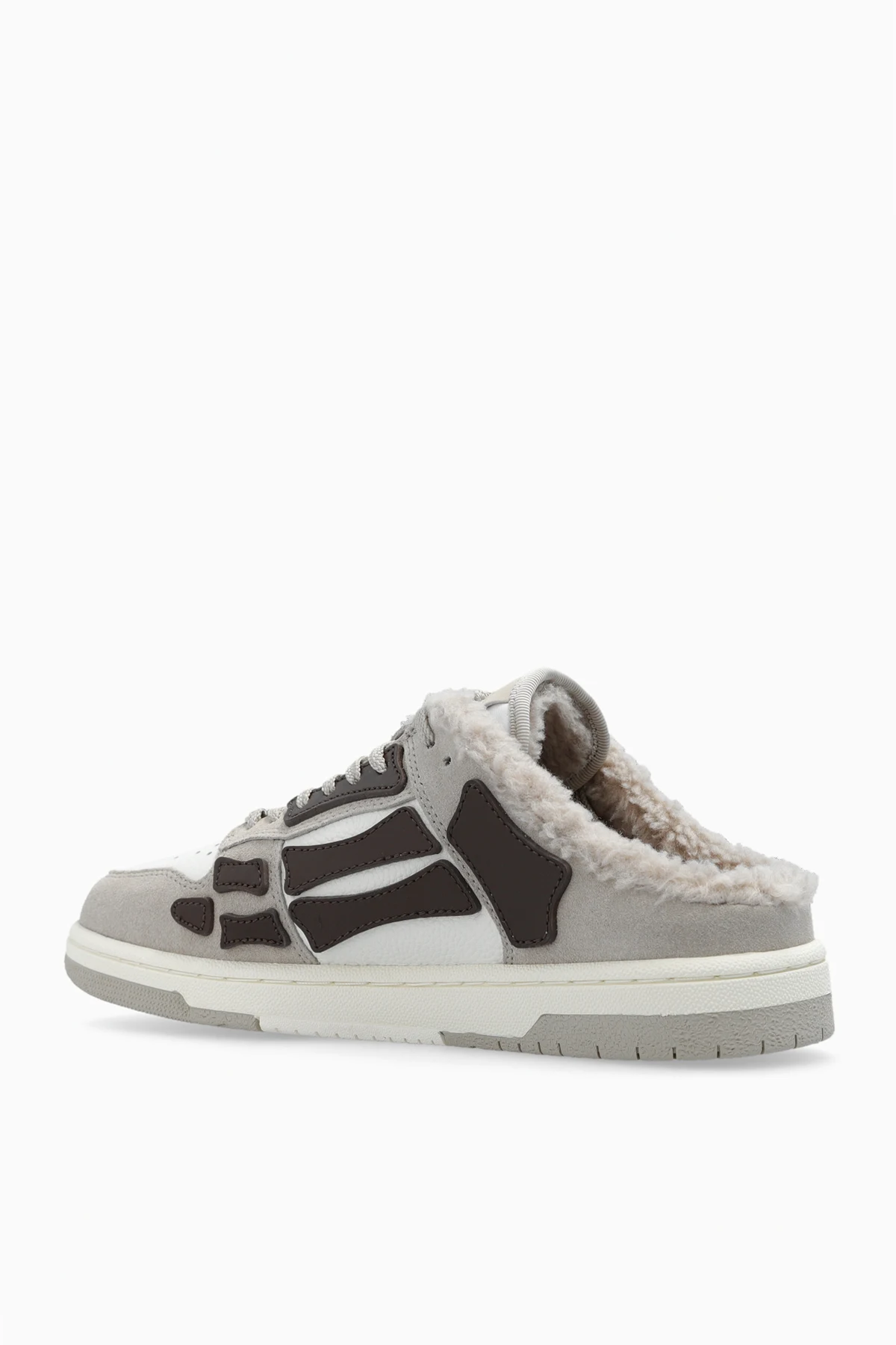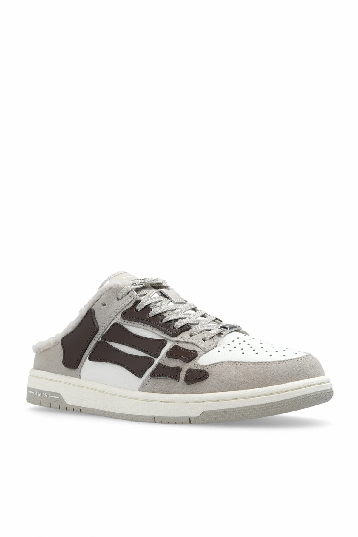 Biało-szaro-brązowe klapki, model ‘Skel Top’ Amiri. Wykonane ze skóry i zamszu. Z przodu perforacja i sznurowanie. Ocieplana warstwa wewnętrzna. Po bokach naszywki z motywem kości. Kremowo-szara, gumowa podeszwa.