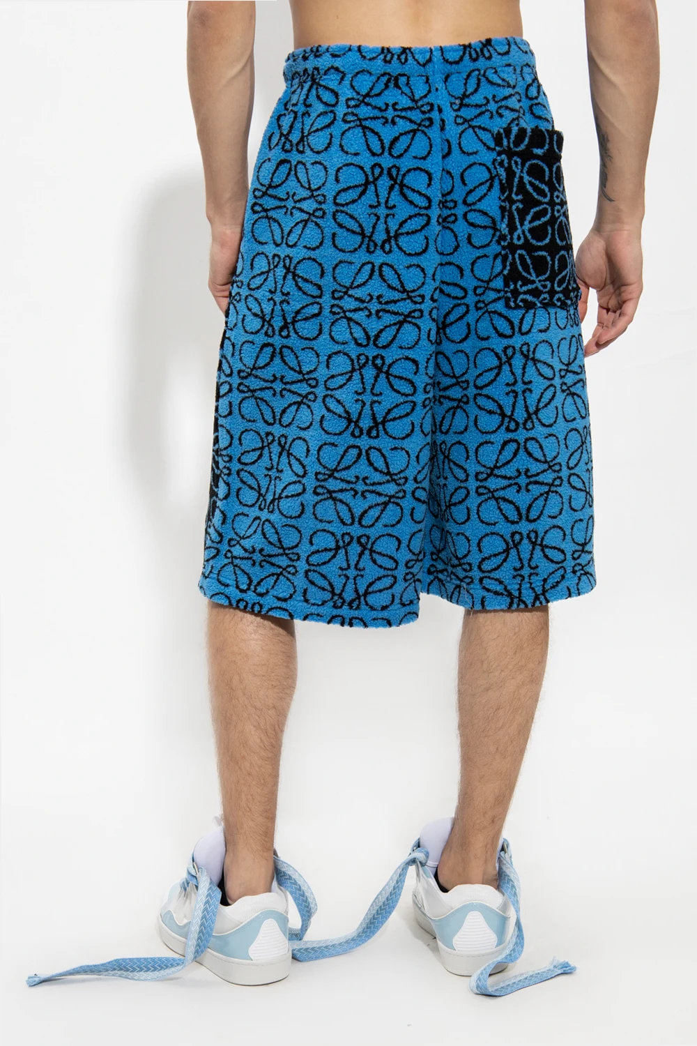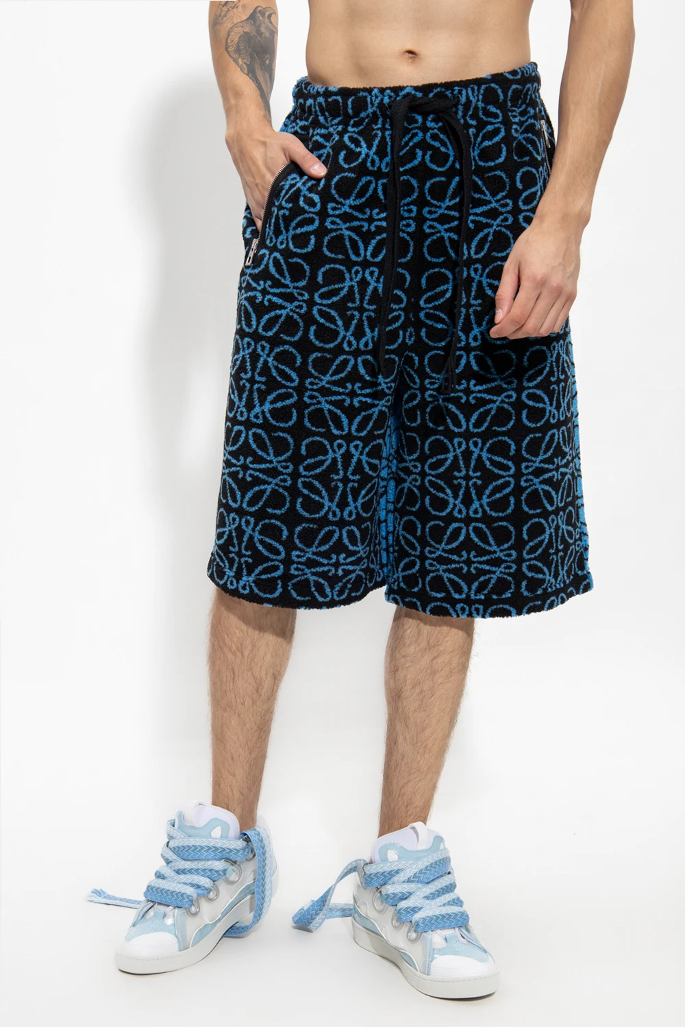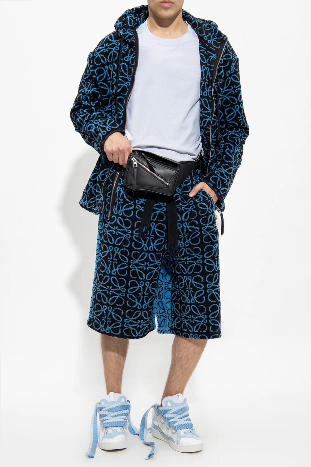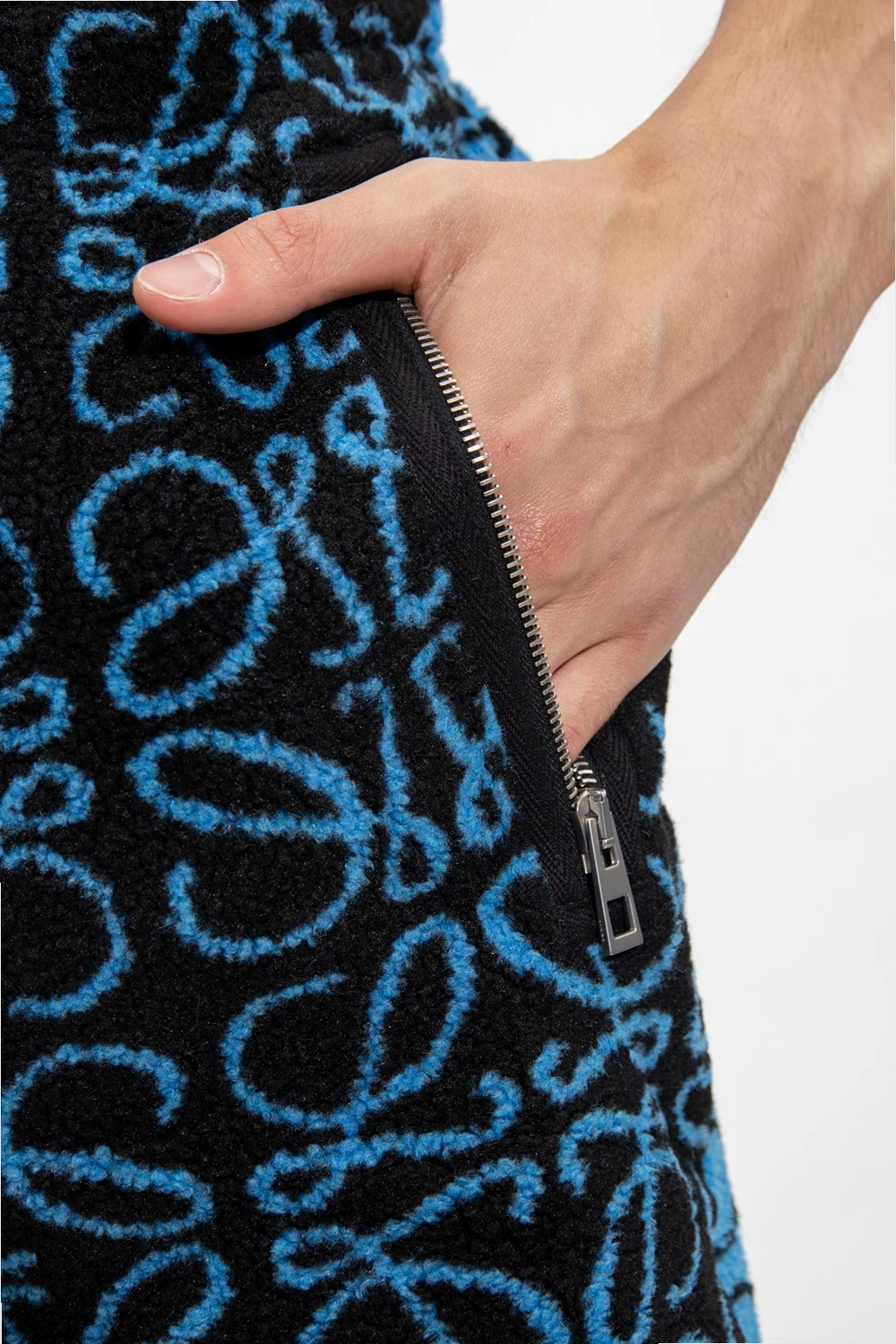 Czarno-niebieskie, polarowe szorty Loewe. W pasie wszyta guma ściągana trokami. Ozdobione wzorem z logo ‘Anagram’. Trzy kieszenie: dwie zapinane na zamek z przodu oraz wsuwana z tyłu.
