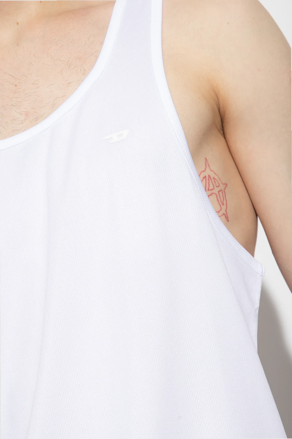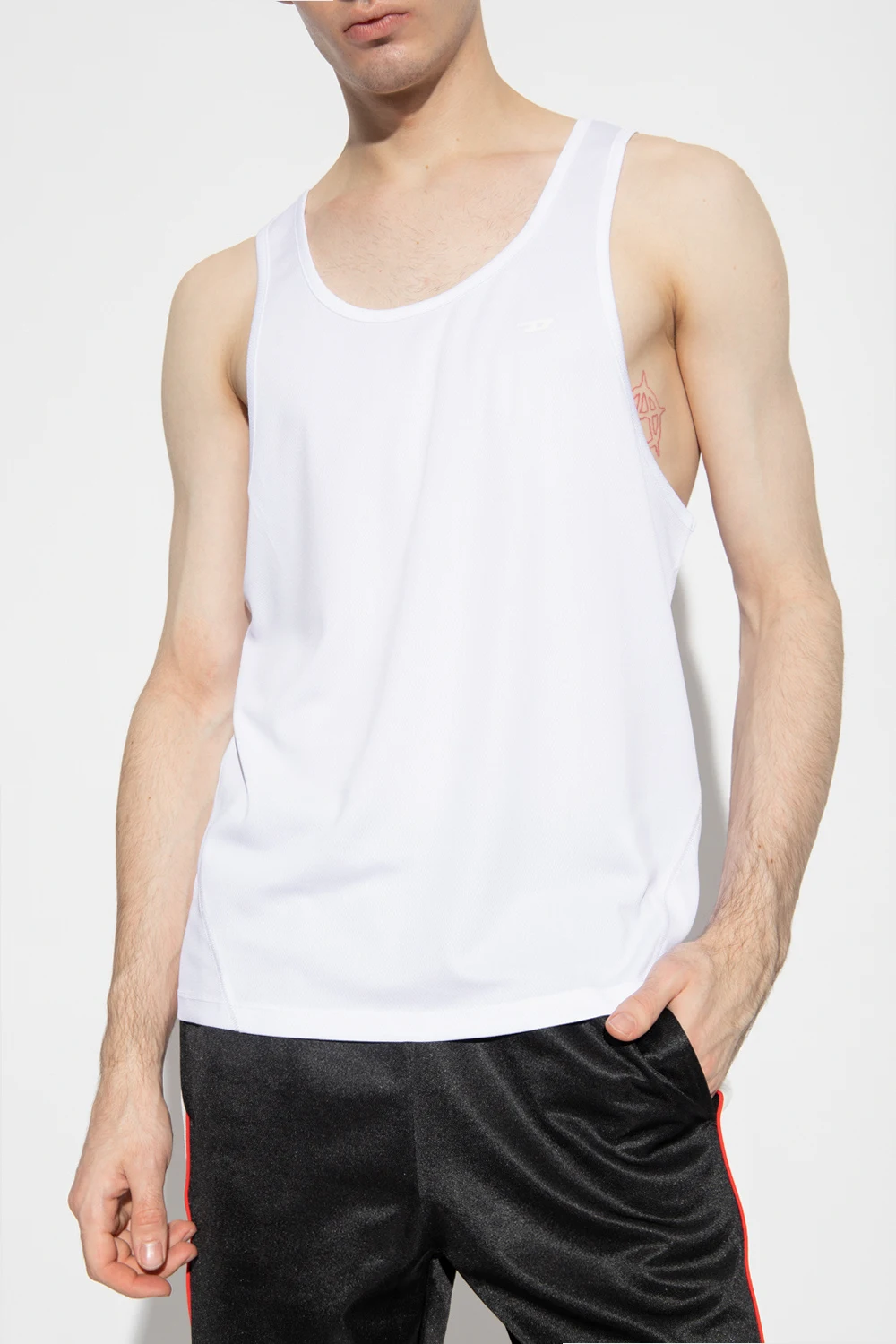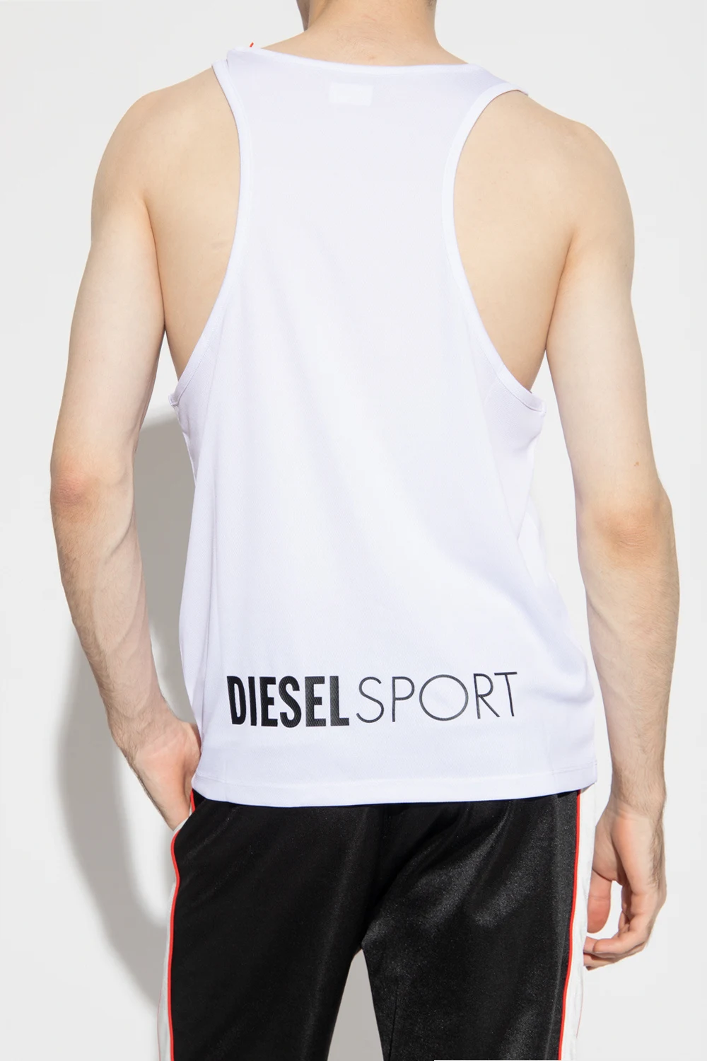 Biały t-shirt bez rękawów, model ‘AMST-KIERON-WT36’ Diesel, kolekcja ‘DIESEL SPORT’. Ozdobiony aplikacją z logo w kolorze białym oraz czarnym nadrukiem.