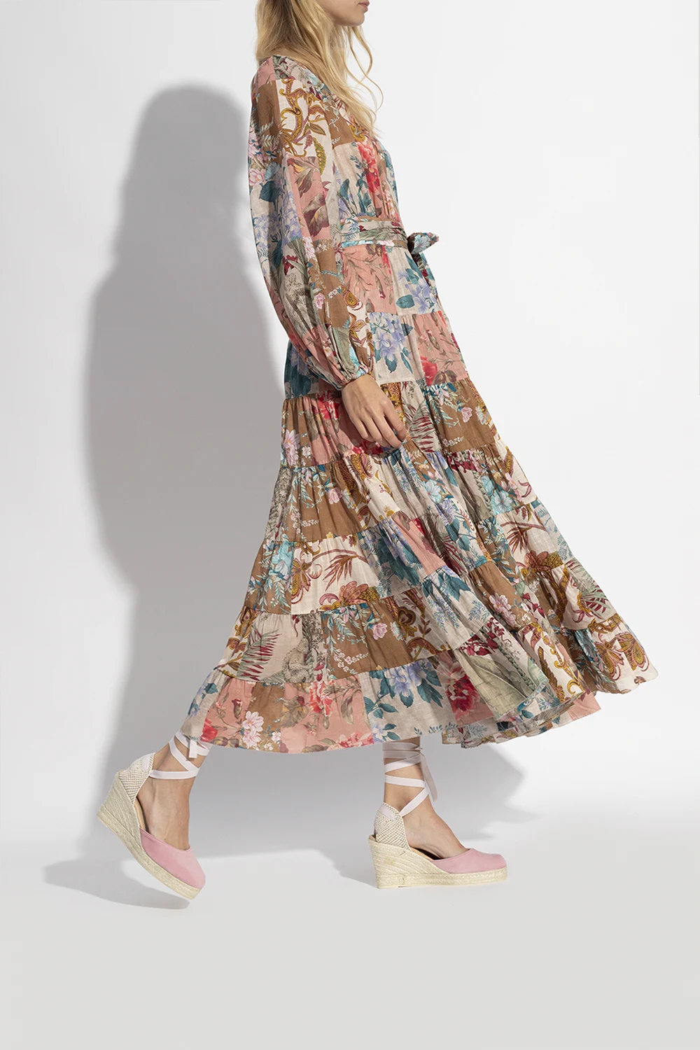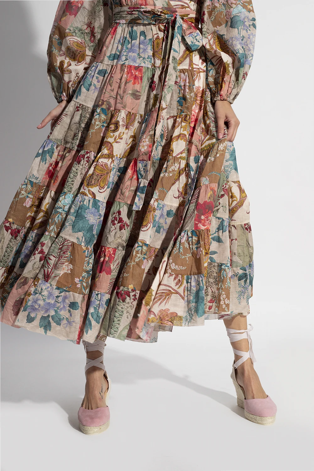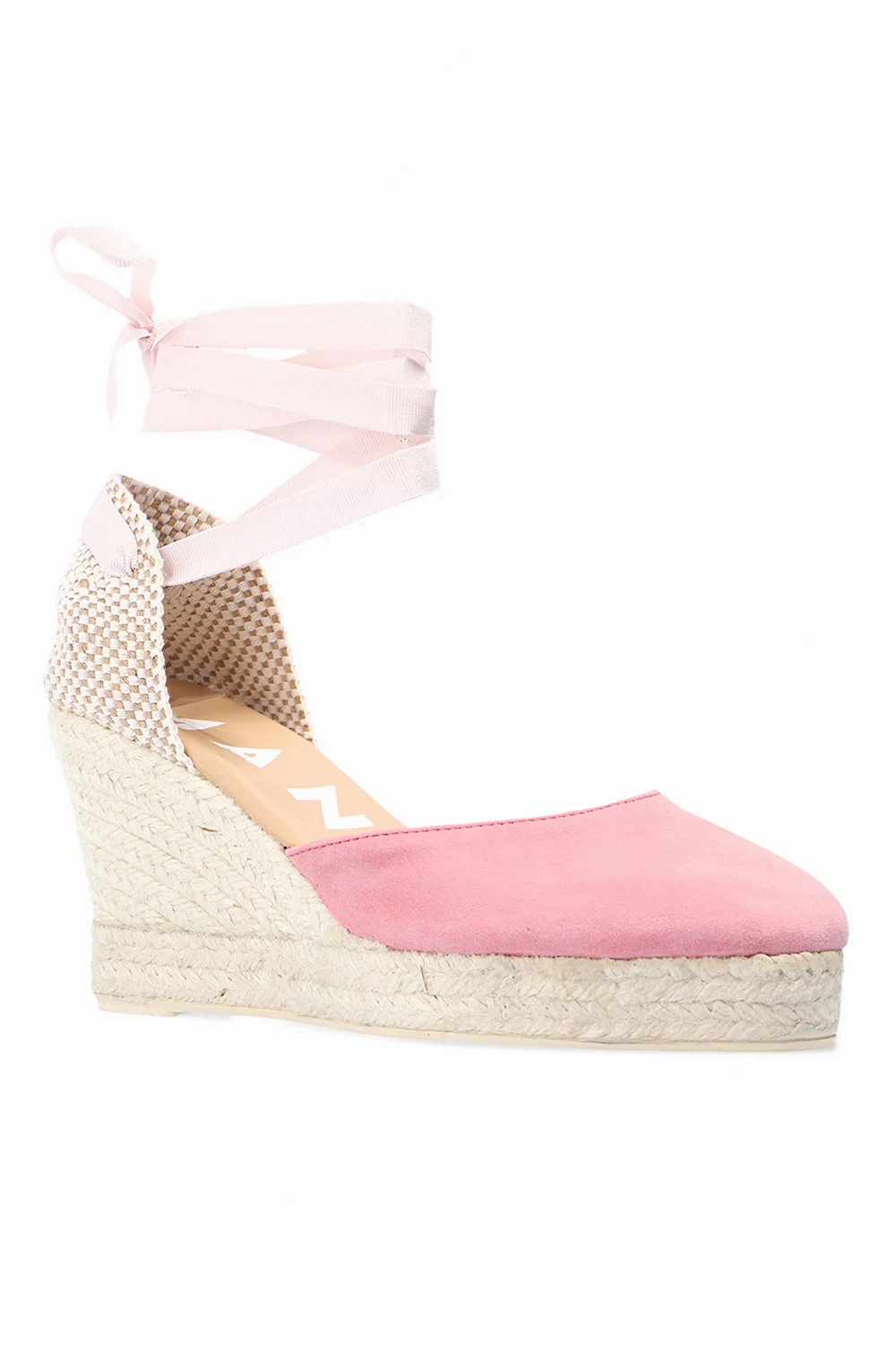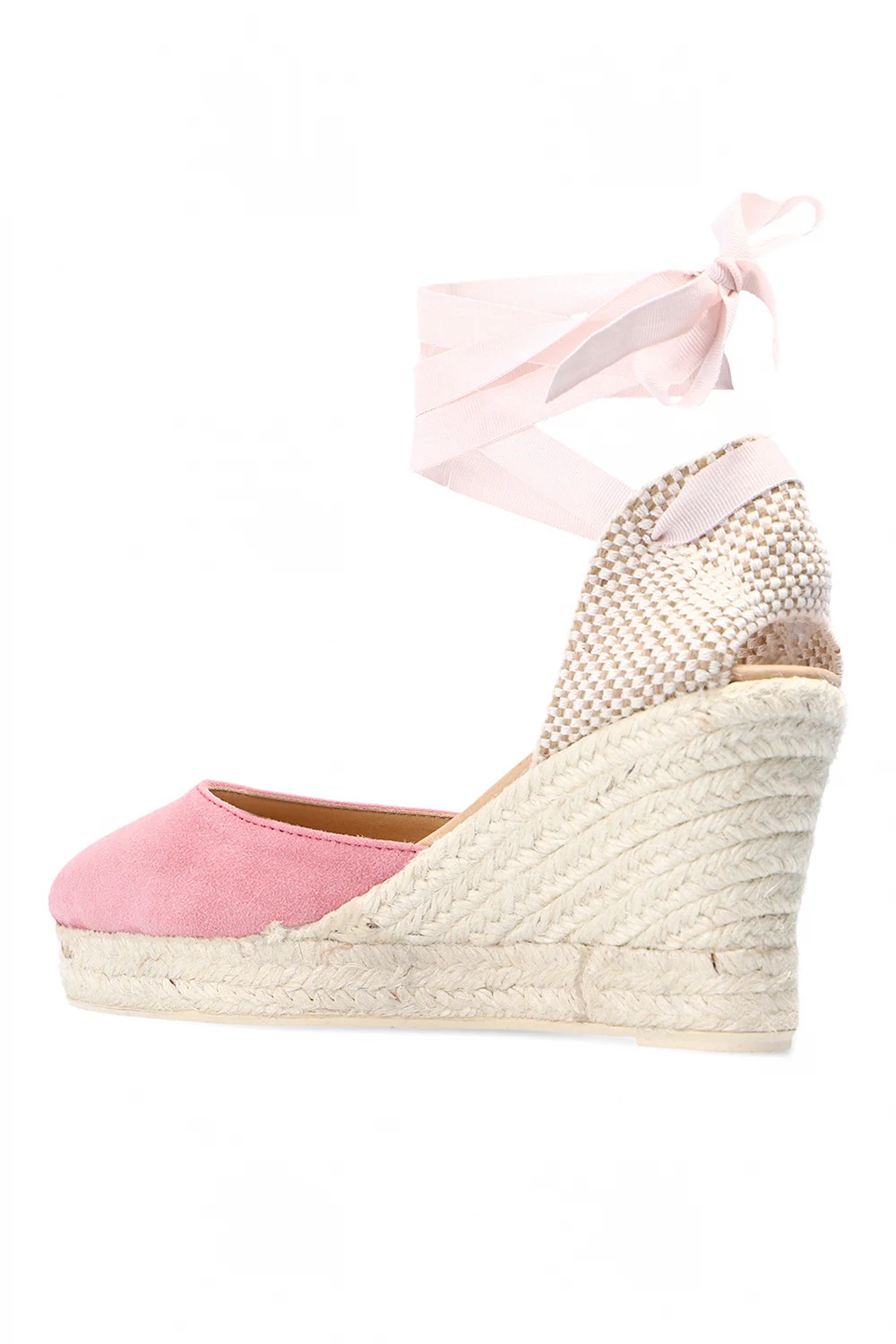 Różowe sandały na koturnie, model ‘Hamptons’ Manebi. Wykonane z zamszu. Wiązane na rypsowy pasek biegnący dookoła kostki. Platforma wykończona naturalną jutą w kolorze beżowym. Kremowa, gumowa podeszwa.