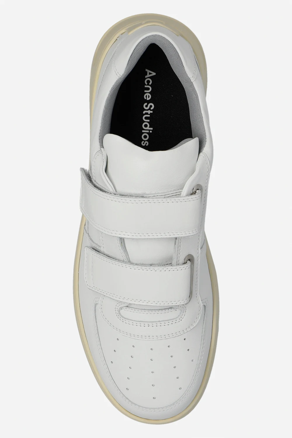 Białe buty sportowe, model ‘Perey’ Acne Studios. Wykonane ze skóry. Zapinane na rzep. Ozdobione aplikacją oraz nadrukiem z logo. Kremowa, gumowa podeszwa.