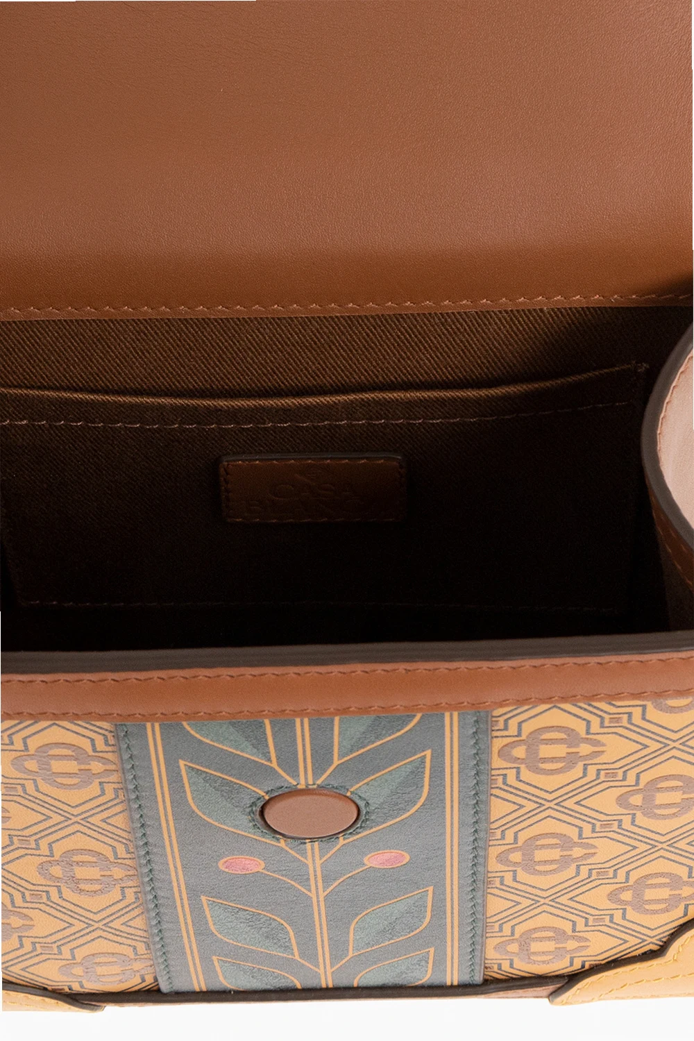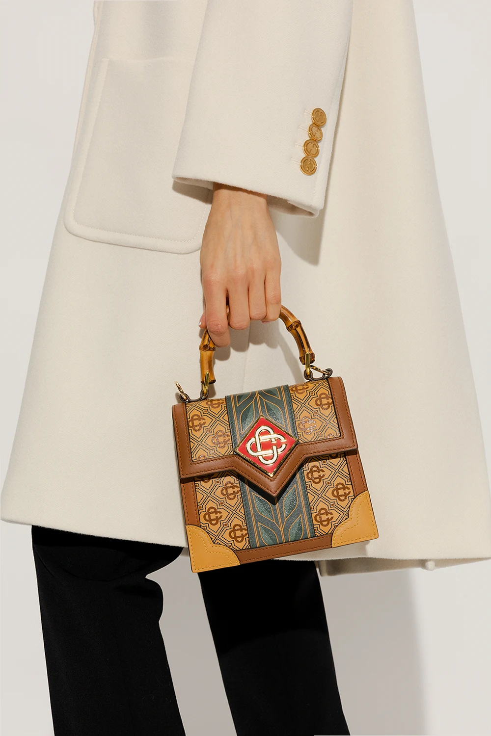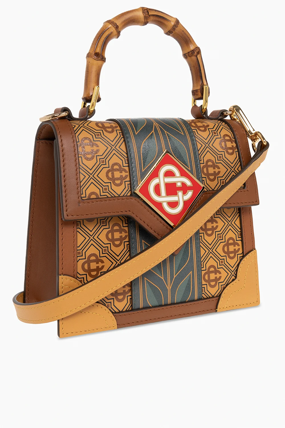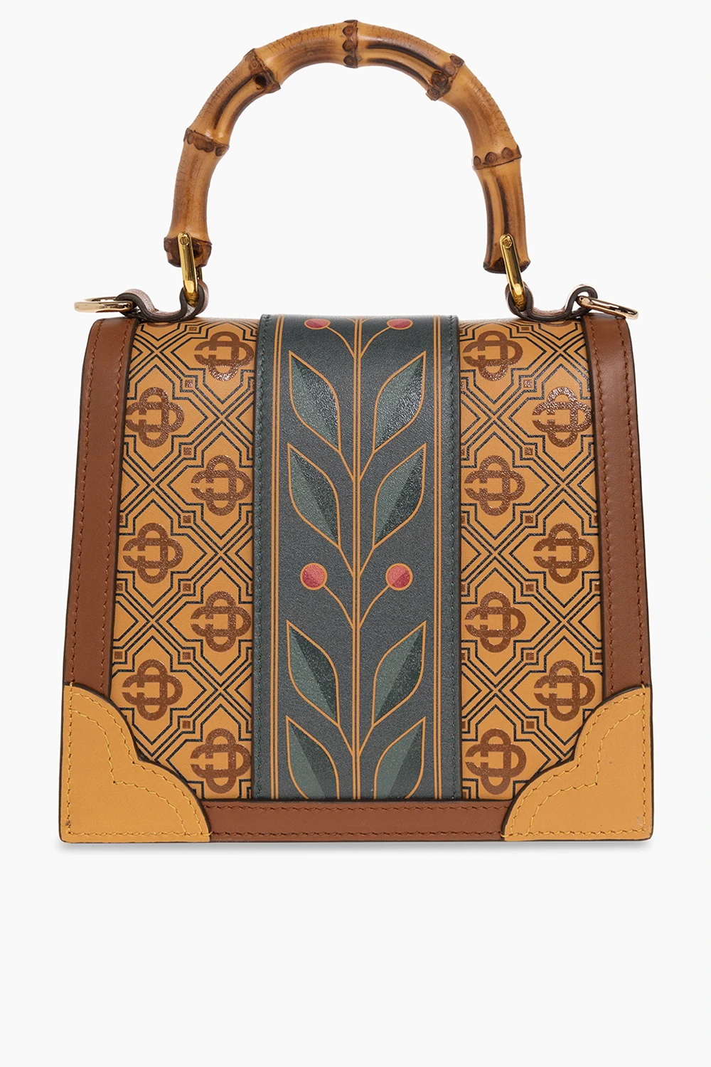 Brązowa torba na ramię, model ‘Jeanne Mini’ Casablanca. Wykonana ze skóry. Zamykana na magnetyczny zatrzask. Ozdobiona wzorem z monogramem oraz pasem ozdobionym motywem roślinnym w kolorze zielonym. Z przodu metalowa aplikacja z logo wykończona lśniącą emalią. Bambusowa, półokrągła rączka oraz odpinany pas na ramię z możliwością regulacji długości. Wewnątrz komora z wsuwaną kieszenią. Metalowe wykończenie w kolorze złotym.