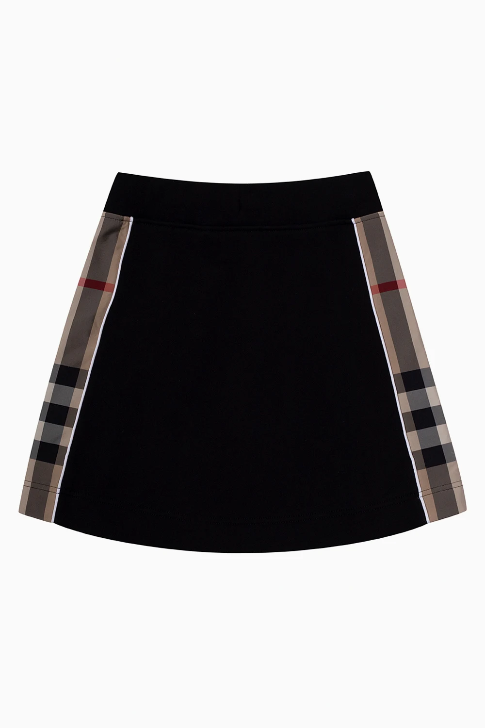 Czarna, dresowa spódnica Burberry Kids. Wykonana z bawełny. W pasie wszyta guma ściągana trokami. Po bokach ozdobne wstawki ze wzorem w kratę w kolorze beżowo-czarno-czerwonym.