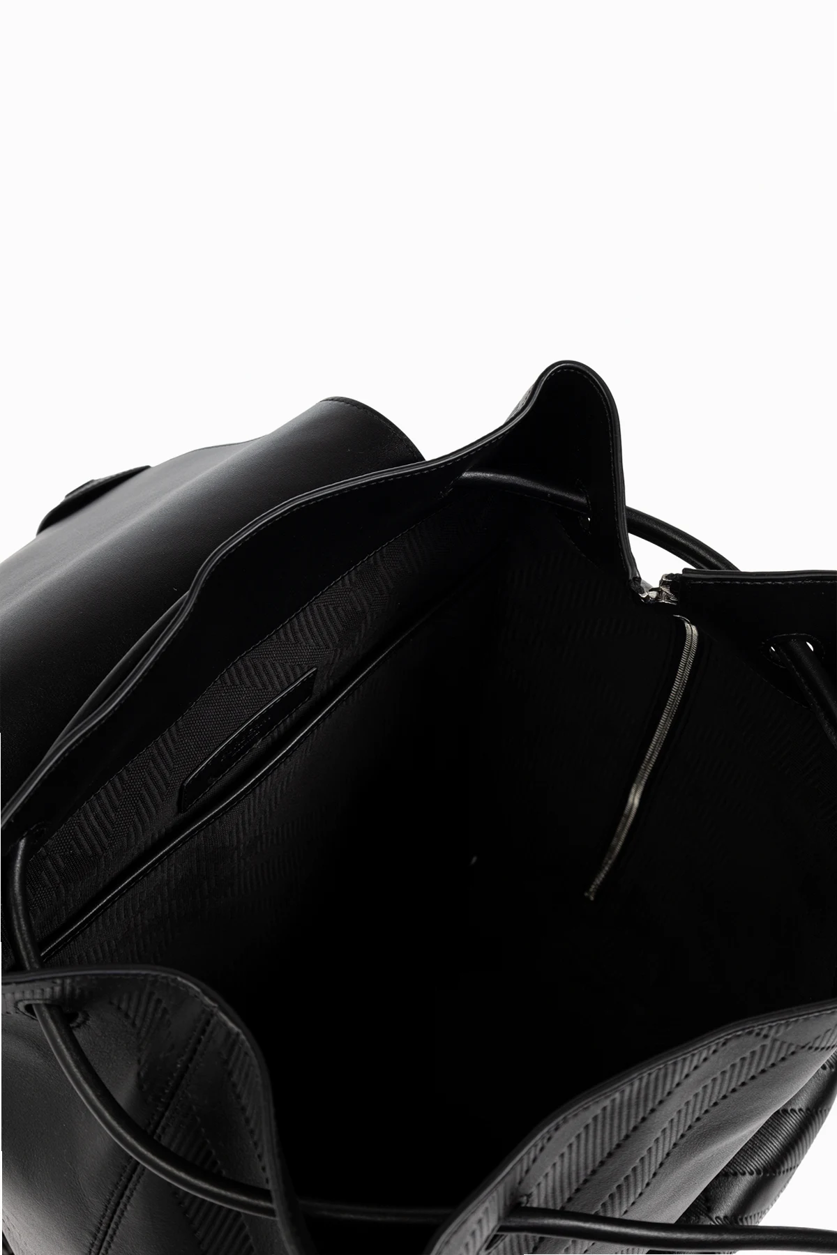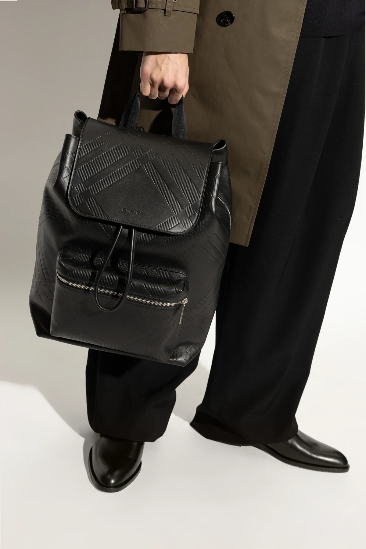 Na powierzchni skóry widoczny jest subtelny, geometryczny wzór, który nadaje mu niebywałego charakteru, a metalowy suwak i wytłoczone logo projektanta na klapie podkreślają jego ekskluzywność. Wnętrze, wykończone bawełną i lnem, oferuje doskonałą organizację dzięki komorze głównej i wsuwanej kieszeni.
