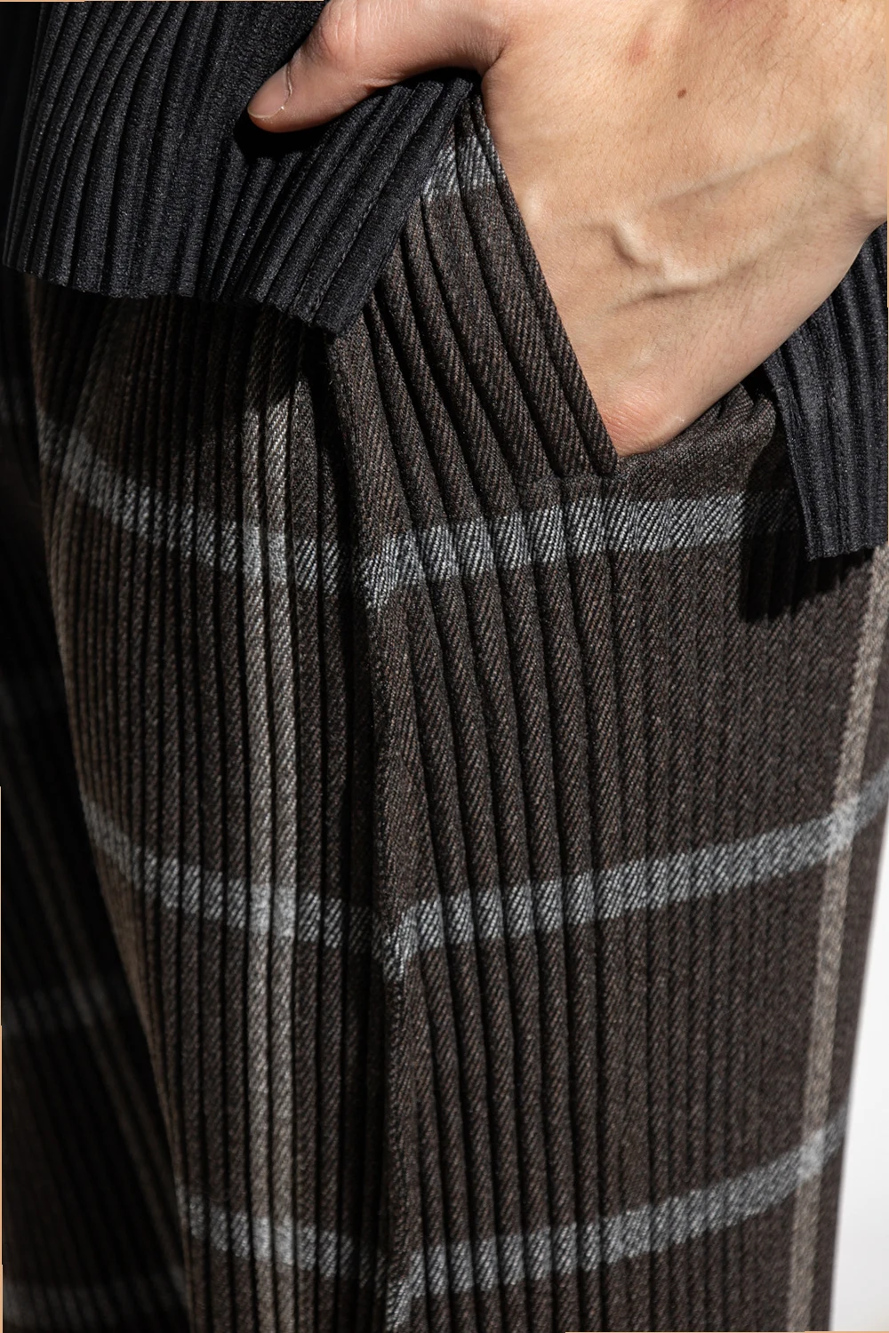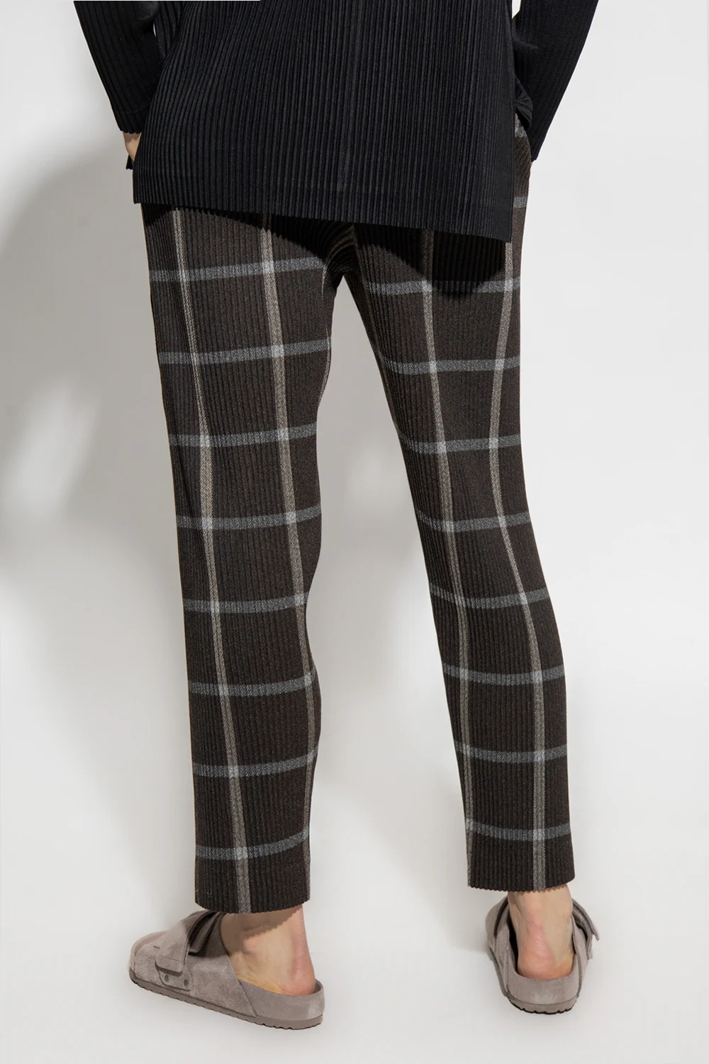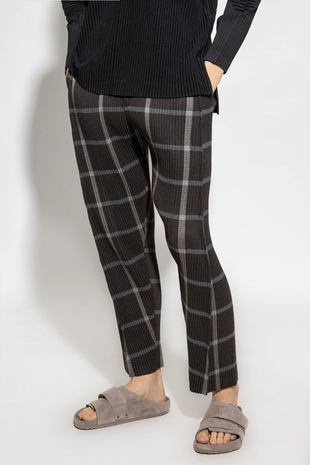 Szare spodnie Issey Miyake Homme Plisse. W pasie wszyta guma. Ozdobione wzorem w kratę. Dwie kieszenie wsuwane. Lekko zwężane nogawki.