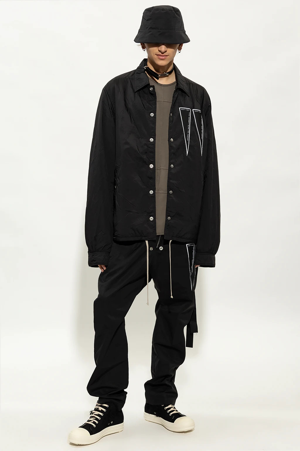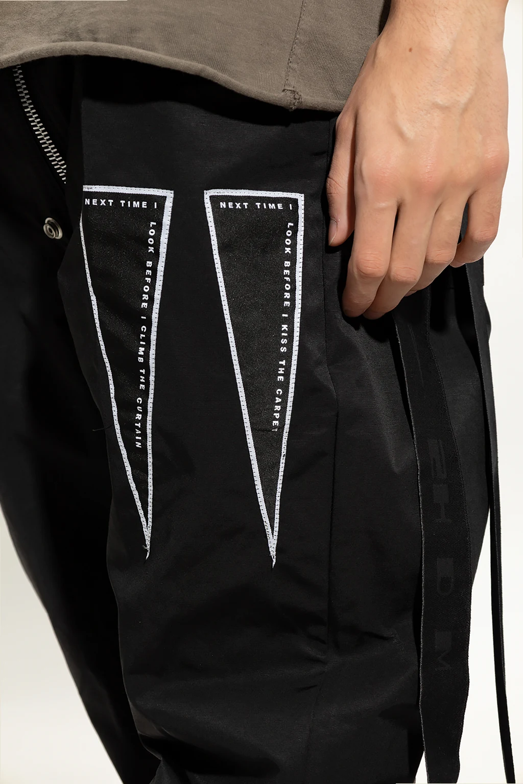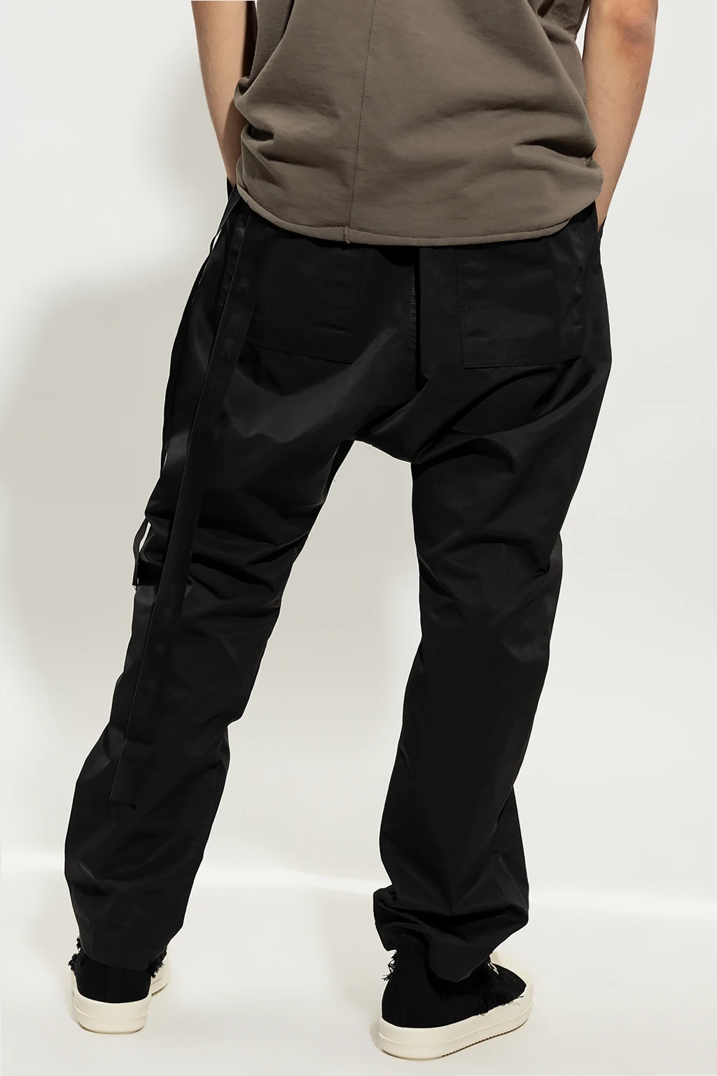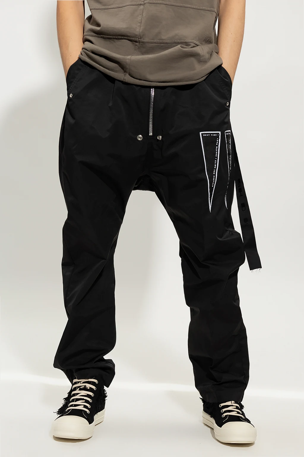 Czarne spodnie Rick Owens DRKSHDW. Zapinane na zamek i ściągane beżowymi trokami. Z przodu biało-czarne naszywki. Cztery kieszenie, dwie z przodu i dwie z tyłu z patką zapinaną na zatrzask. Lekko zwężane nogawki.