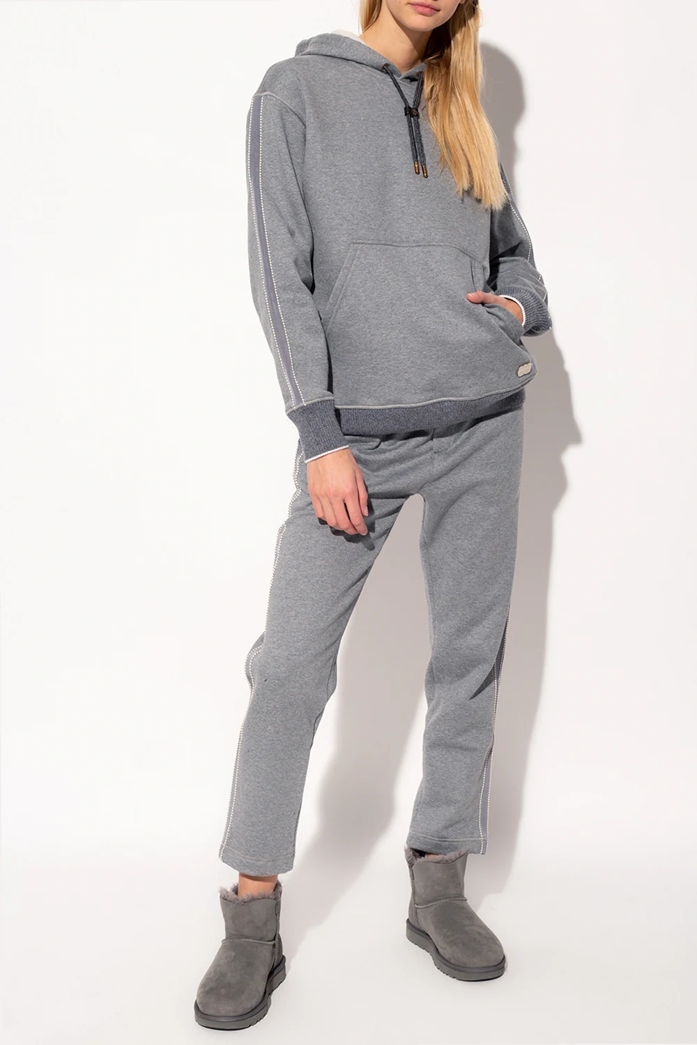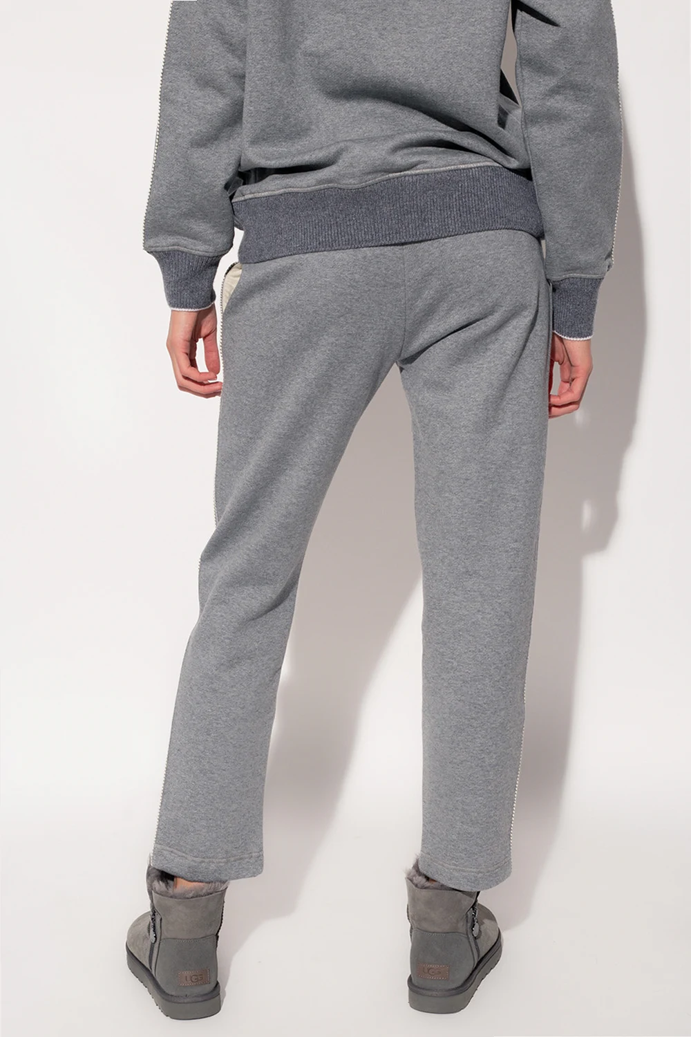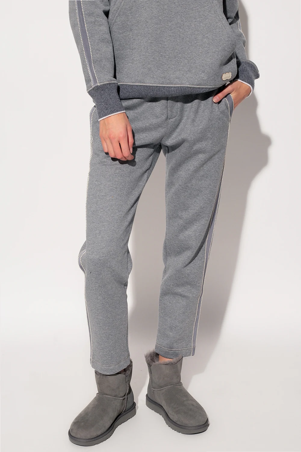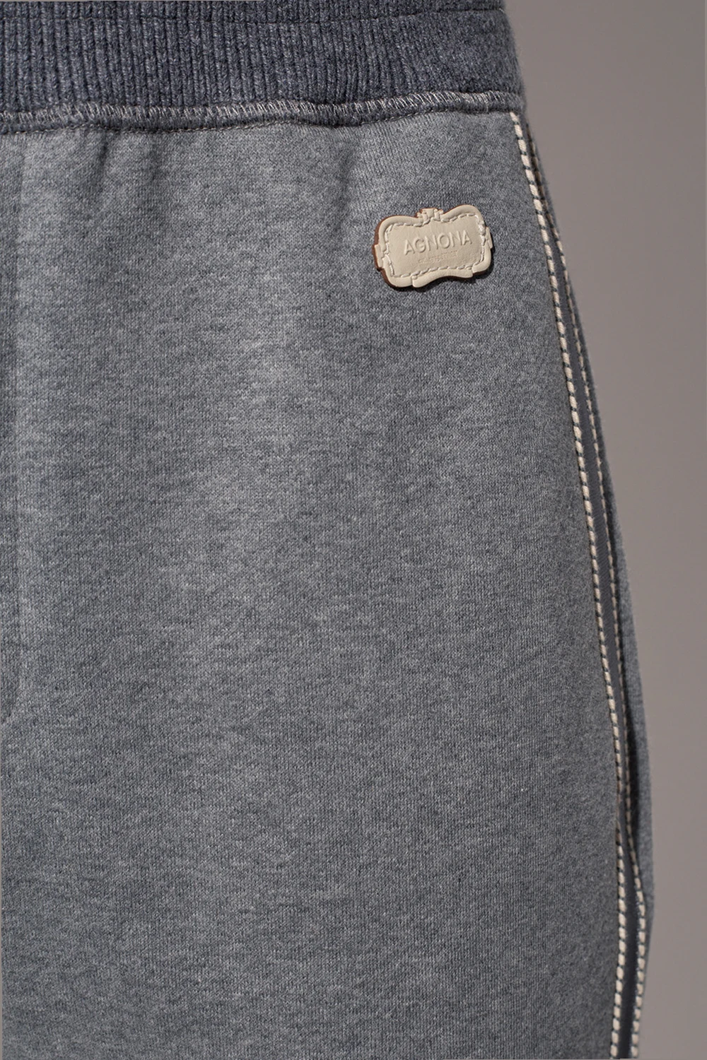 Szare spodnie dresowe Agnona. Wykonane z bawełny. Wykończone kaszmirem. W pasie ściągane trokami. Skórzana naszywka z wypukłym logo w kolorze kremowym. Trzy wsuwane kieszenie: dwie z przodu i pojedyncza kieszeń z tyłu. Zwężane nogawki.