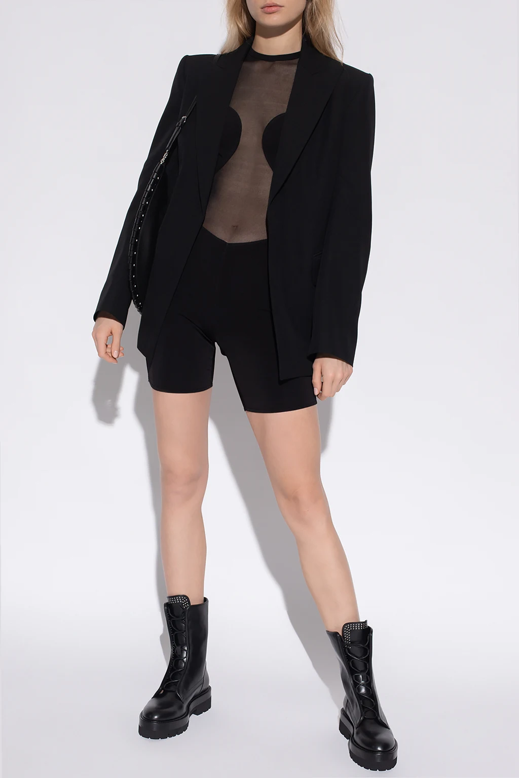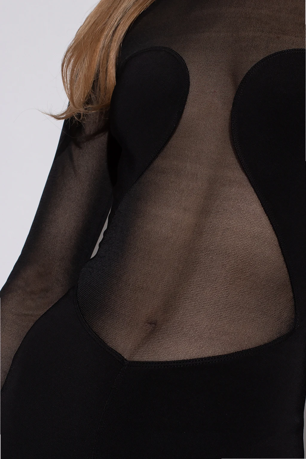 Czarne body Alaia. Zapinane z tyłu na kryty zamek. Ozdobione transparentnymi wstawkami. Długie, transparentne rękawy. Okrągły dekolt wykończony lamówką. Krótkie nogawki.