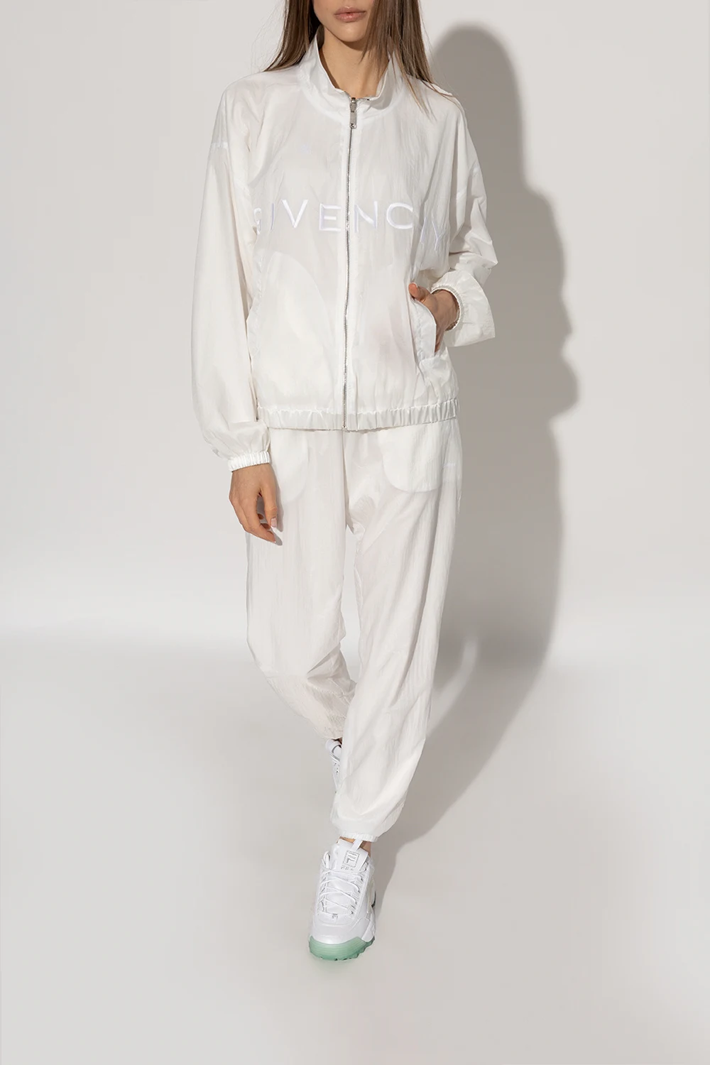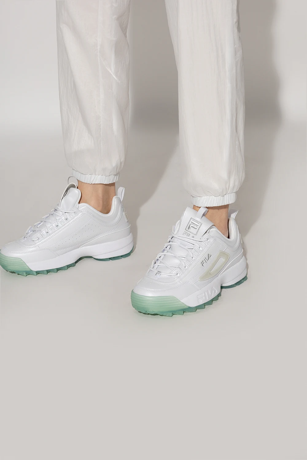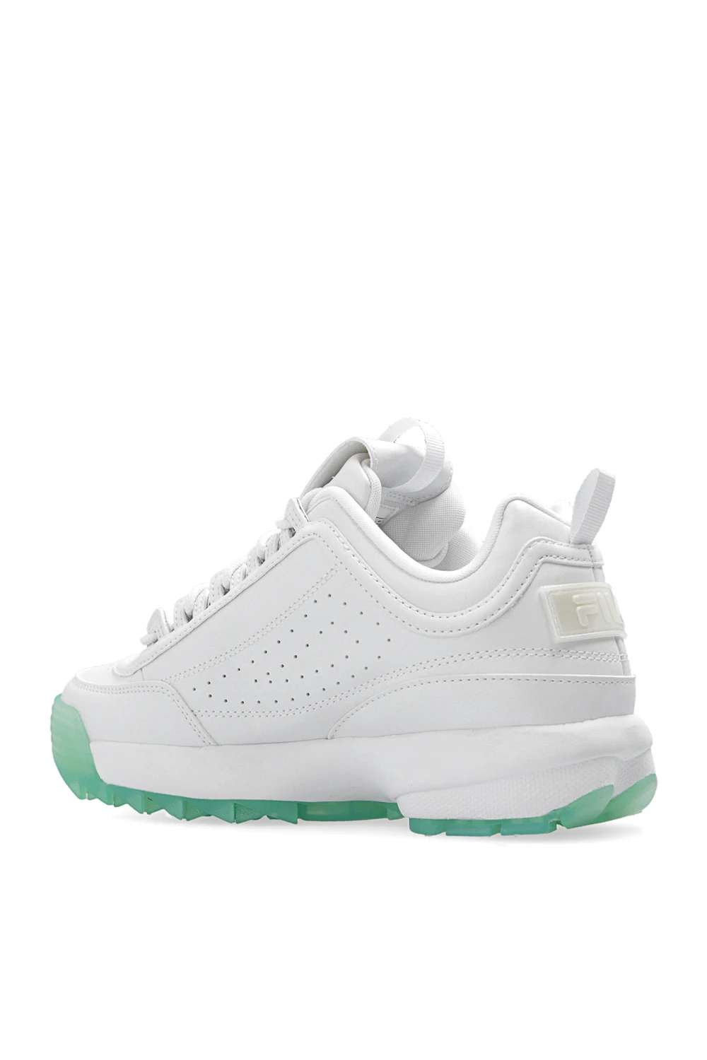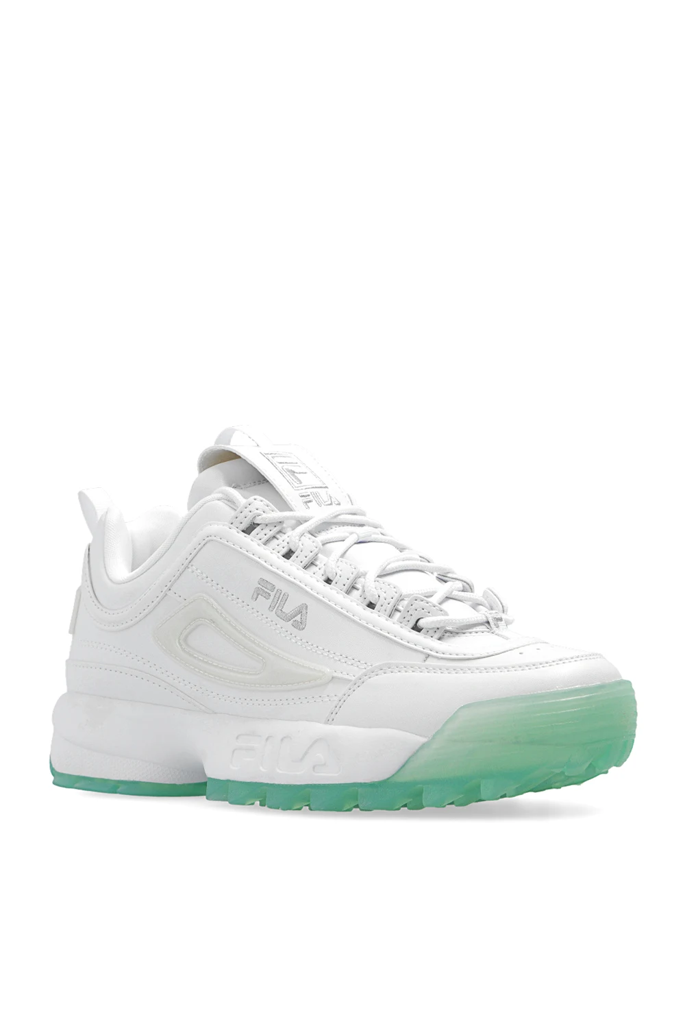 Białe, sznurowane buty sportowe, model ‘Disruptor WMN’ Fila. Wykonane z materiału imitującego skórę. Ozdobione wyszytym wzorem z logo w kolorze srebrnym oraz dekoracyjnymi aplikacjami. Zielononiebieska, gumowa podeszwa.
