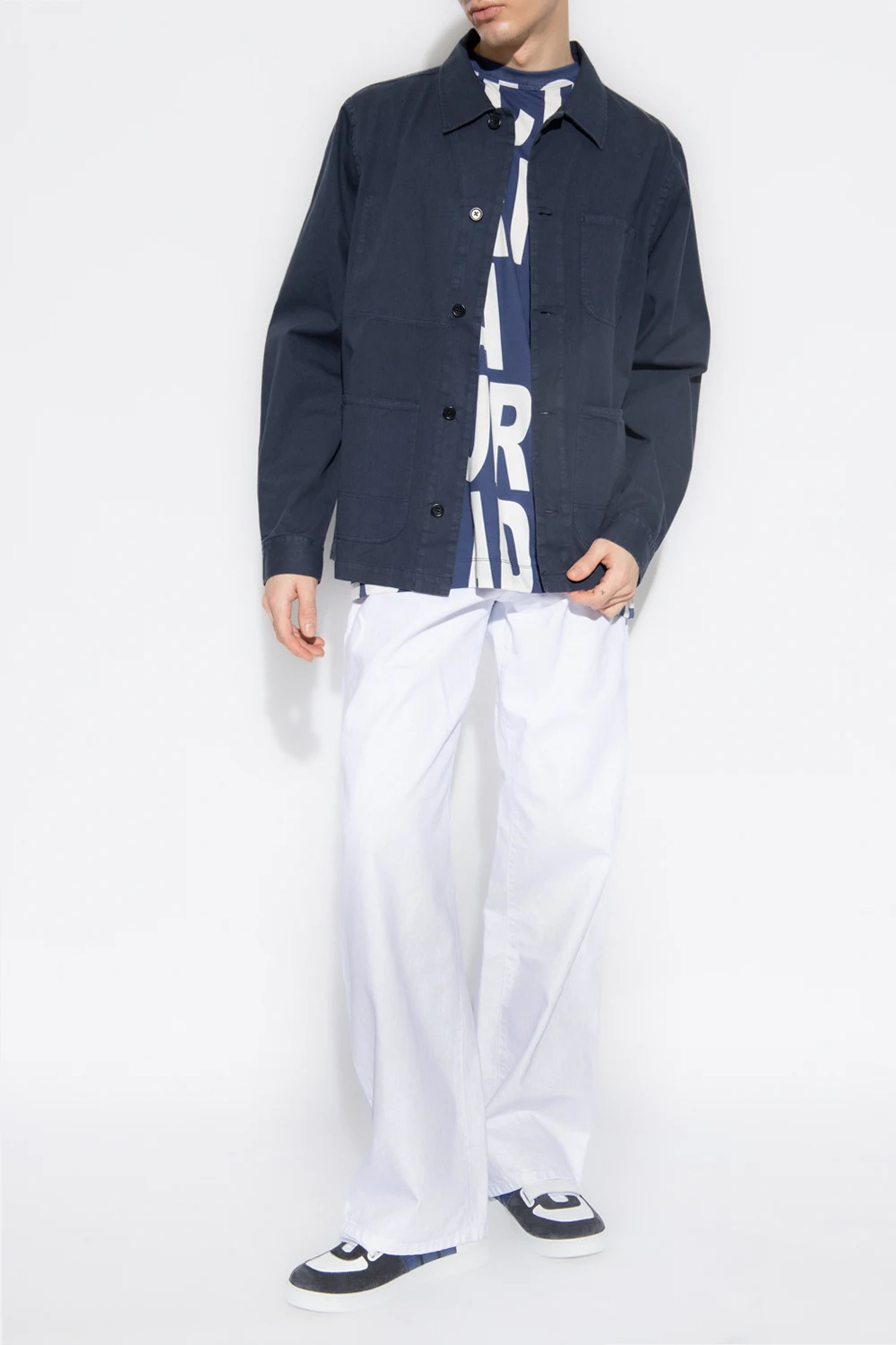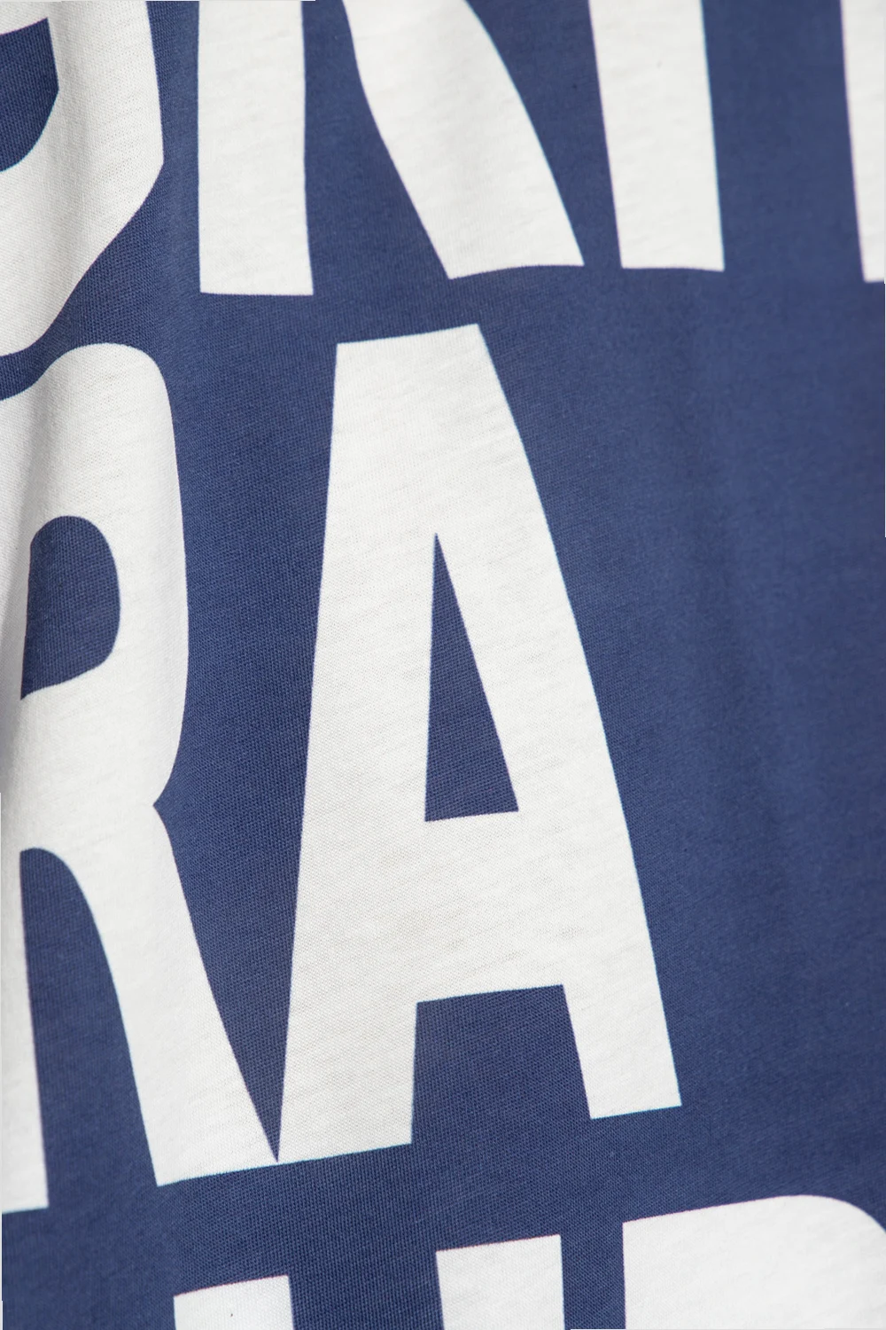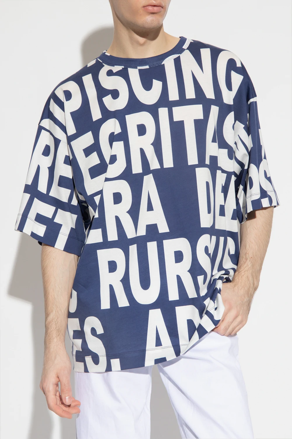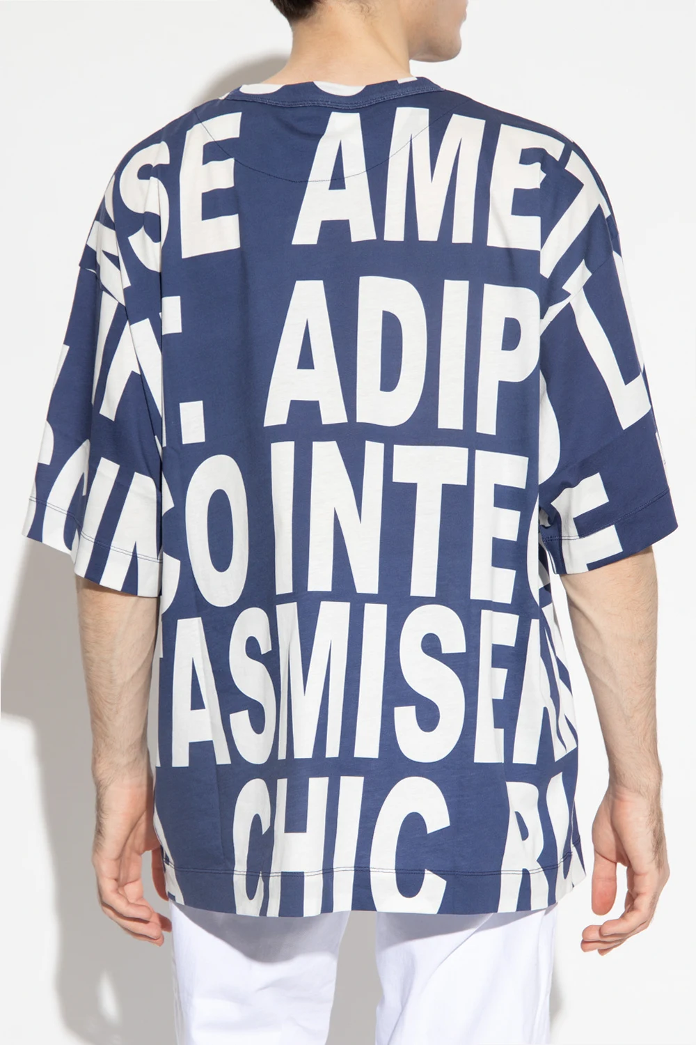 Niebiesko-biały t-shirt Dries Van Noten. Wykonany z bawełny. Ozdobiony wzorem z logo. Okrągły dekolt wykończony ściągaczem. Krótkie rękawy.