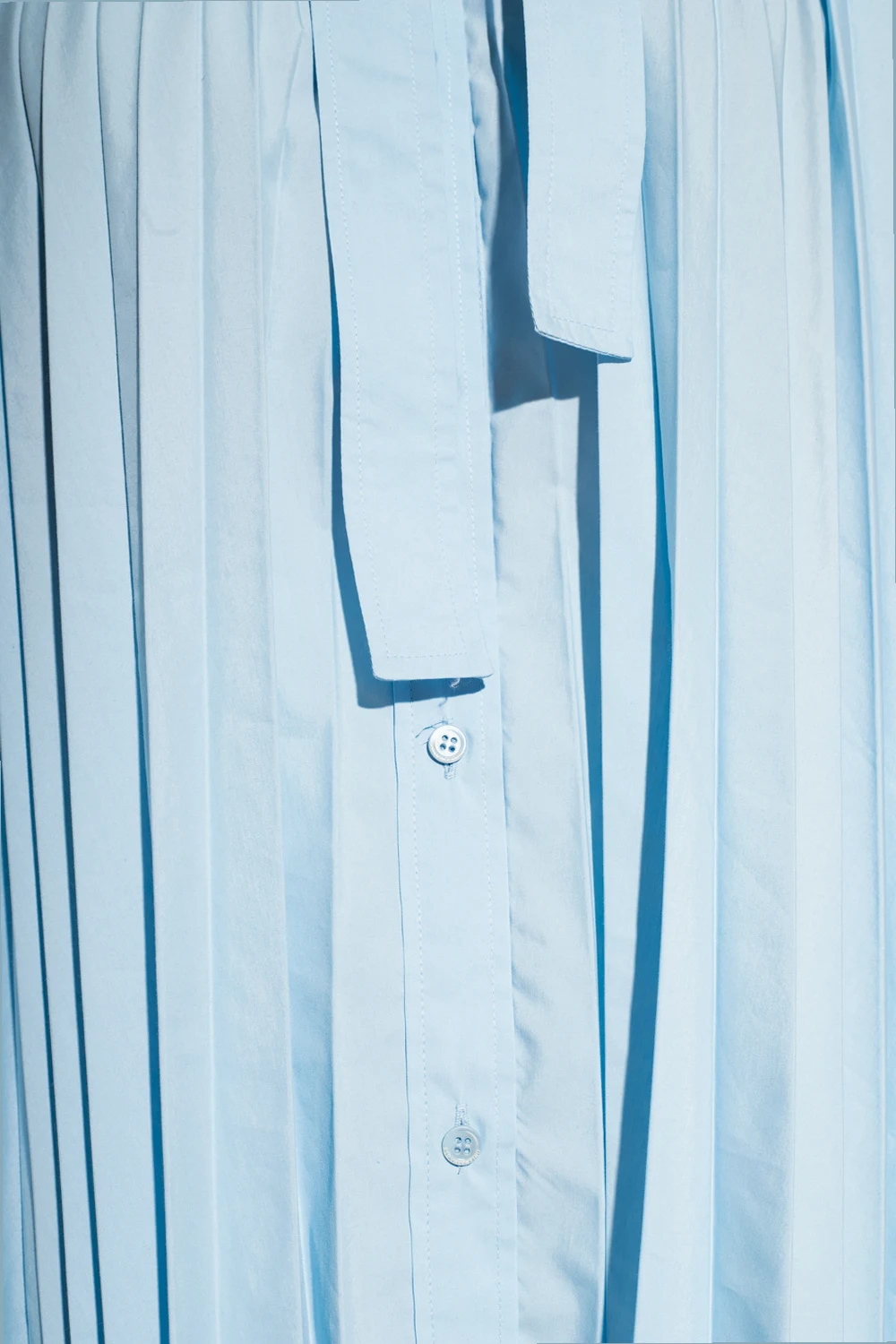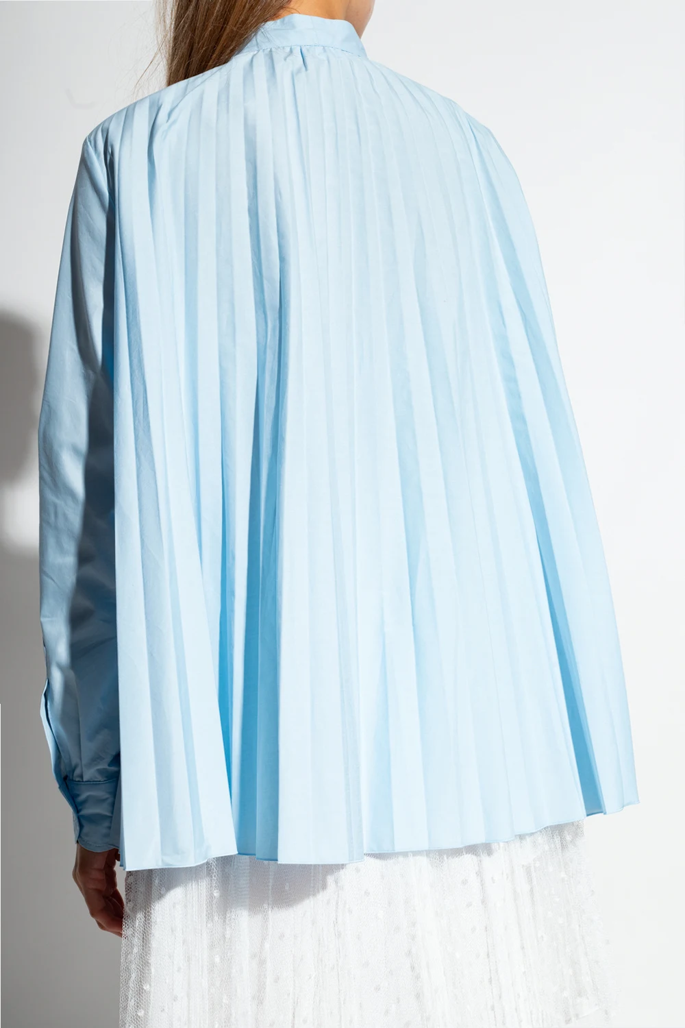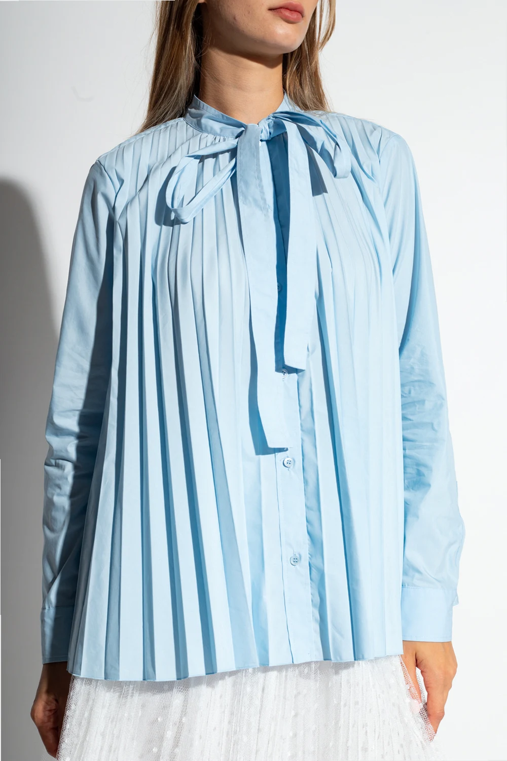 Jasnoniebieska, plisowana koszula o linii ‘A’ Red Valentino. Zapinana na guziki i wiązana pod szyją. Długie rękawy zakończone mankietami zapinanymi na guziki.