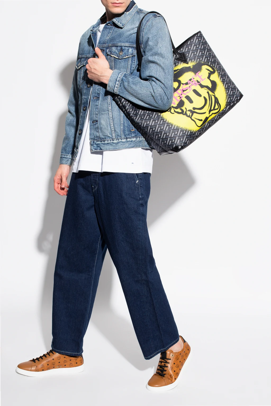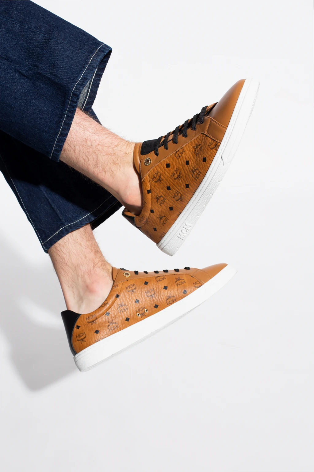 Brązowe, sznurowane buty sportowe MCM. Ozdobione wzorem z logo w kolorze czarnym. Biała, gumowa podeszwa.