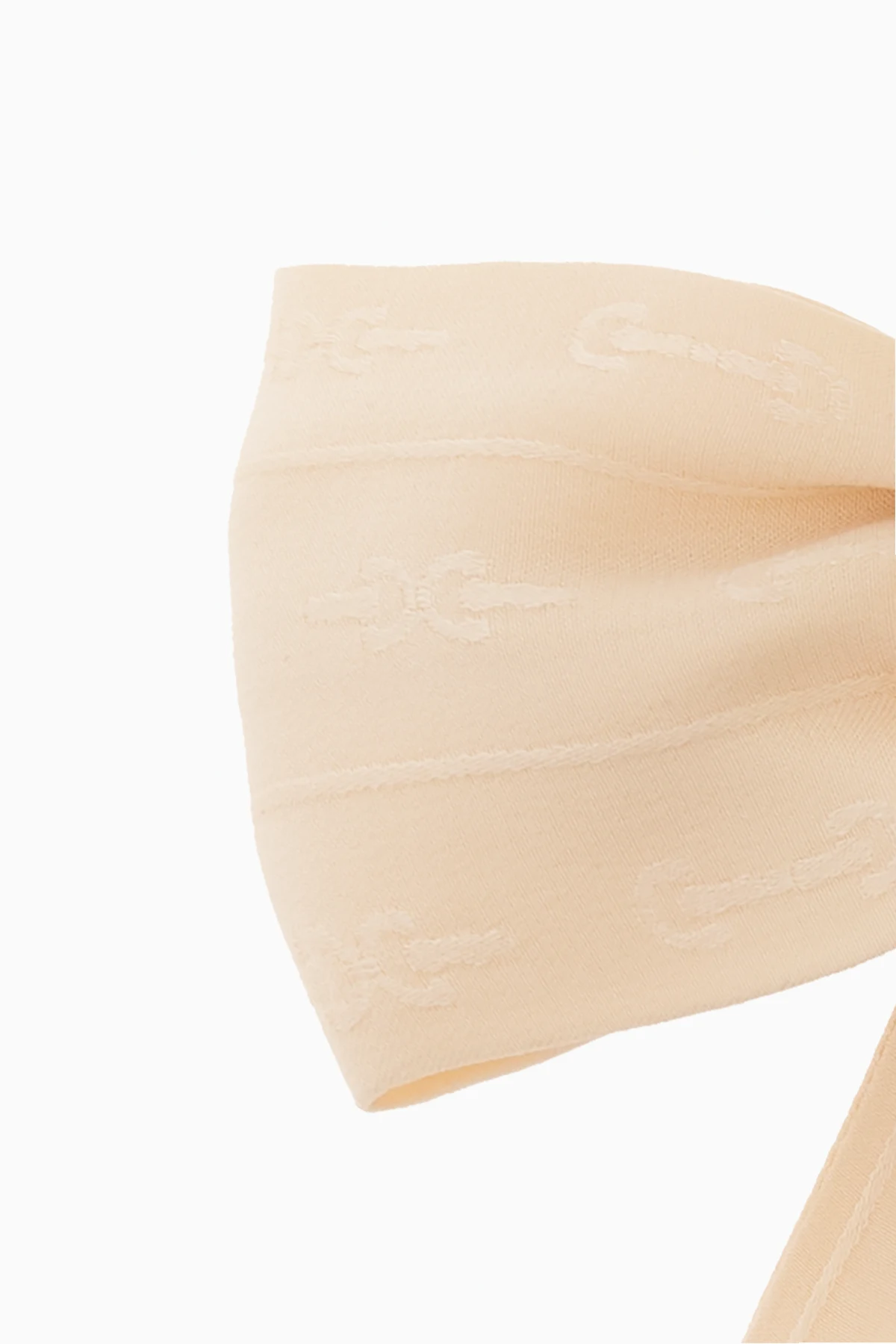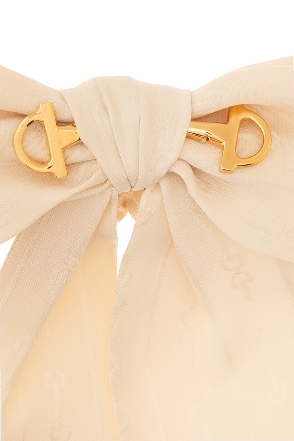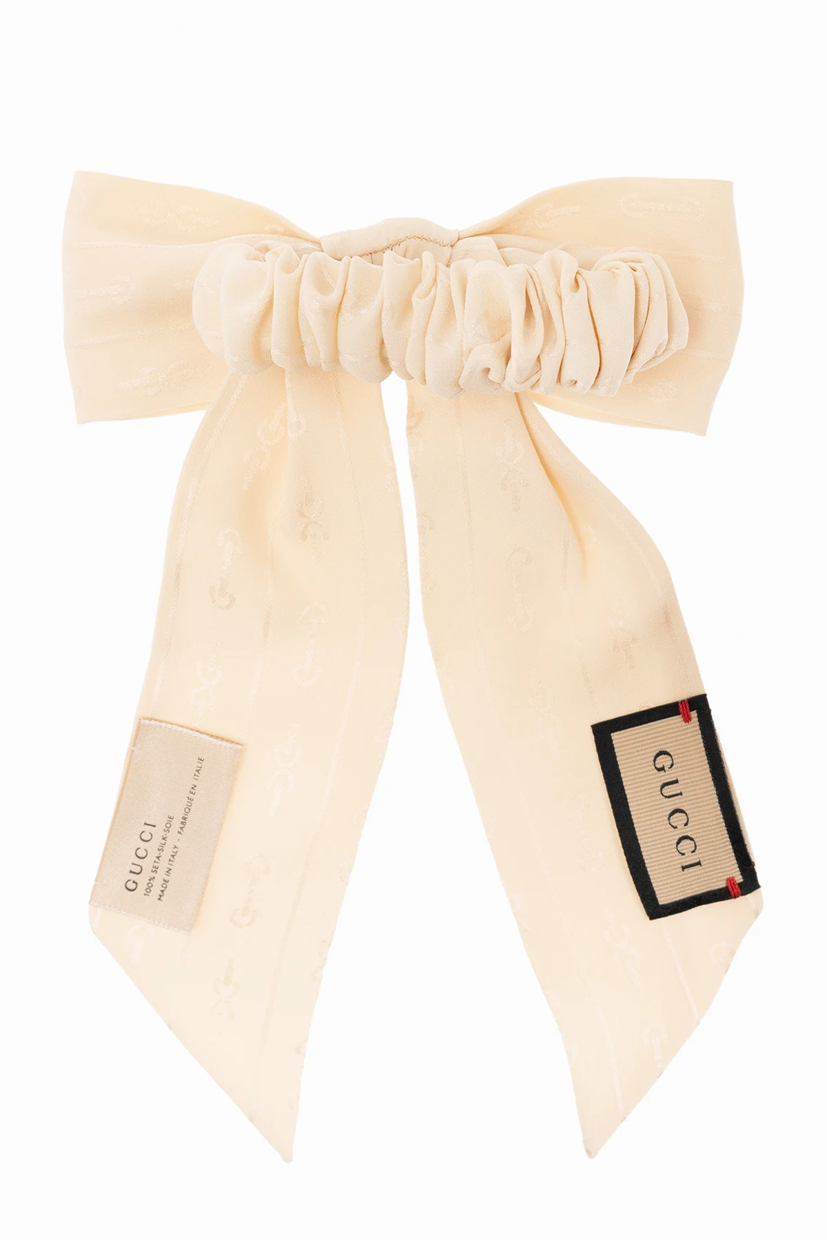 Kremowa, jedwabna gumka do włosów Gucci. Ozdobiona wzorem oraz metalową aplikacją w kształcie charakterystycznego wędzidła w kolorze złotym. Naszywka z logo. Dekoracyjna kokarda.