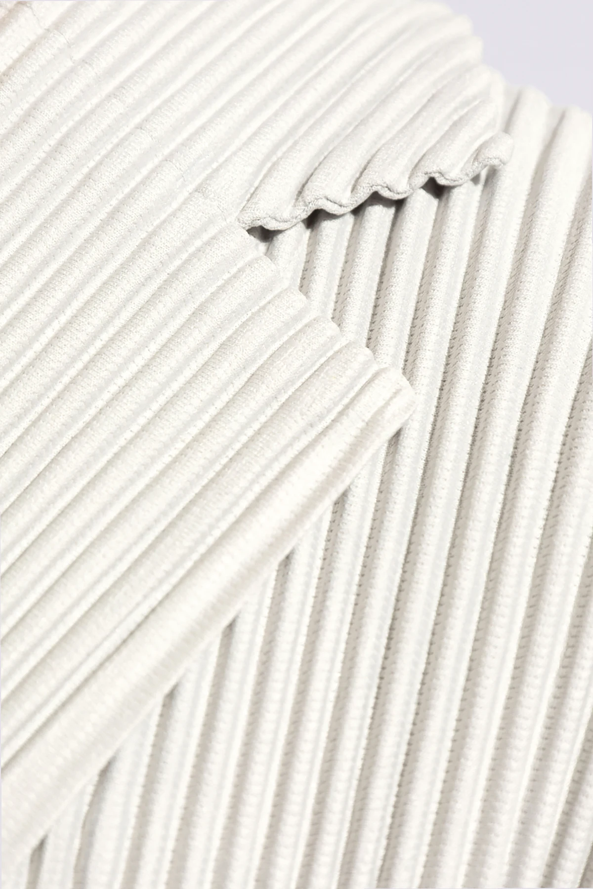 Wyjątkowa elegancja dzięki plisowanej strukturze materiału i jasnoszaremu kolorowi.