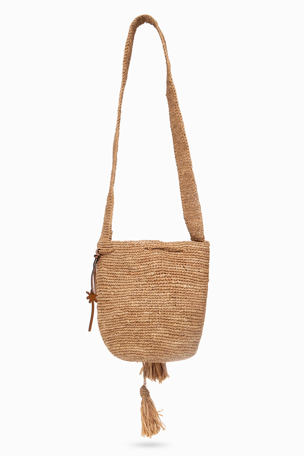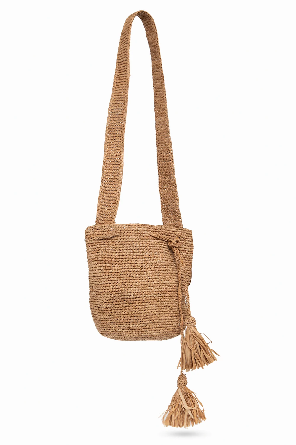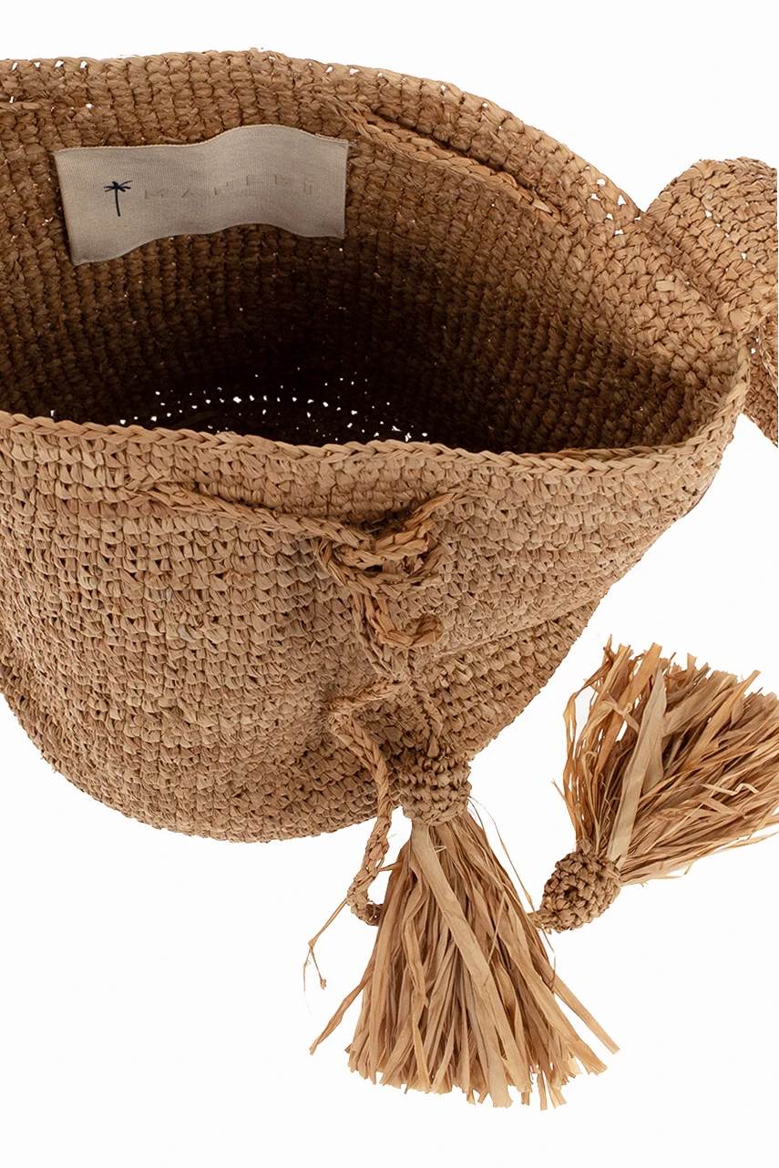 Beżowo-brązowa torba na ramię, model ‘Beach Bucket’ Manebi. Wykonana z naturalnej rafii. Ozdobiona wzorem w pasy, skórzaną aplikacją oraz frędzlami. Pas na ramię. Wewnątrz komora.