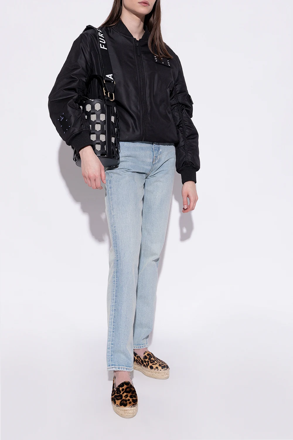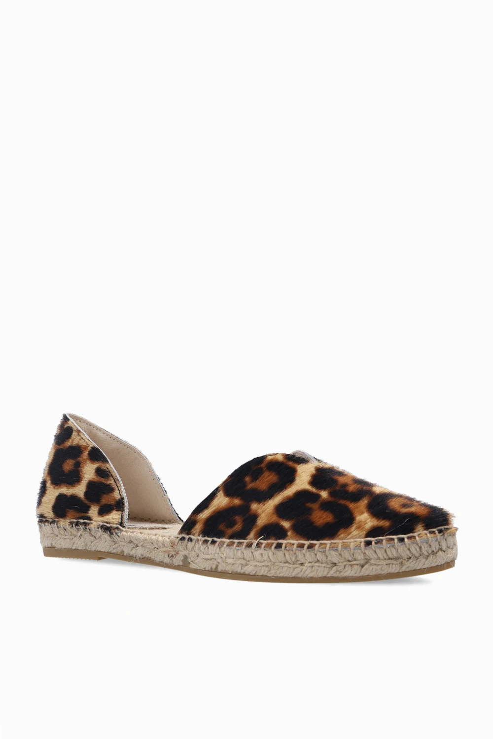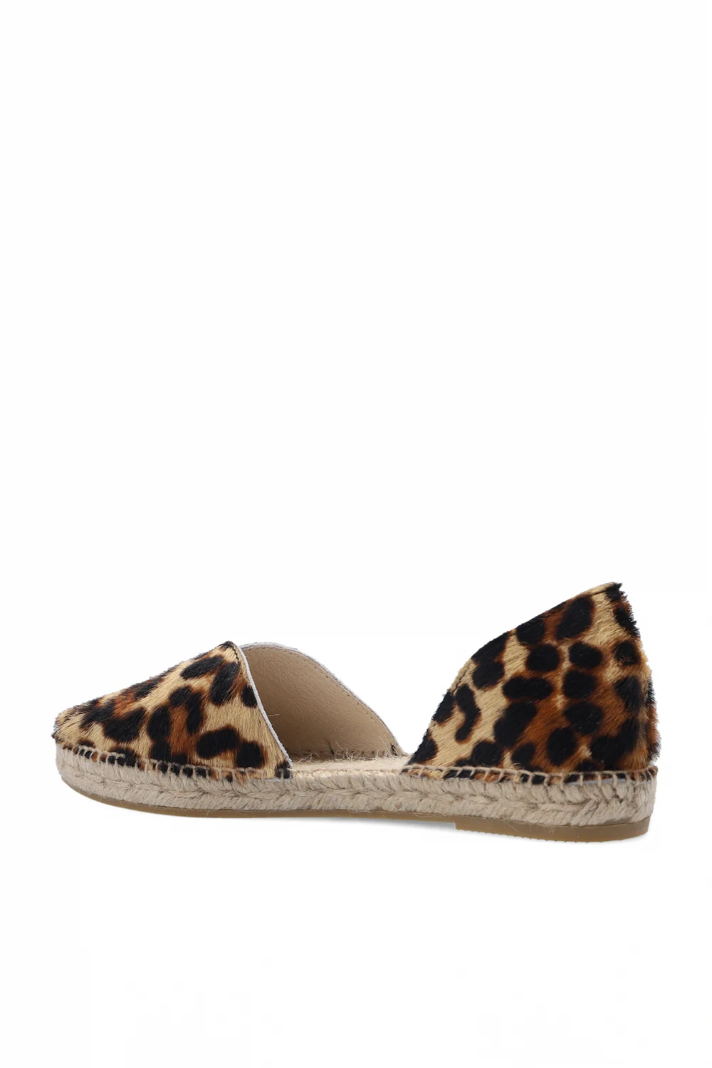 Brązowo-beżowe espadryle z wycięciem, model ‘Hampton’ Manebi. Wykonane z włosia cielęcego. Ozdobione wzorem z motywem zwierzęcym. Podeszwa wykonana z naturalnej juty wykończonej cienką warstwą kauczuku w kolorze beżowym.