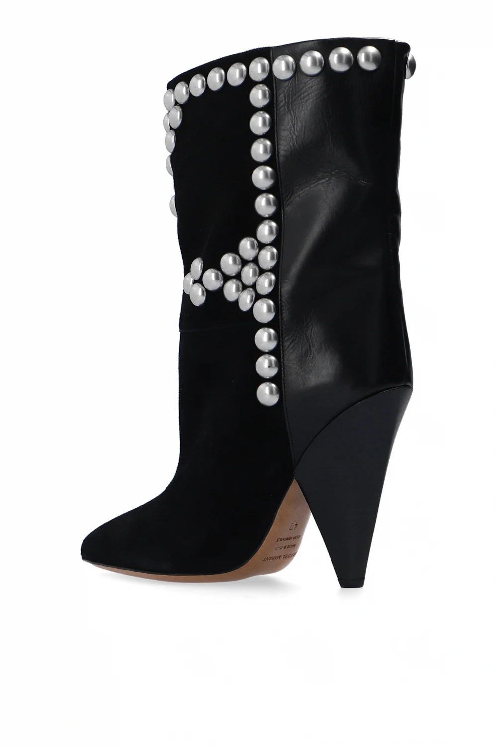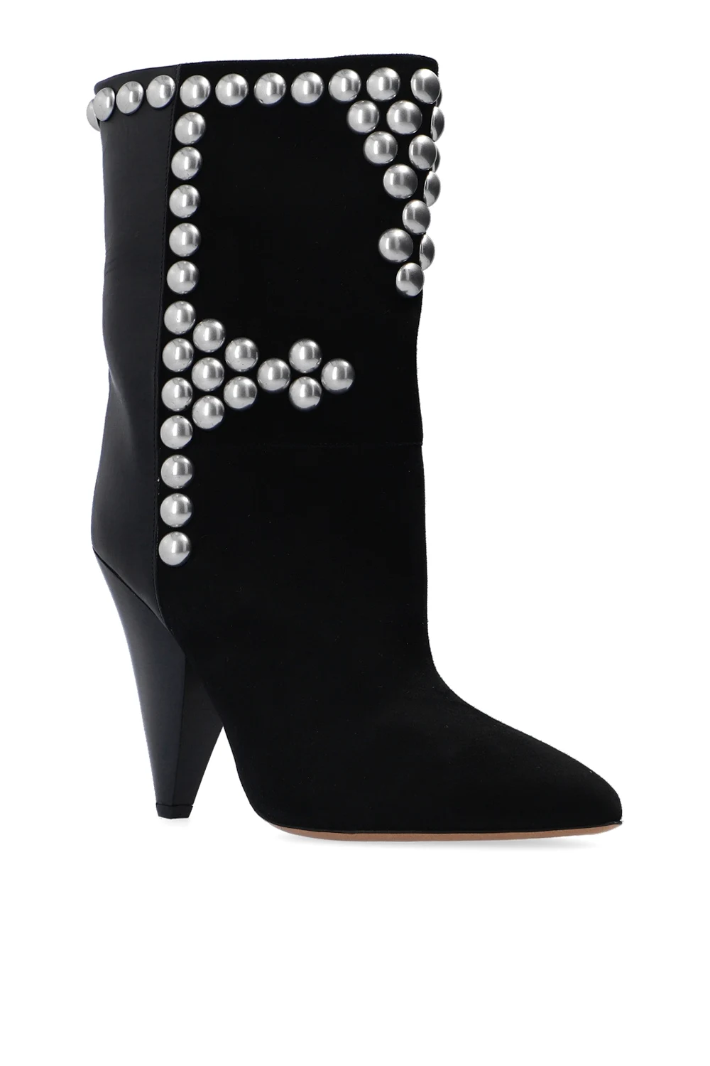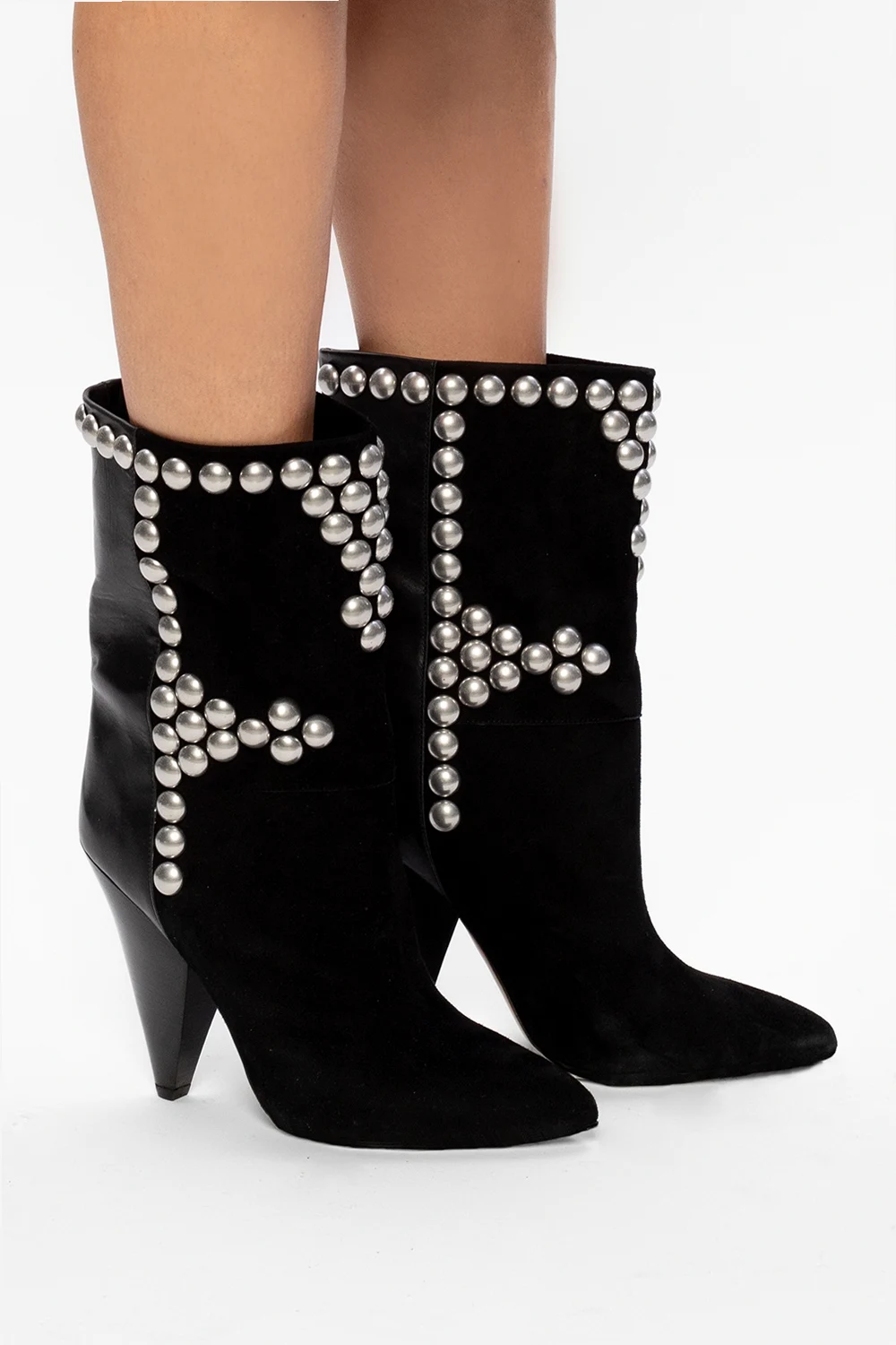 Czarne botki na obcasie, model ‘Layo’ Isabel Marant. Wykonane ze skóry i zamszu. Ozdobione ćwiekami w kolorze srebrnym. Nosek w szlic Beżowa, skórzana podeszwa.