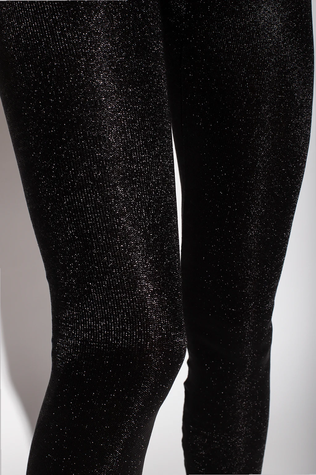 Czarne spodnie o obcisłym kroju, model ‘Amber’ Rick Owens Lilies. Wykonane z dwóch warstw materiału: miękkiego dżerseju wewnątrz oraz siateczki wykończonej połyskującą nicią na zewnątrz. W pasie wszyta guma. Długie nogawki.