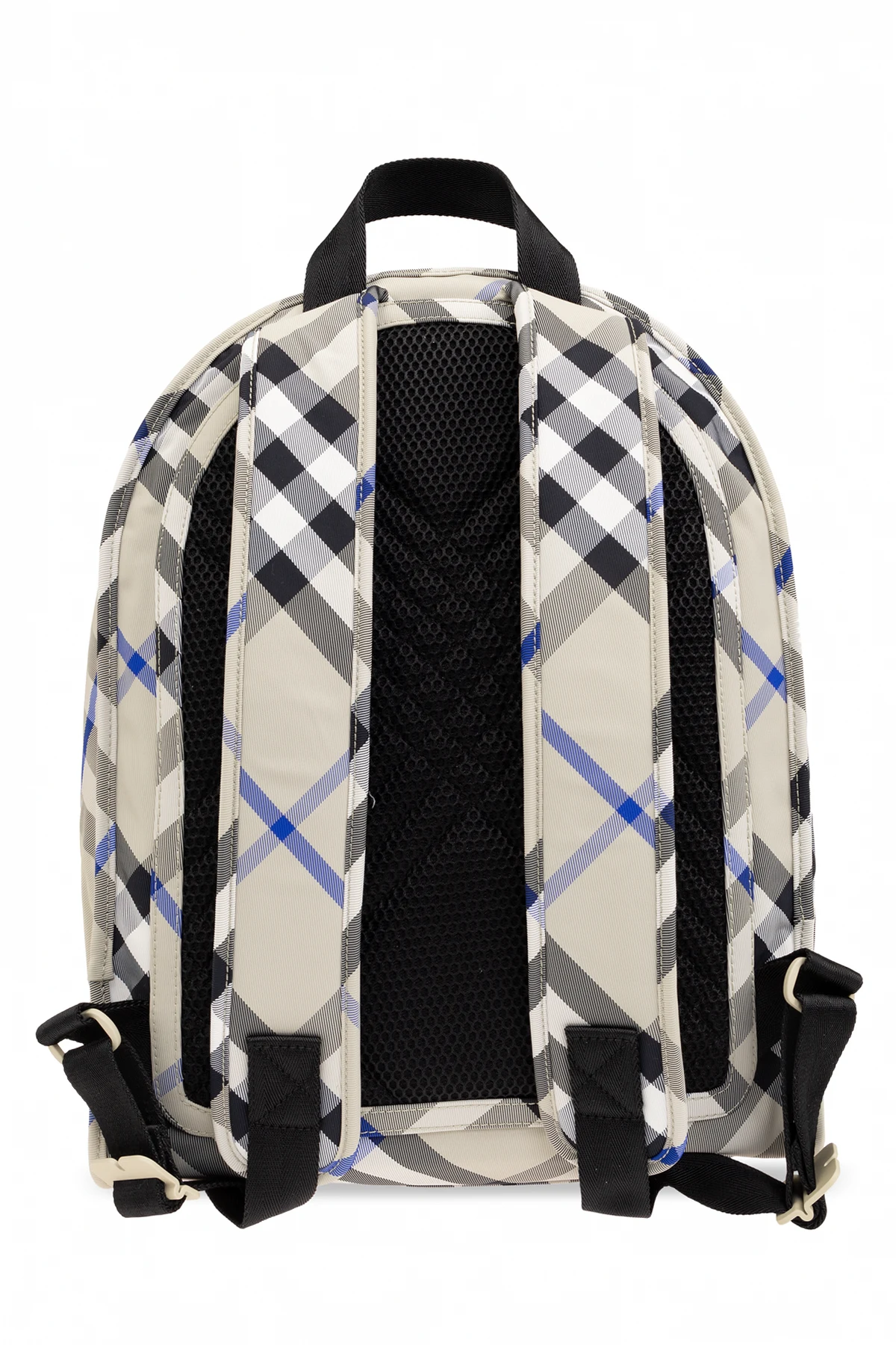 Przedstawiamy Państwu plecak Burberry , który łączy w sobie elegancję tradycyjnego wzornictwa z funkcjonalnością współczesnego designu. Jego charakterystyczny wzór w kratę, składający się z linii w kolorach czarnym, białym oraz akcentów w kolorze niebieskim, rozpościera się na jasnym, beżowym tle, tworząc kompozycję, która jest synonimem luksusu i klasy.