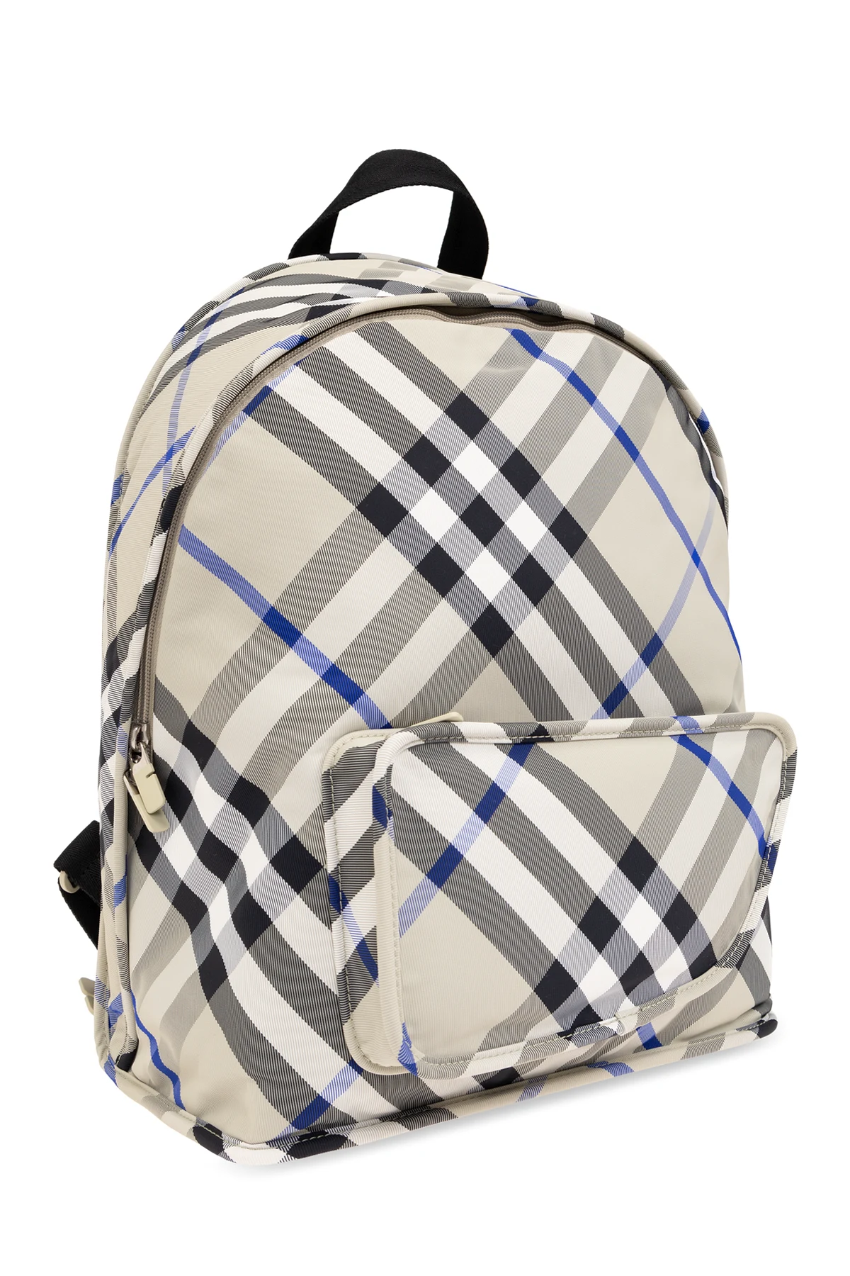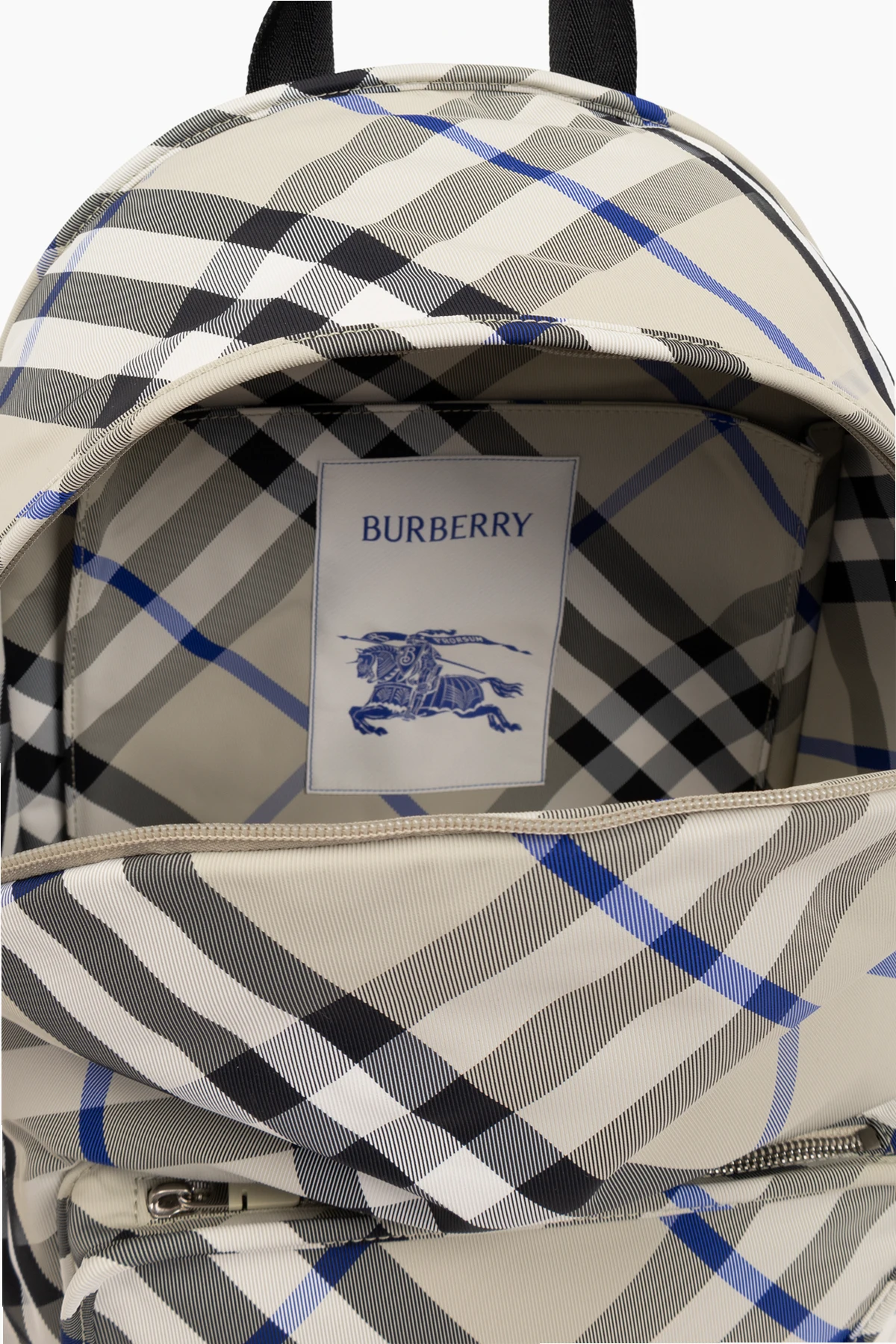 Na jednym ze zdjęć widoczne jest oznaczenie marki Burberry na wewnętrznej klapie przedniej kieszeni, co dodatkowo podkreśla ekskluzywny charakter tego plecaka.
