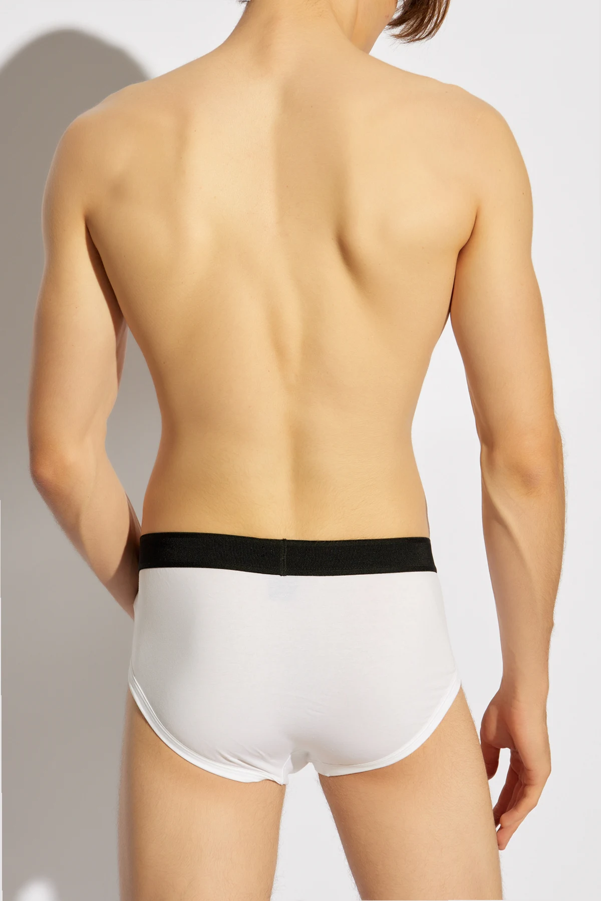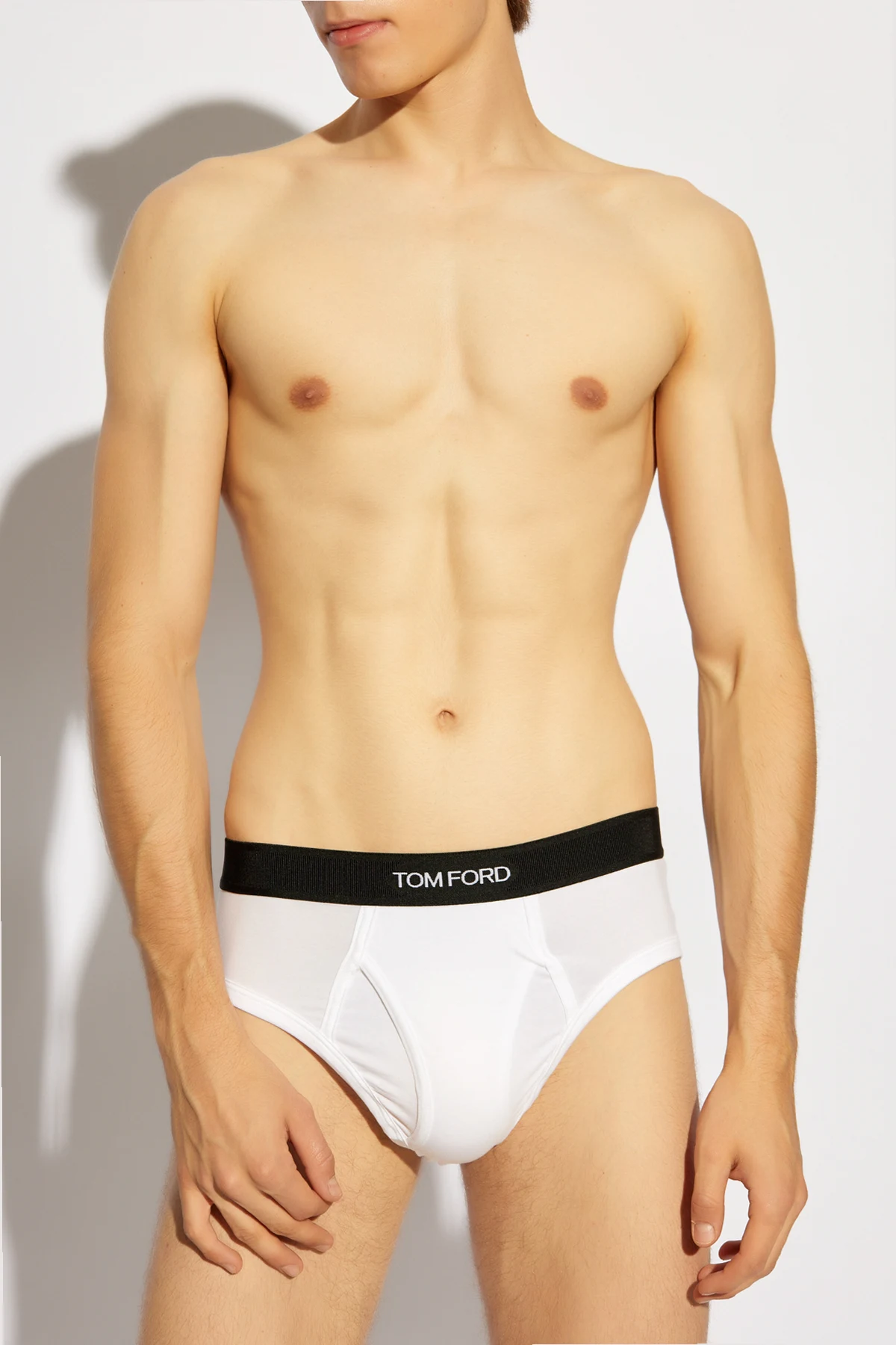 Charakterystyczny dla marki Tom Ford , szeroki, elastyczny pas w kolorze kontrastującej czerni, zdobi biały, wyraźnie widoczny napis projektanta. Jest to nie tylko wyznacznik luksusu, ale również element, który podkreśla przynależność do świata wysokiej mody. Delikatne wycięcia na nogach oraz gładki, elastyczny materiał sprawiają, że każdy ruch jest swobodny i pełen gracji.