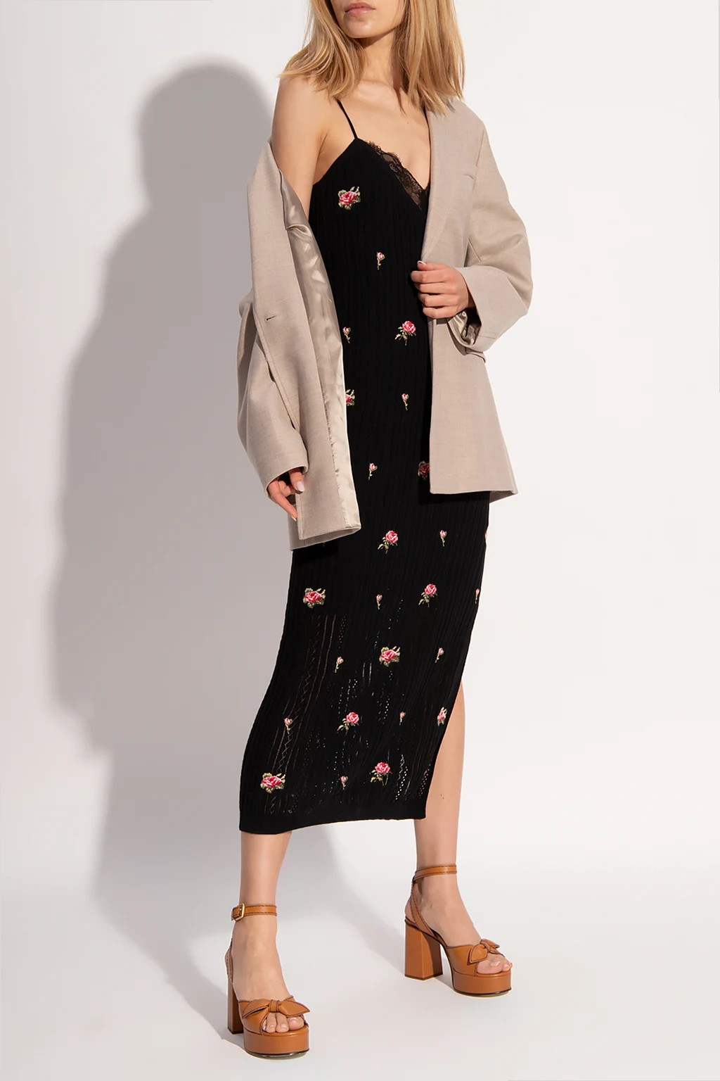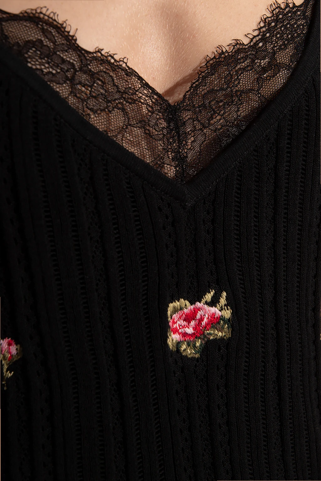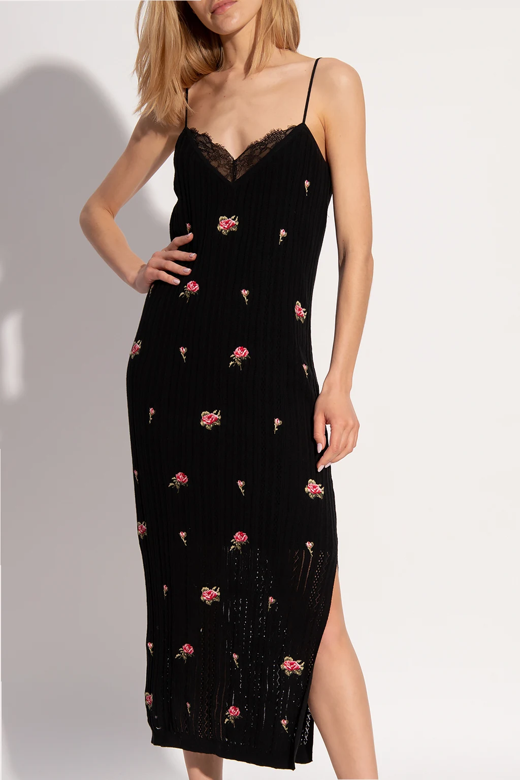 Czarna, dwuwarstwowa sukienka na ramiączkach Red Valentino. Wykonana z bawełny. Ażurowa warstwa zewnętrzna. Wykończona koronką. Wyszyty wzór z motywem kwiatowym. U dołu rozcięcia.