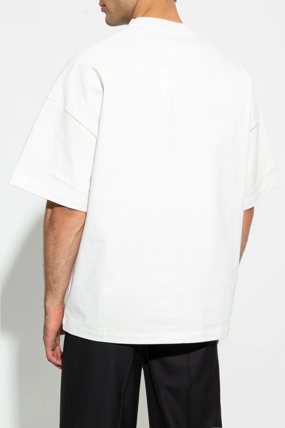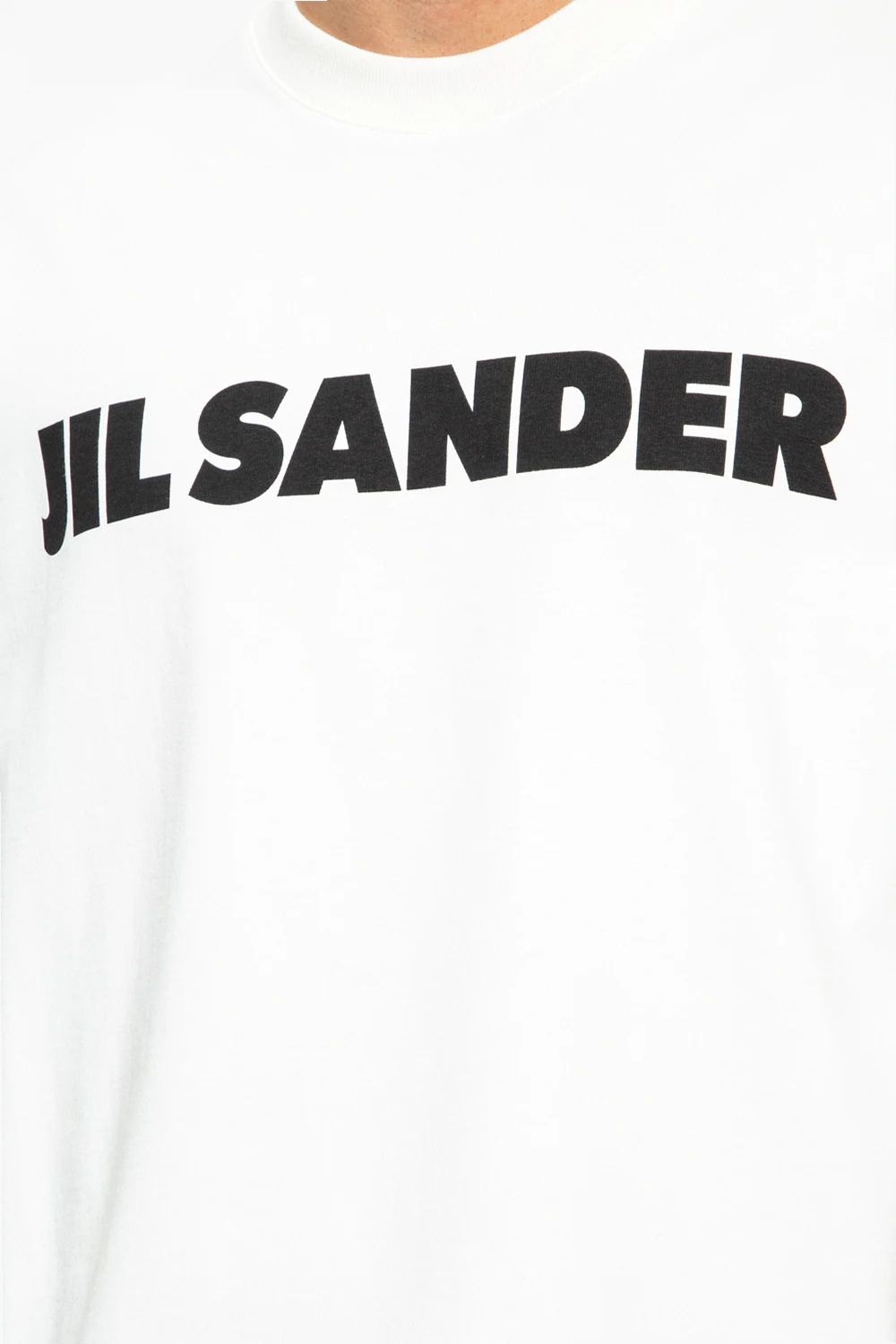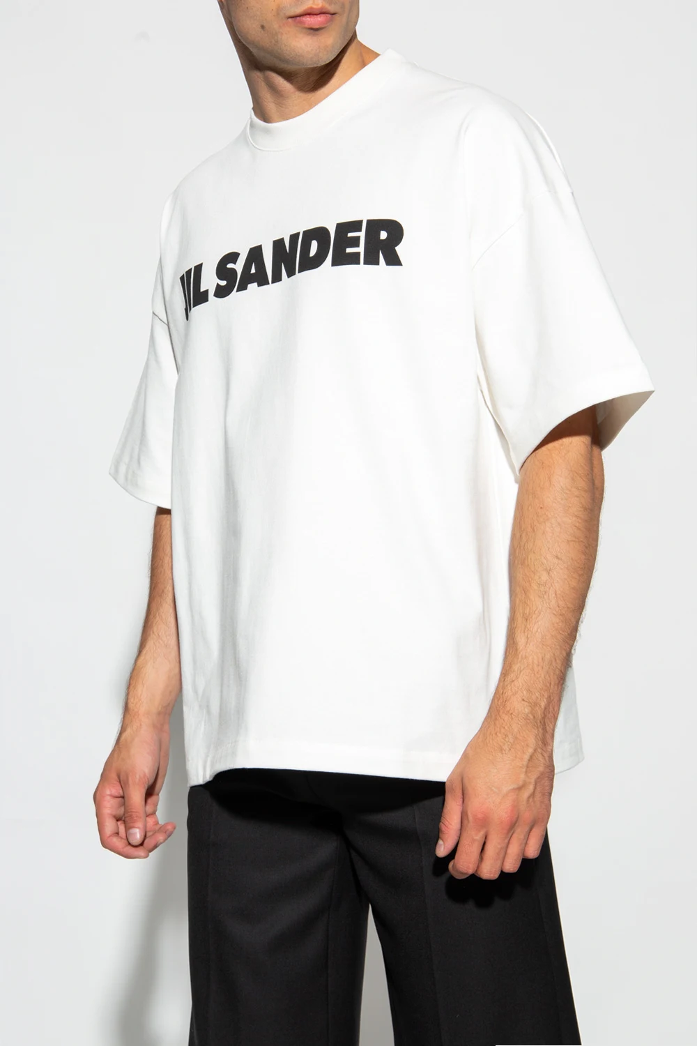 Kremowy t-shirt o luźnym kroju Jil Sander. Wykonany z bawełny. Z przodu ozdobiony nadrukowanym logo w kolorze czarnym. Okrągły dekolt wykończony ściągaczem. Krótkie rękawy.
