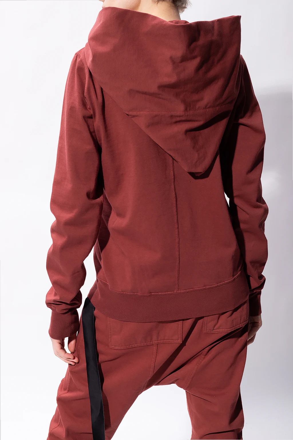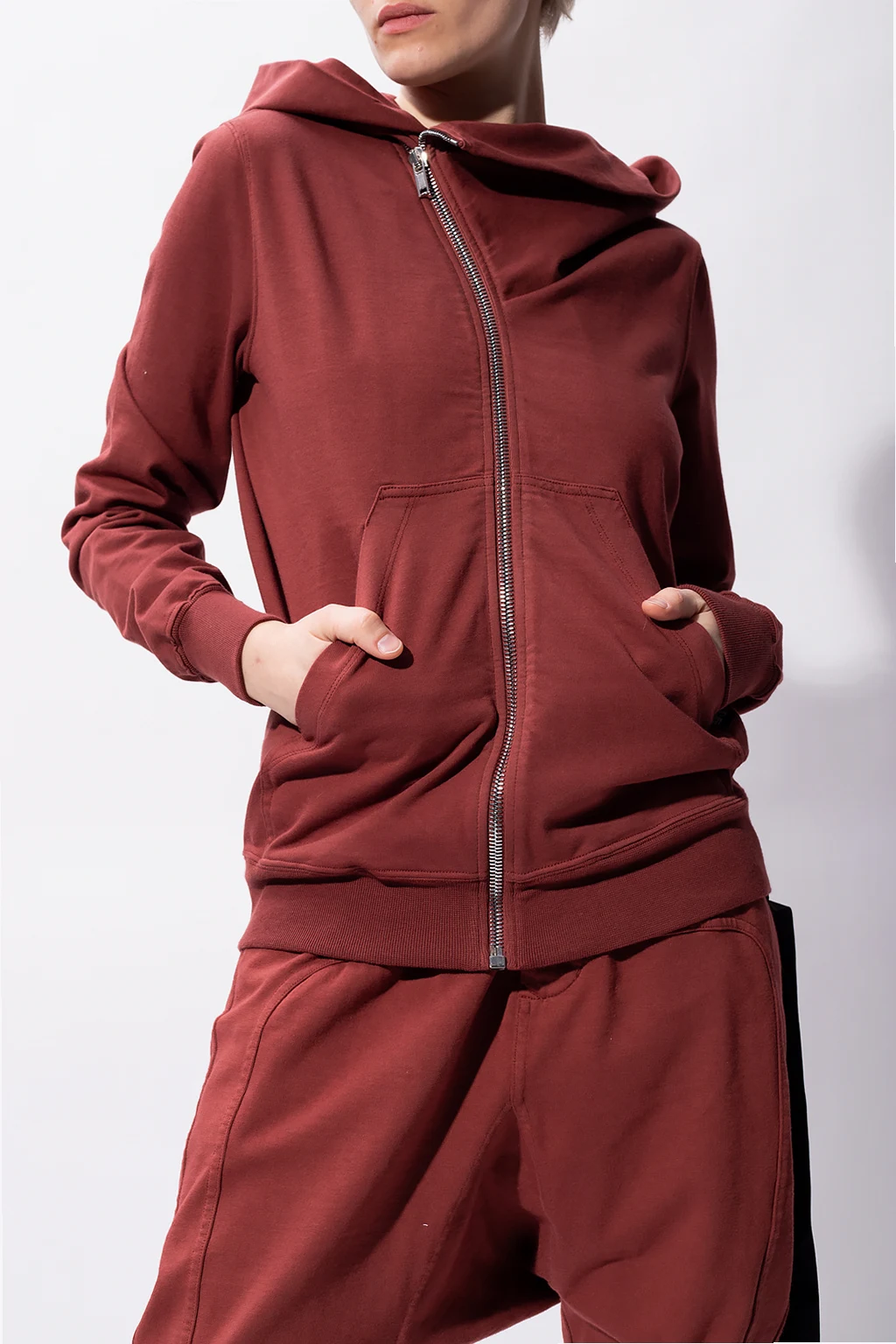 Bordowa bluza z kapturem Rick Owens DRKSHDW. Wykonana z bawełny. Asymetryczny zamek. Naszywka z logo. Dwie wsuwane kieszenie. Zakończona ściągaczami.