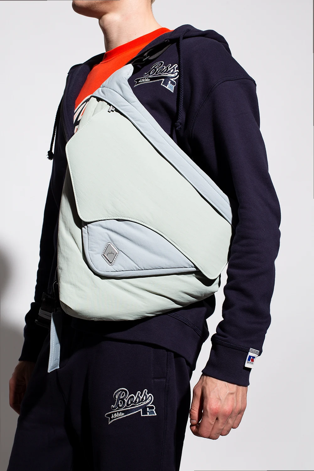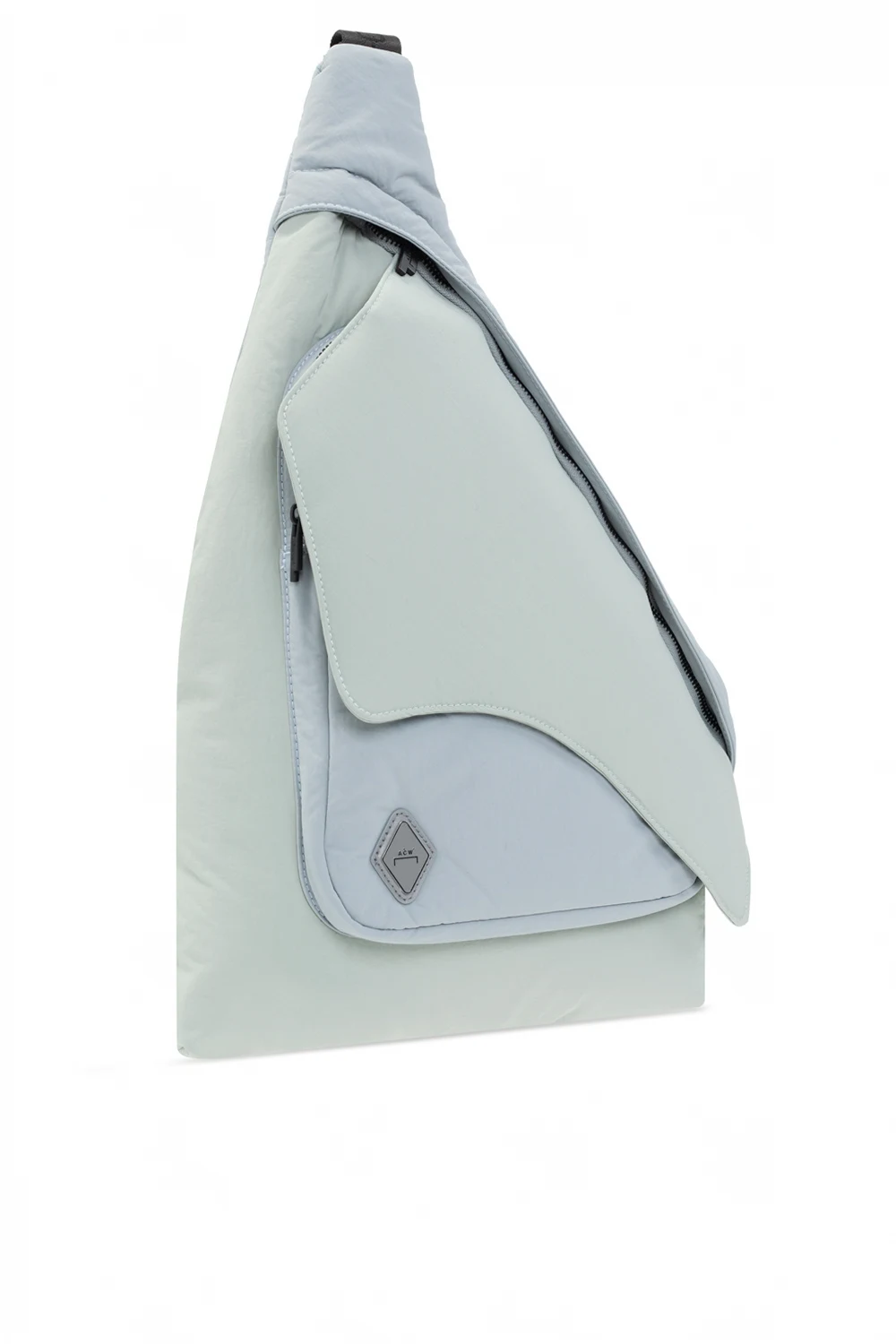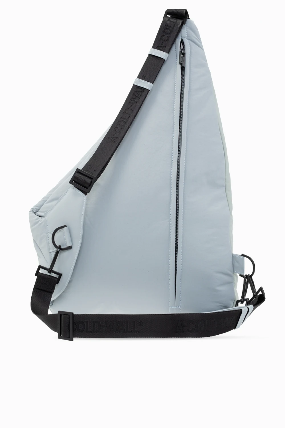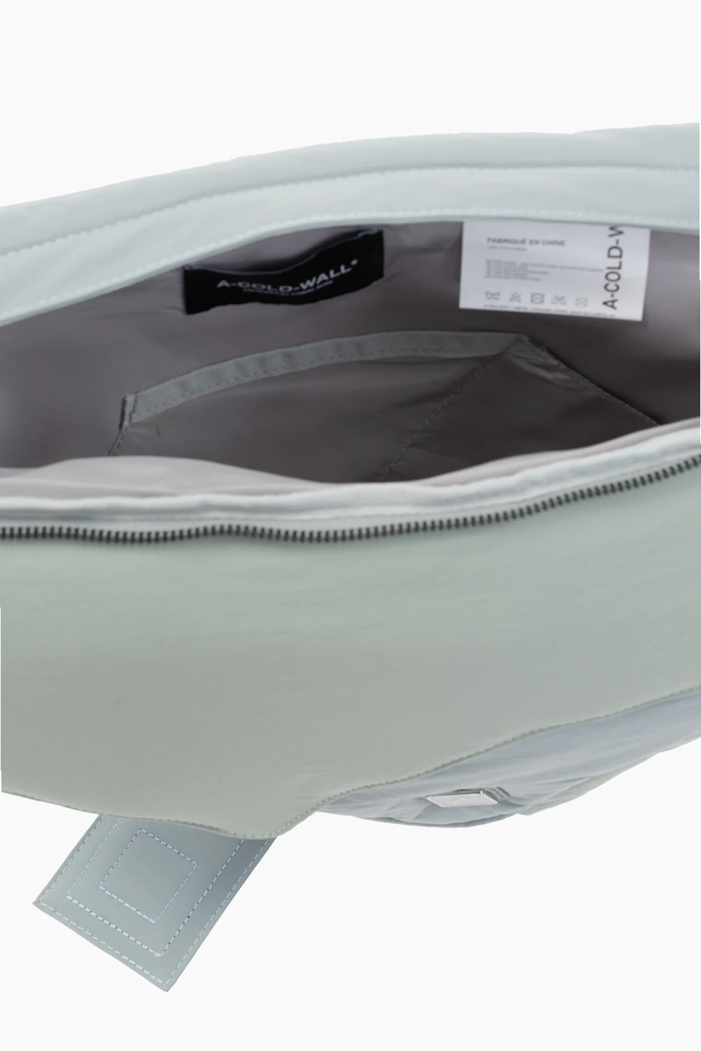 Szary plecak A Cold Wall. Zamykany na zamki i patkę z magnetycznym zatrzaskiem. Ozdobiony wypukłą aplikacją z logo w kolorze szaro-srebrnym. Z przodu kieszeń zamykana na zamek biegnący dookoła. Z tyłu czarne, regulowane szelki i odpinana zawieszka. Wewnątrz dwie komory i wsuwana kieszeń.