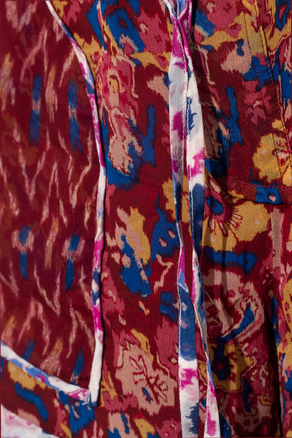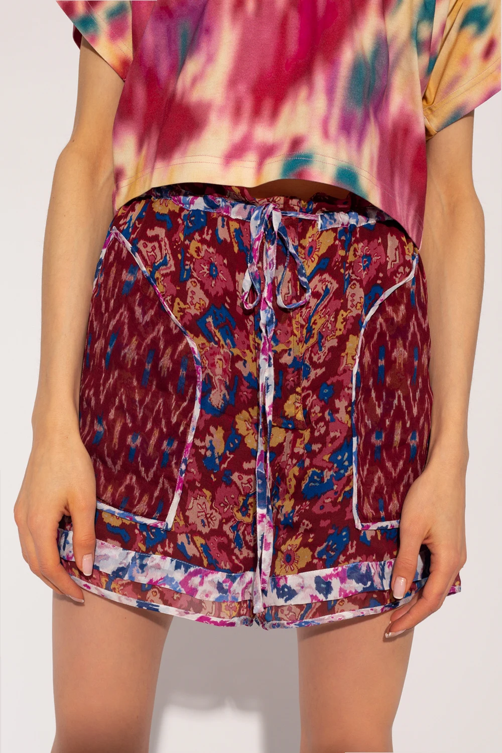 Kolorowe szorty, model ‘Riolmy’ Isabel Marant Étoile. W pasie wszyta elastyczna guma zapinana na zamek oraz wiązana trokami. Ozdobione nadrukowanym wzorem z motywem kwiatowym oraz wzorem ‘Ikat’. Cztery wsuwane kieszenie: dwie z przodu oraz dwie z tyłu.