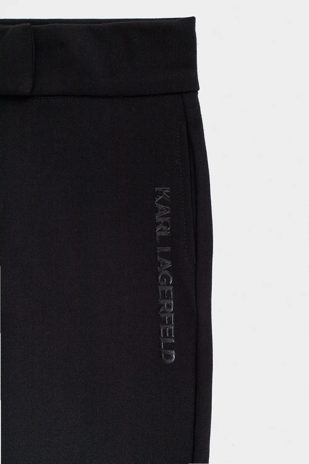 Czarne spodnie Karl Lagerfeld Kids. Wykonane z elastycznego materiału. Zapinane na zamek i zaczep. Ozdobione nadrukowanym logo. Zwężane nogawki z przeszyciami.